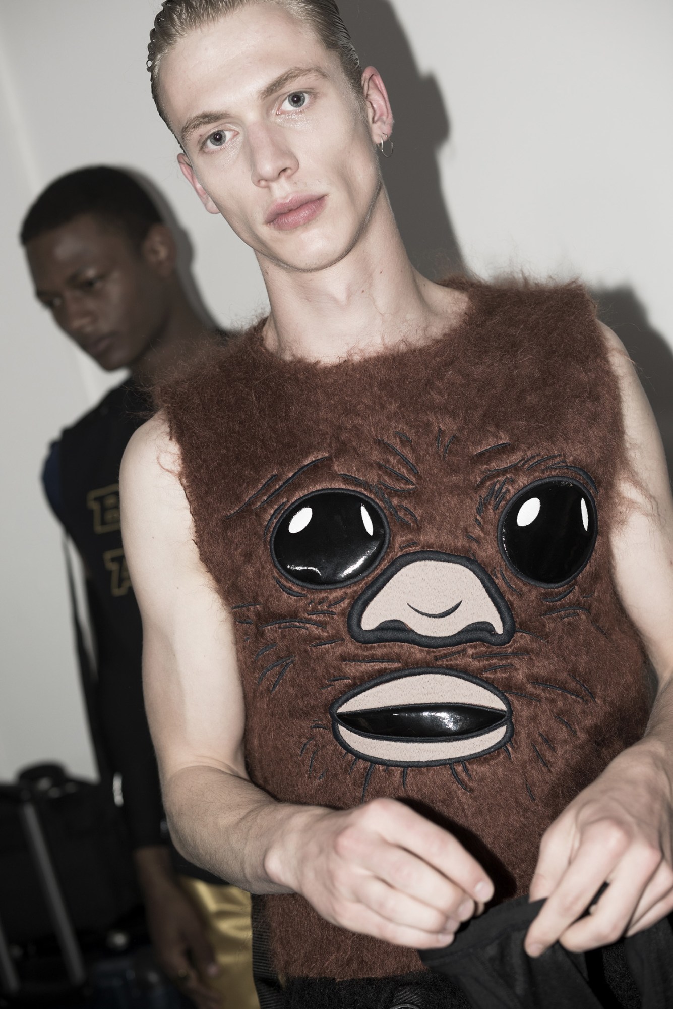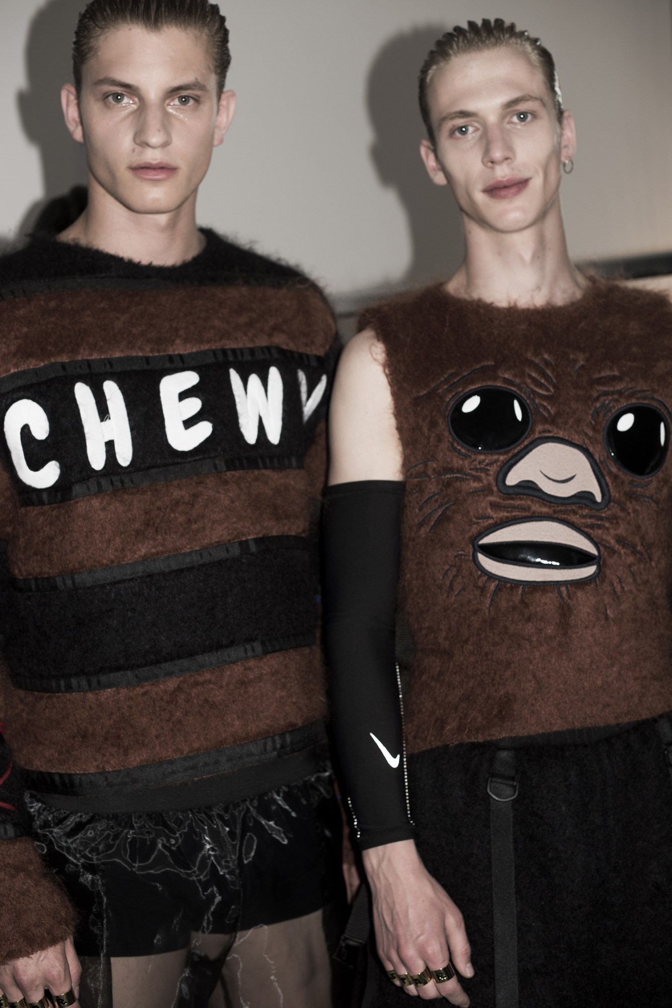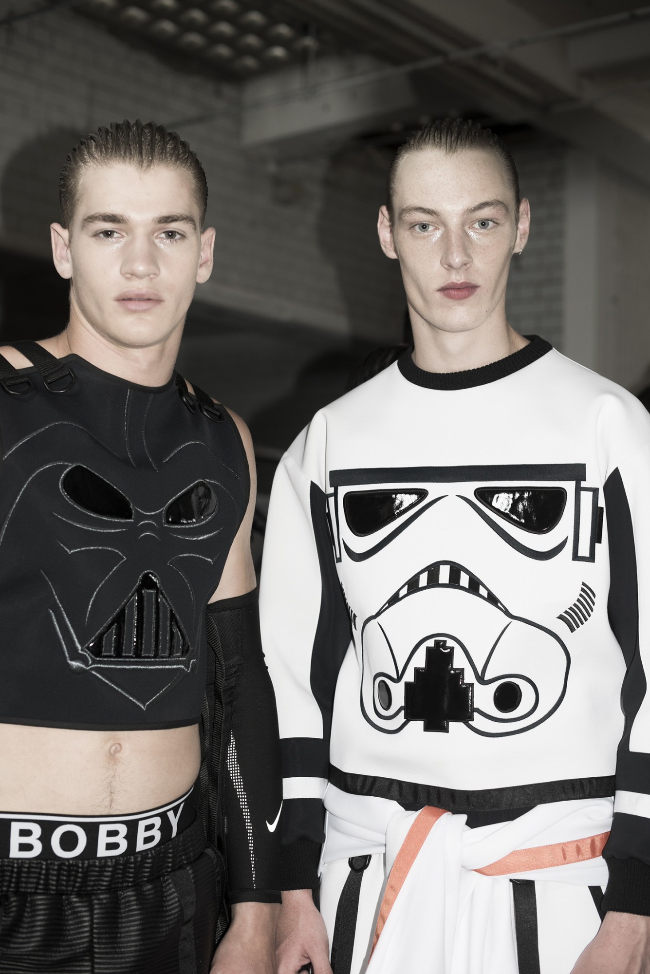 “I was keen to return to some of the ideas in my static autumn/winter 13 presentation but add movement,” he explains. “Doodling in my sketchbook, I just wrote Princess Leia and then Slayer. So the Star Wars theme was born with Princess Slayer!” With his version of Ursula’s grin spreading across the front row, it made perfect sense for the designer to stay in his Disney daydreams and the far, far away galaxies of the franchise provided a wealth of inspiration. Almost too much. “In all honesty, I had a mental and creative block initially because there are so many narratives and characters within Star Wars. Not forgetting the fact you can buy its merchandise anywhere,” he adds. He resolved both potential problems by delving deep inside his imagination. All is not what it seems. Princess Leia is Prince Slayer. C3PO becomes wires. Darth Vader and Storm Troopers become eyes on neoprene sweaters. Playful and uncompromising. London Collections:Men has missed Bobby Abley.