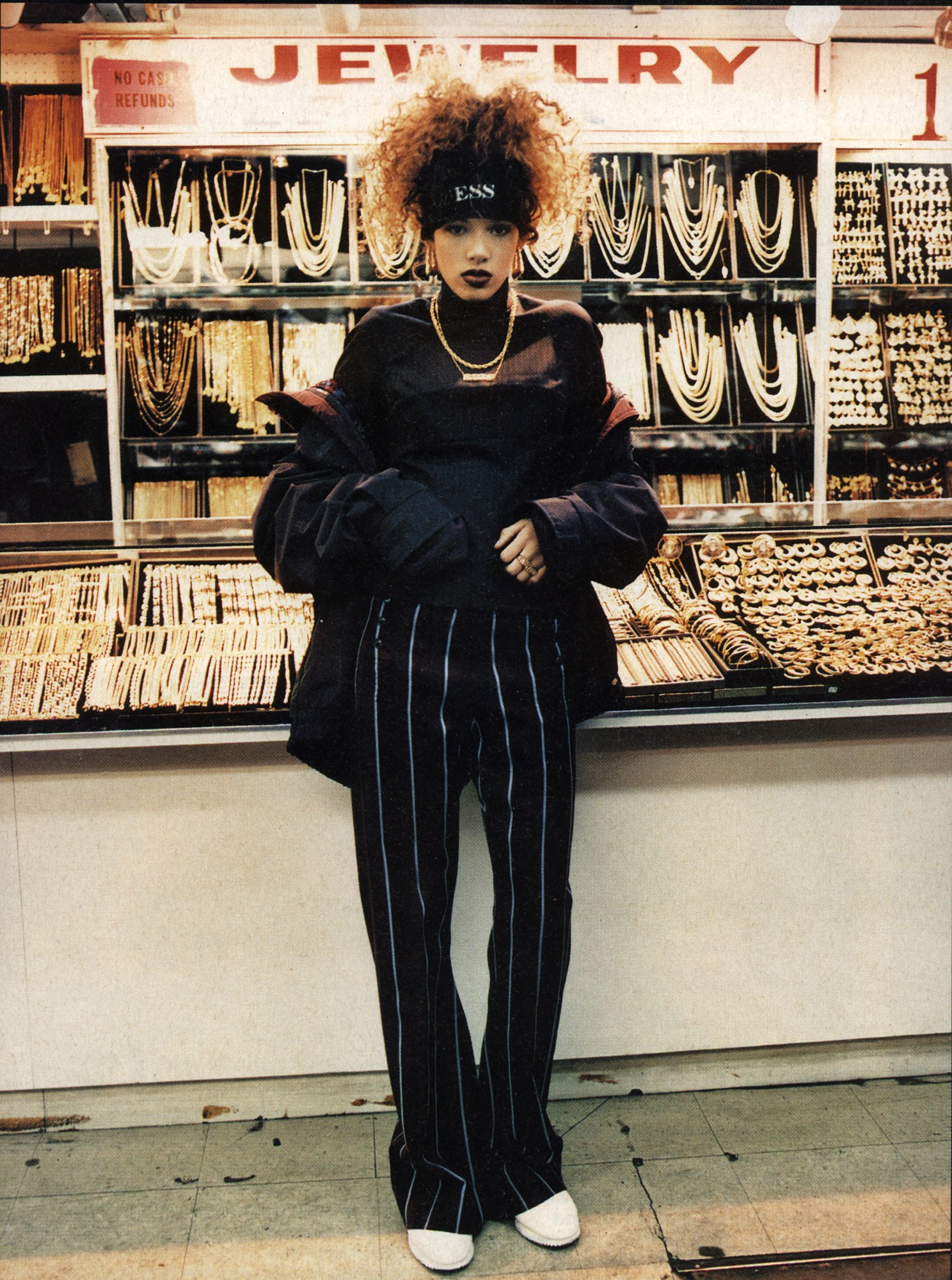 The story paired Comme des Garçons, Yves Saint Laurent, and Gucci with Polo, Guess, and the Gap, big curls, gold chains, door knocker earrings, and most daringly of all: Nike trainers. “i-D wanted to kill some of the pages that had sneakers in them,” Jamil recalls. “You couldn’t get in a club with sneakers on back then, and the fashion world hadn’t embraced sneaker style yet.” But the team won out, the kicks stayed in the picture, and fashion history was made. “We couldn’t afford the stuff that was on the runway,” Sade remembers. “We went thrifting, found it, stacked it, and laid it. If we were able to get designer clothing, maybe we would incorporate one piece and the rest of it was jewellery from Canal Street. We brought style from our neighbourhood.”