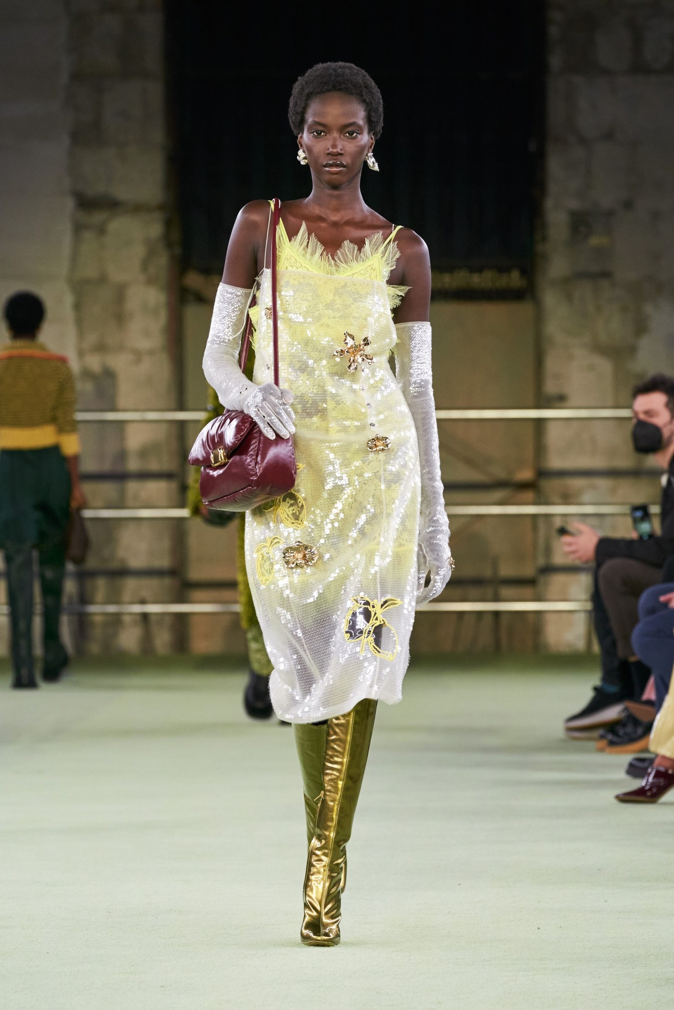 Many of those characters were borrowed from the canon of Italian cinema, and the most striking ones were the women, who Matthieu said are always empowered by sexuality — “even in their nudity”. So, for all the talk about practicality and craft — there was glamour and sensuality on display, too. Thank god. Paired with metallic boots and velvet opera gloves, there were sequined slip dresses with chiffon feathers and even a pair of embroidered nipples on the lingerie-style bustiers — the kind of extravagant dresses that come to life when danced in. Pillowy bags suggested she might be sleeping over. And come to think of it, the shirts and thigh-high boots suggest she already did.