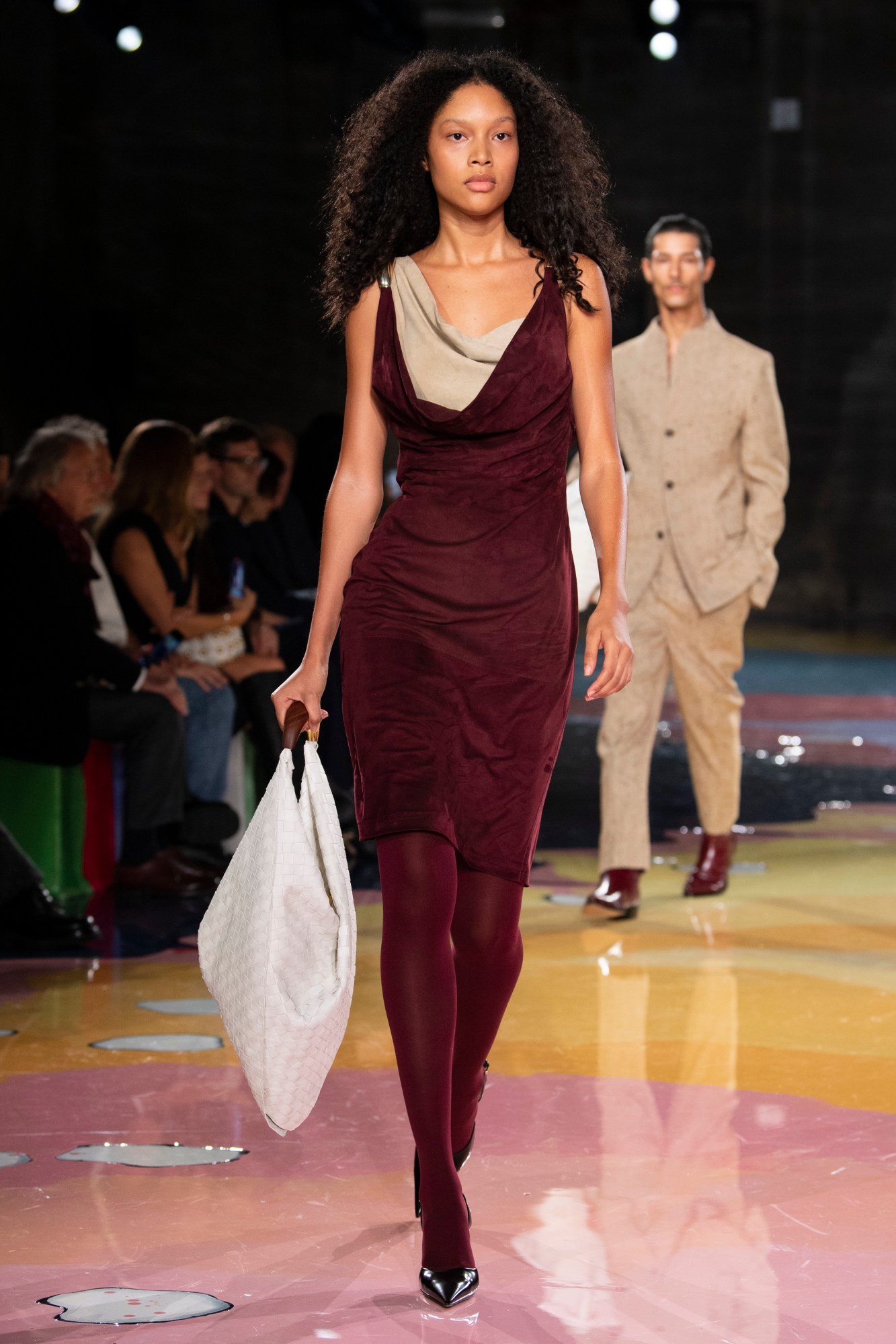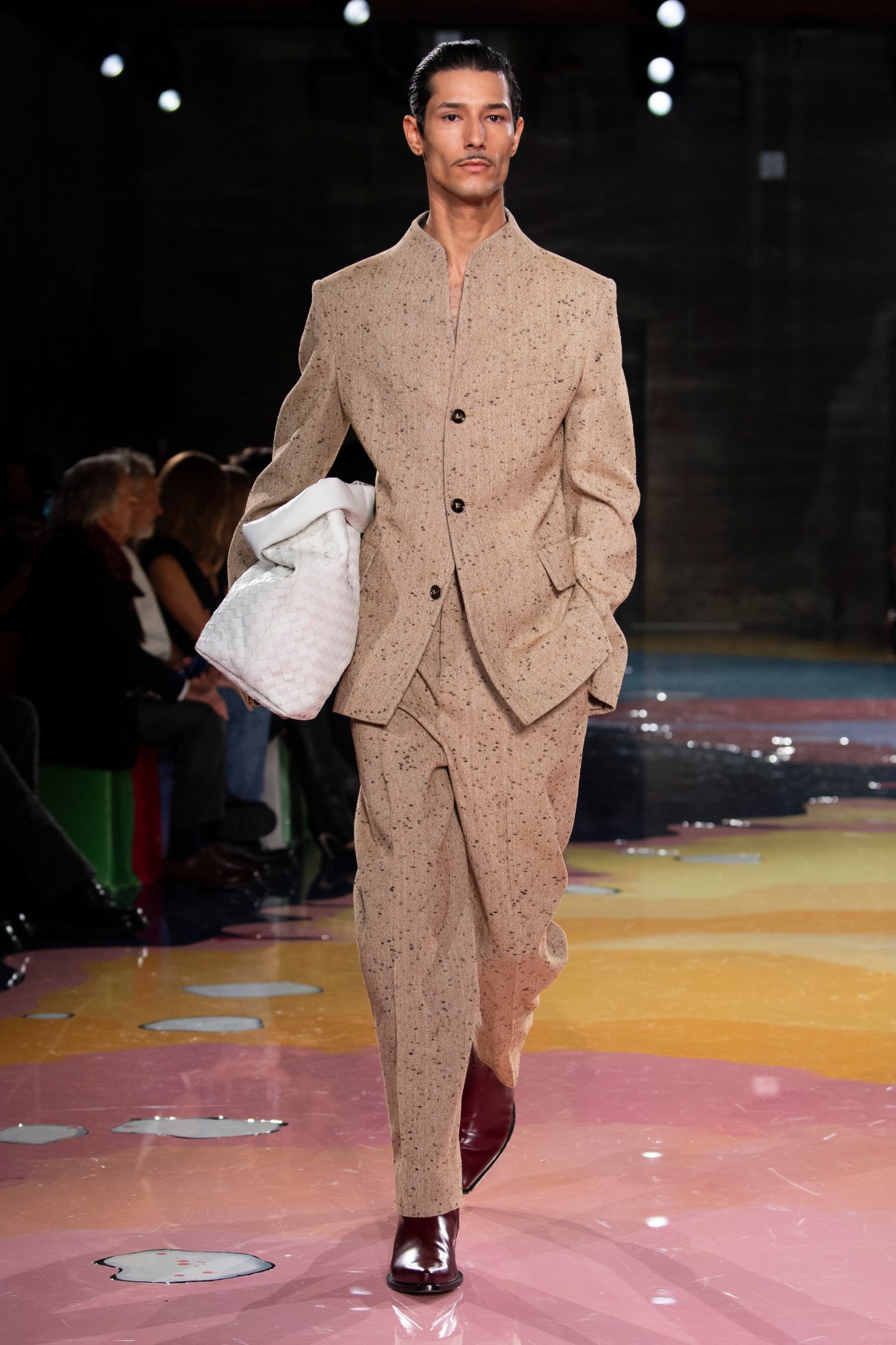 Walking into Bottega Veneta’s show last night, you couldn’t help but smile. Bright, colourful chairs — each one of a kind — lined the poured-resin floor of an otherwise nondescript warehouse. They were the work of 82-year-old Italian designer and architect Gaetano Pesce, who was invited by the fashion house’s creative director, Matthieu Blazy, to provide the backdrop to his sophomore show. But Geatano provided much more than just the chairs and floor. This was a landscape in which the collection could be understood, with an emphasis on mood-lifting, serotonin-boosting swirls of colours, textures and materials. “The world in a small room,” was how Matthiew put it after the show. His collection was therefore centred on an array of characters as unique as each of those chairs, a display of confidence as a designer from someone who has acquired years of experience working for some of the greatest.