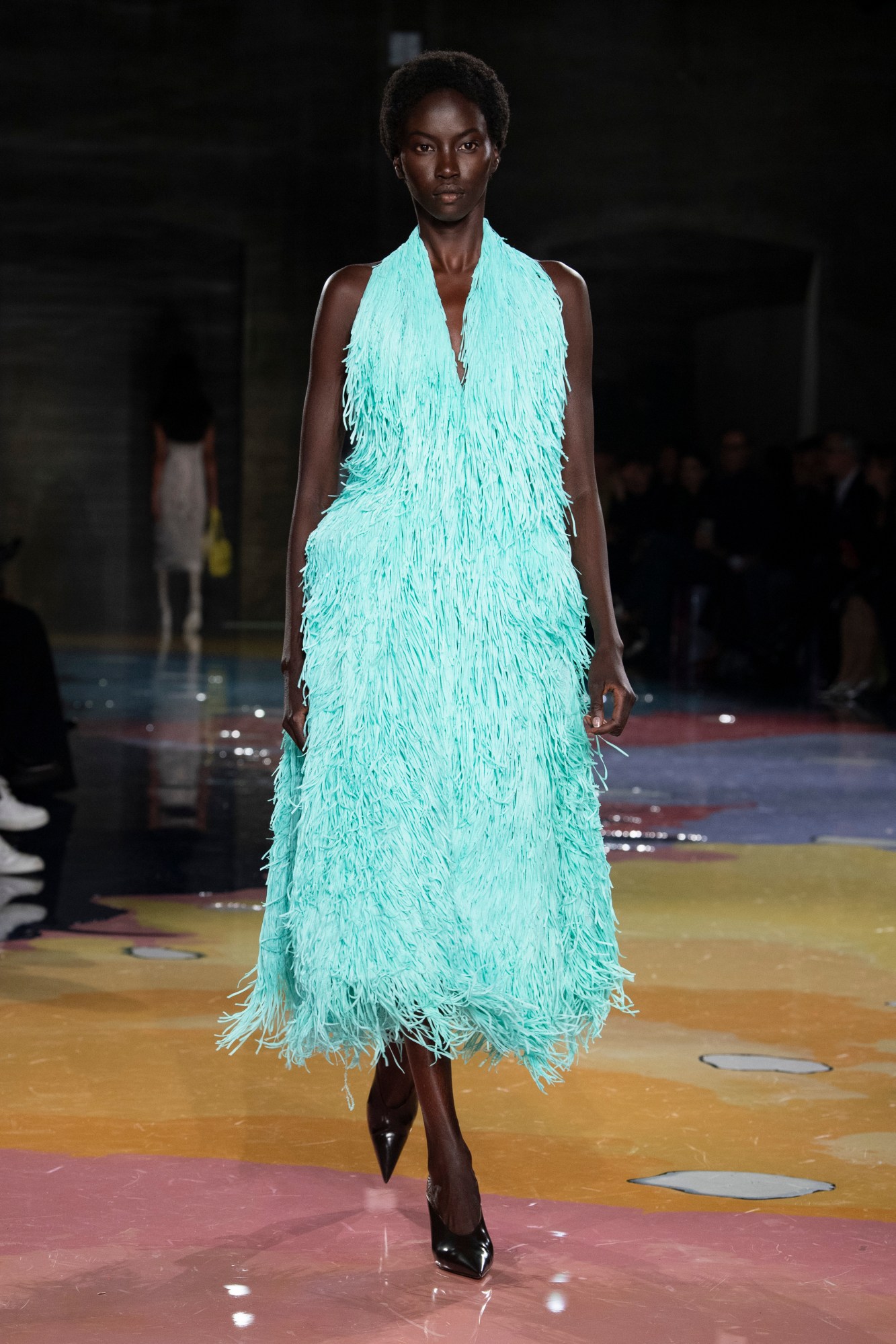 Meanwhile, quieter dressers will relish in the Boccioni-silhouetted tailoring, curving as if in motion at the sleeves and neck, and an array of funnel-neck jackets with Volcano-like necklines and subtly exaggerated cuffs for rolling up. And to finish, a heavenly trio of calf-skimming dresses in tomato-red, limoncello and aquamarine — colours to match the Gaetano Pesce furniture — that elicited a symphony of sighs as they swished by. Entirely knitted, with the fringe integrated into the weave, they’re a technical masterpiece that makes you swoon for all the right reasons.