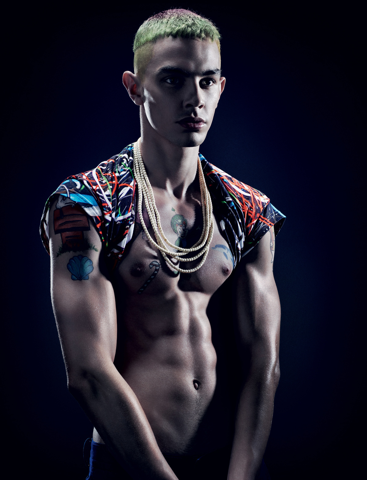 FotografieAlasdair McLellan.Styling Olivier Rizzo.Reid draagt broek vanRaf Simons; hoed vanYohji Yamamoto; ketting met leer vanWalter Van Beirendonck; ketting van model zelf.[The Masculine Issue, no. 251]