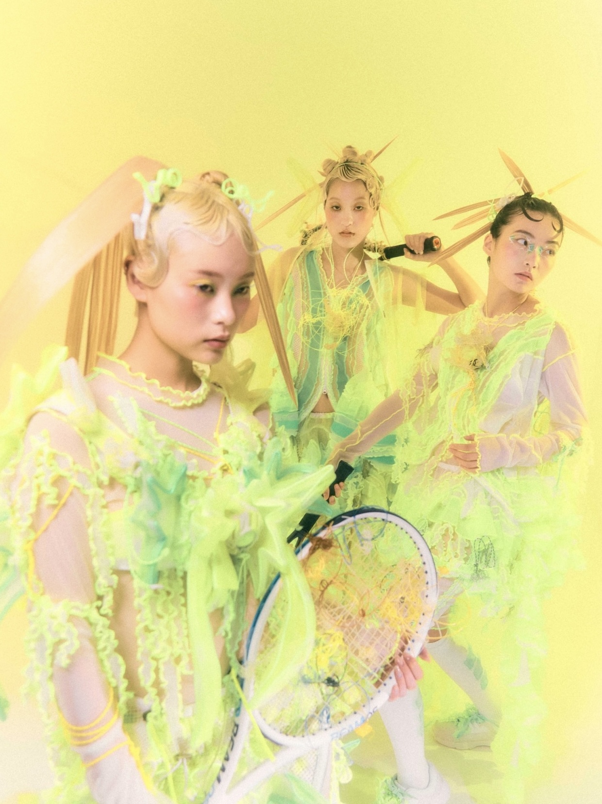 That same fearlessness ran through this year’s graduating MA class. Three designers stood out. Rikia Ishida staged a dialogue between subcultures, splicing punk sensibility with 17th-century romance—tartan clashing with powdered silhouettes. Wakana Hamabe pushed leather and corsetry into the realm of streetwear, producing silhouettes that felt equal parts armor and attitude. Karin Tsujino went full neon dystopia, layering mesh and ruffles in highlighter tones, carved into warped proportions where transparency revealed and concealed at once.