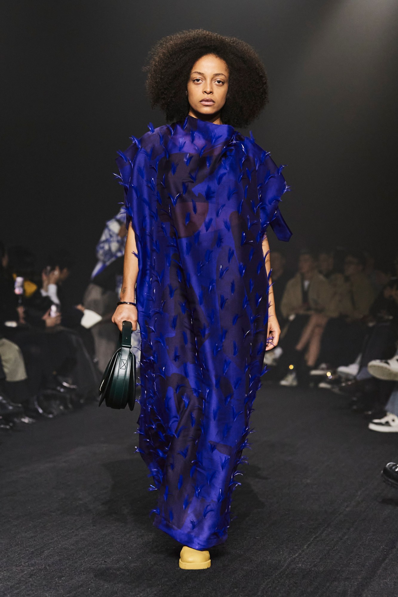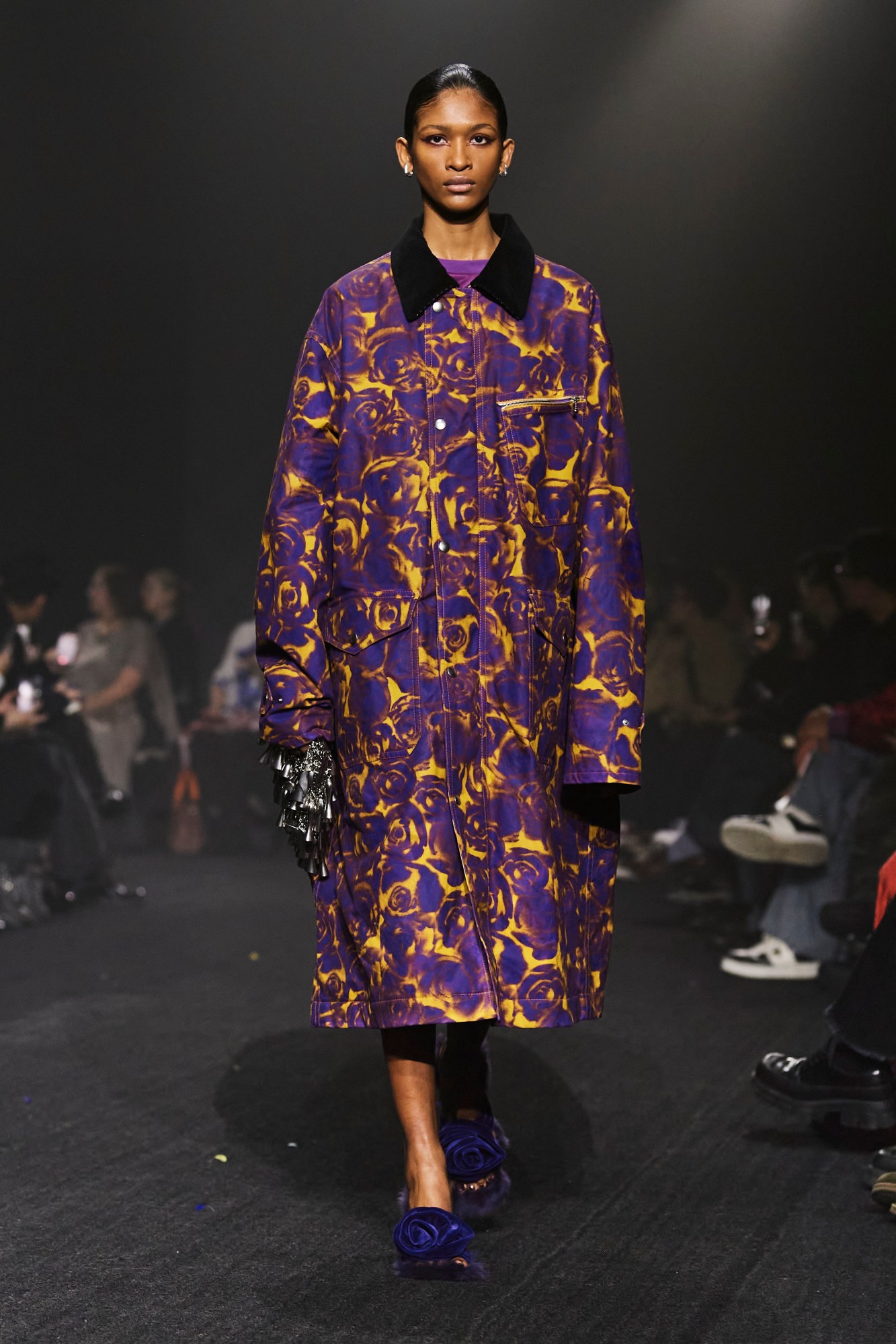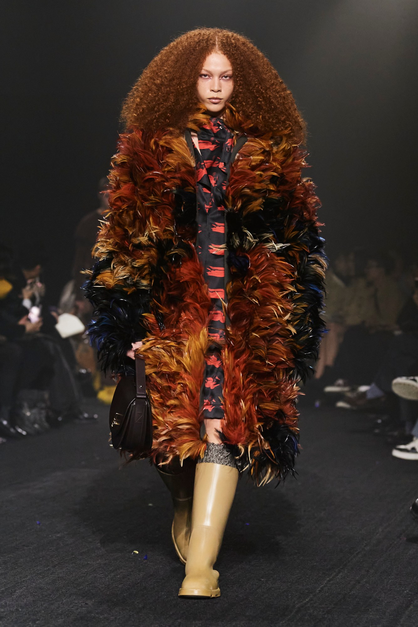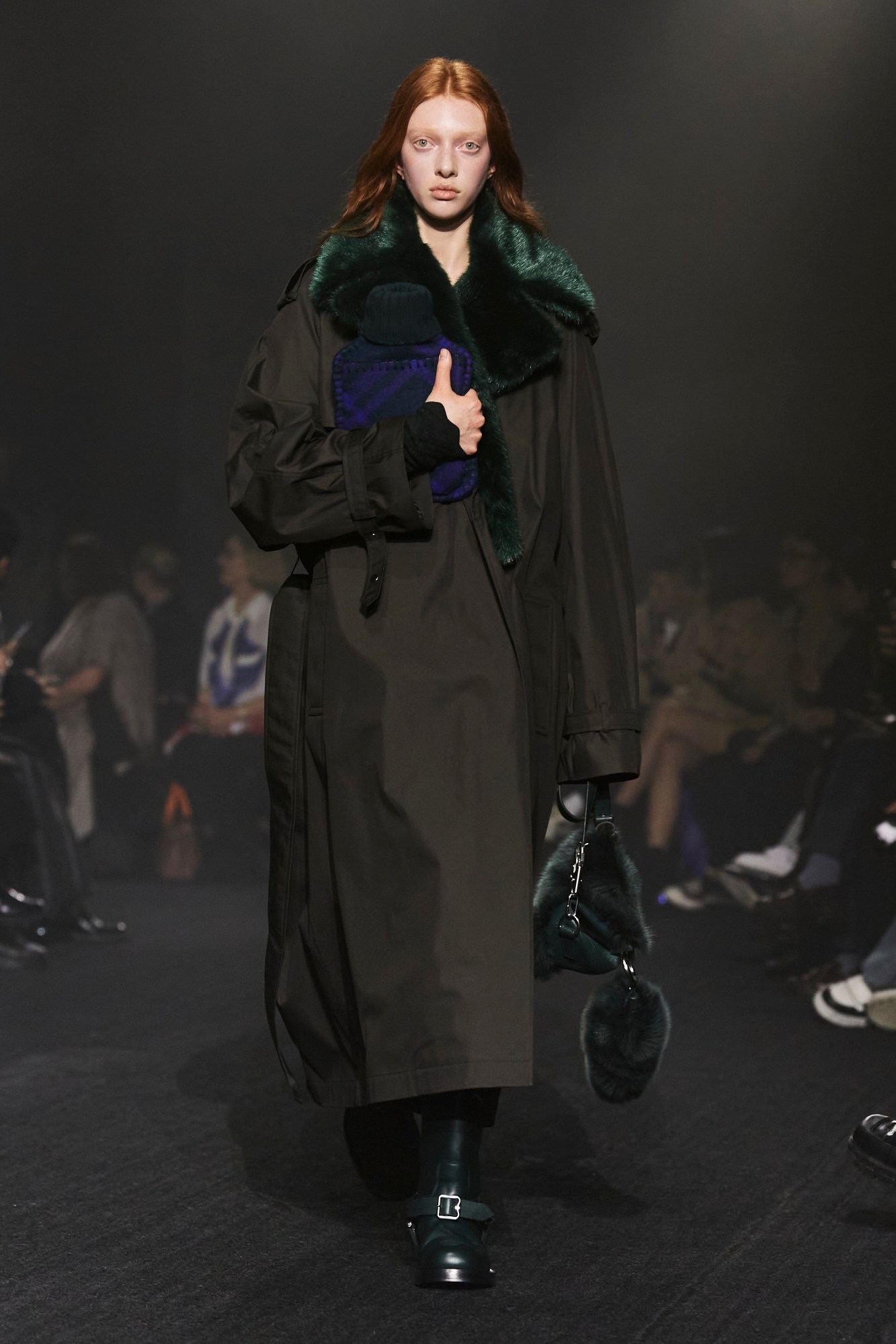 So there were no beige trenches on show. In fact no beige at all. The two opening looks were the closest we came to those quintessential Burberry staples, floor-length in darkest green with emerald faux fur collars, accessorised with a hot water bottle clutched closely to the chest. That famous check was exploded, repurposed into prints in bright yellows, royal purples, countryside burgundies. It serves as a reminder that Daniel was a masterful colourist at Bottega – that ubiquitous parrot green! – as well as a stellar accessories hit-maker; remember the plastic puddle boots and blown up intreccio bags.