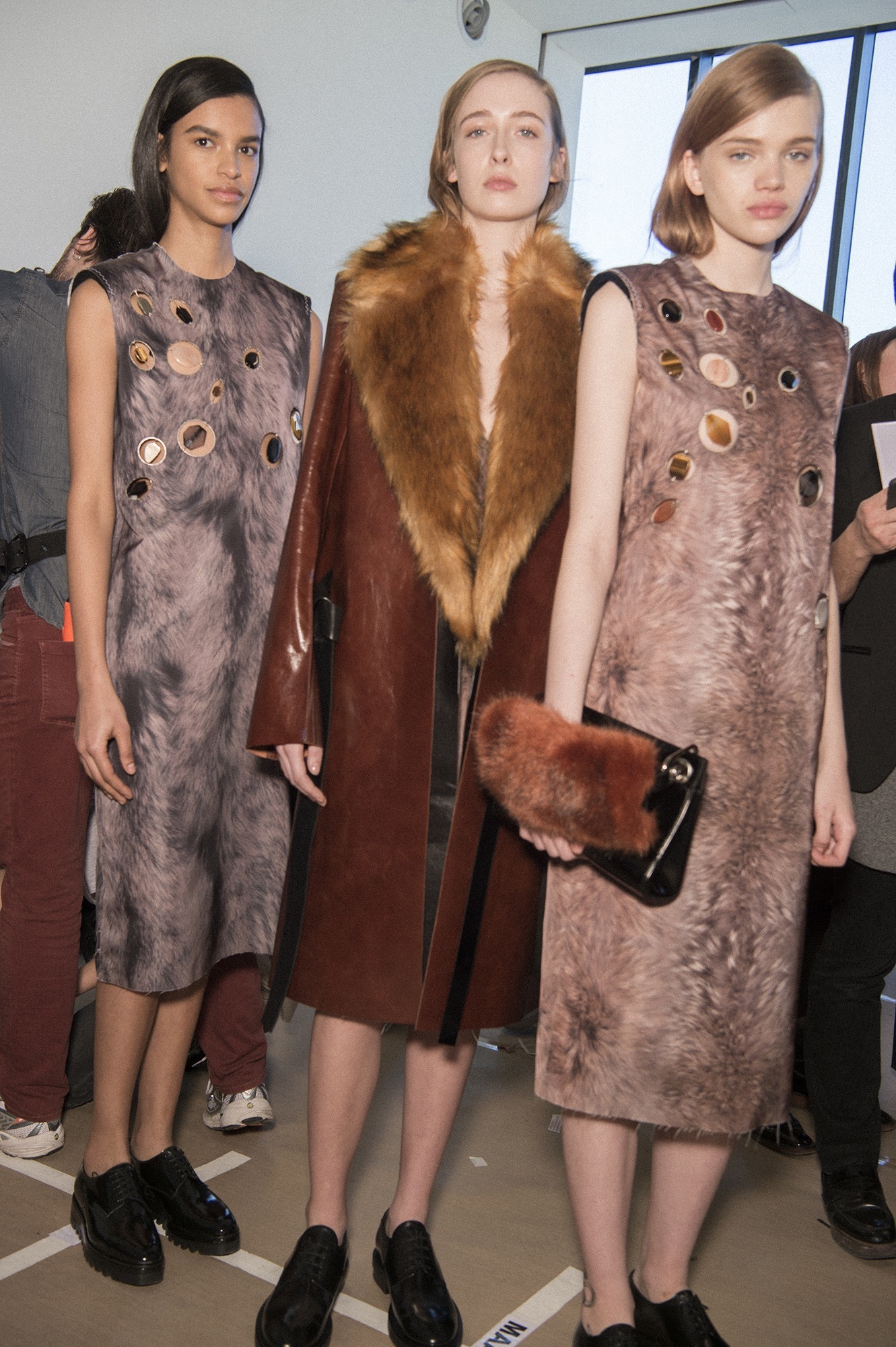 Plaids varied in color and scale; they met each other on loose trousers, skirts with bold side slits, and tailored wool outerwear. Belted shift dresses were easy and chic. Costa got a bit more experimental with the animal series, which followed an offering of sharp, structural leather pieces and black masculine looks. One highlight of the photo prints: the white and brown flecked long-sleeve dress modeled by Lexi Bolling.