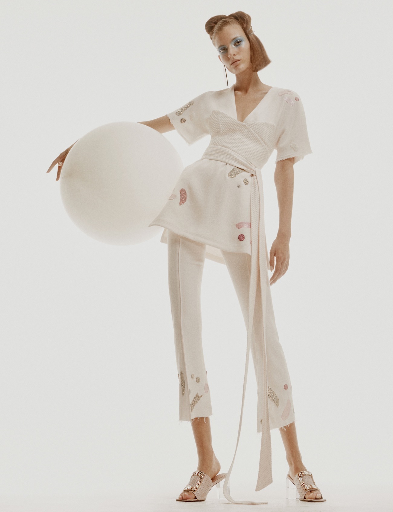 This morning at The Standard Hotel, Area staged a spring/summer 16 presentation that looked a little like its attending editors’ pre-show routines. “It’s really about the process of getting ready and makeup application,” Beckett Fogg, the Kentucky-born half of the New York-based design duo said. Except the intimate presentation wasn’t anywhere close to the slap-on-foundation-and-sprint-to-the-subway schpiel a few of us are probably (definitely) familiar with. The girls’ slow, sultry strides past mirrors, sculptural perfume bottles, and giant spherical balloons evoked a certain air of 70s glam, and — as Polish-Dutch designer Piotrek Panszczyk conceded — just the right amount of narcissism.