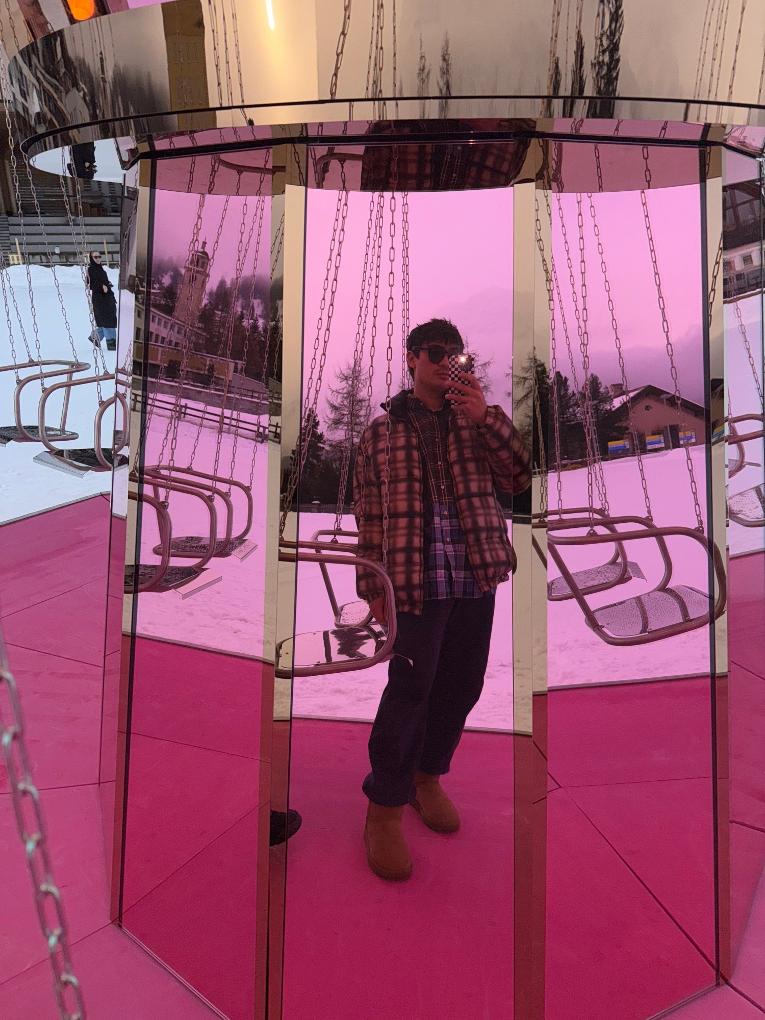 We meet in a quiet corner of the Grand Restaurant at the Kulm Hotel. The relative silence matters to Carsten Höller. Music bothers him. Not aesthetically, but physically. He hears too much. He’s always listening. Between the clink of cutlery and the upholstered hush of alpine luxury, it becomes clear this is a man calibrated to frequencies most of us tune out. Outside, in the middle of the ice rink, the artist’s latest installation for the Kulm—Pink Mirror Carousel—turns slowly. Its surface reflects skaters, snow, mountains, and the choreography of leisure back at itself. It looks like a jewel dropped from another planet, or a thought experiment rendered in steel. Beautiful, slightly awkward, impossible to ignore.