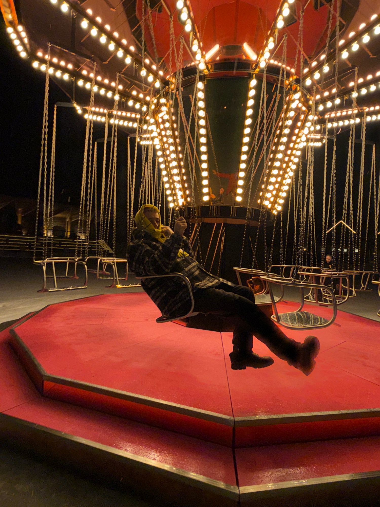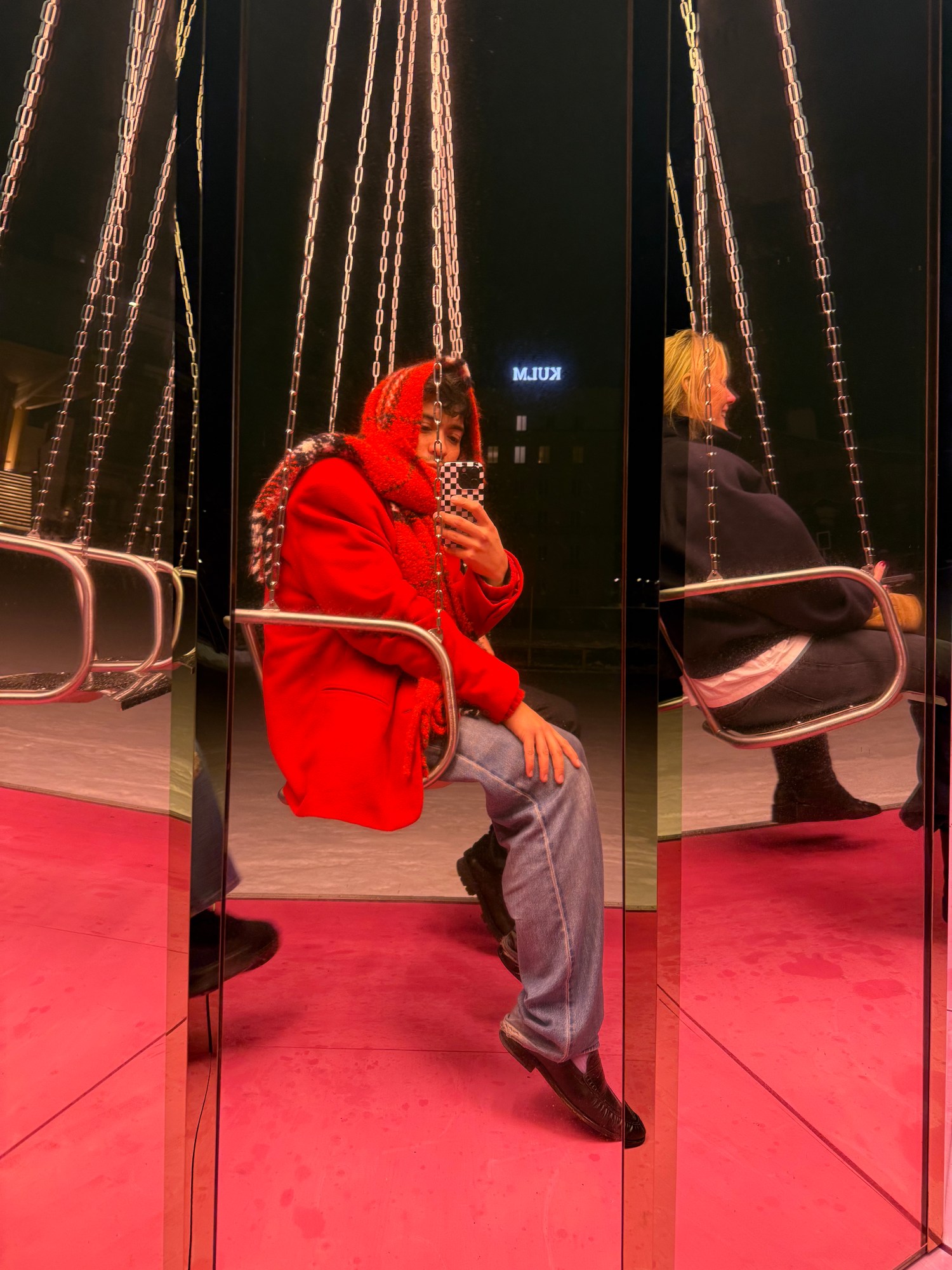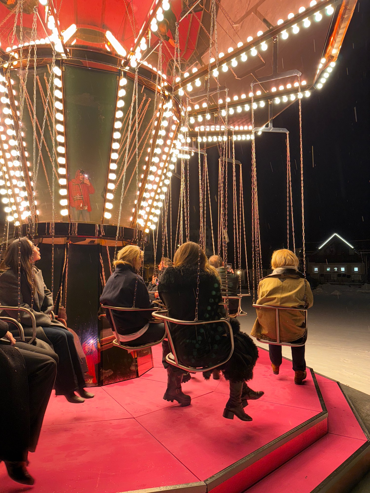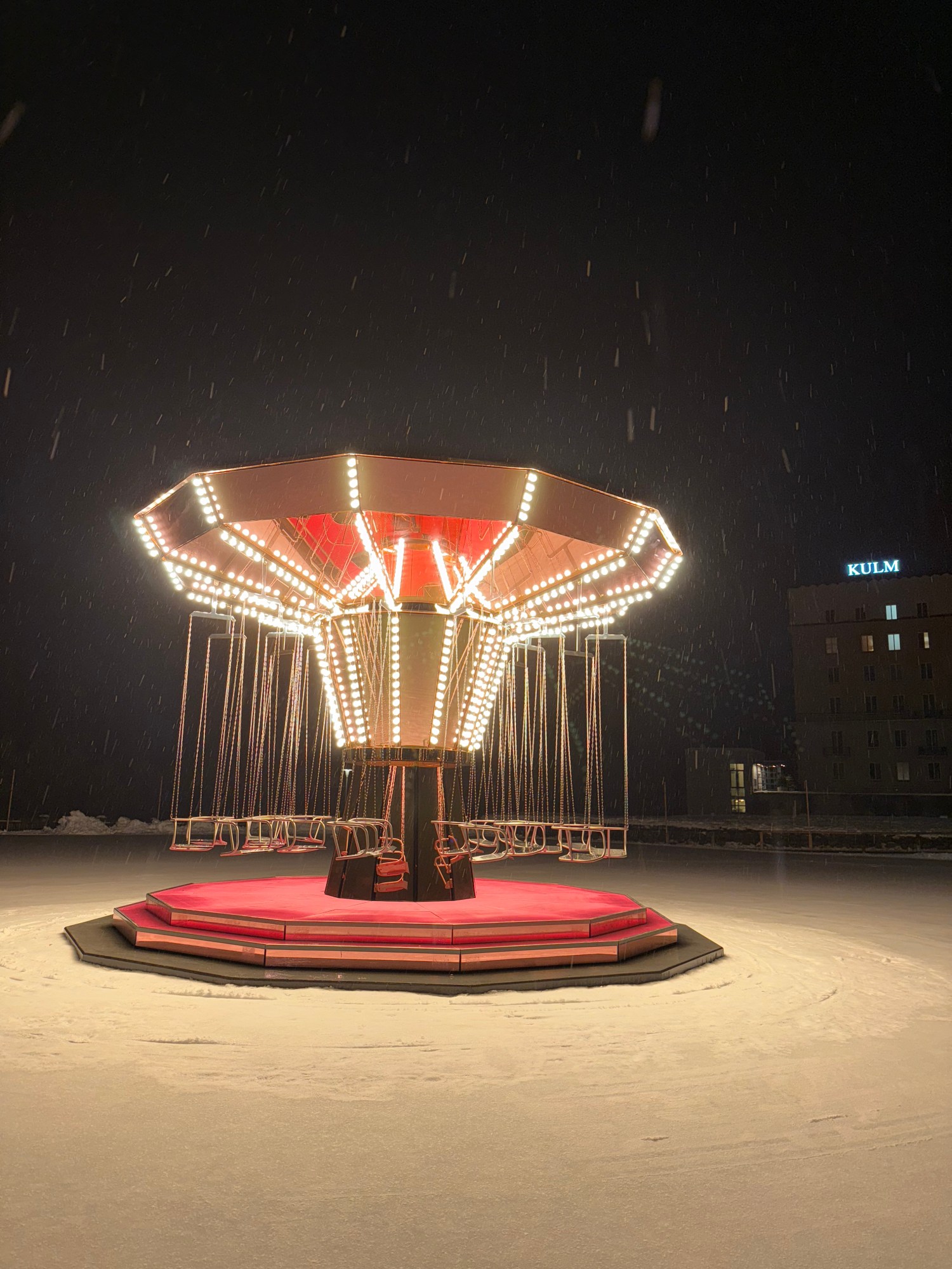 Skaters already move in circles. I liked the idea that some people sit down and rotate slowly while others rush past. It’s beautiful. And it will be here in summer too, surrounded by green and blue instead of white. At night it feels almost alien.