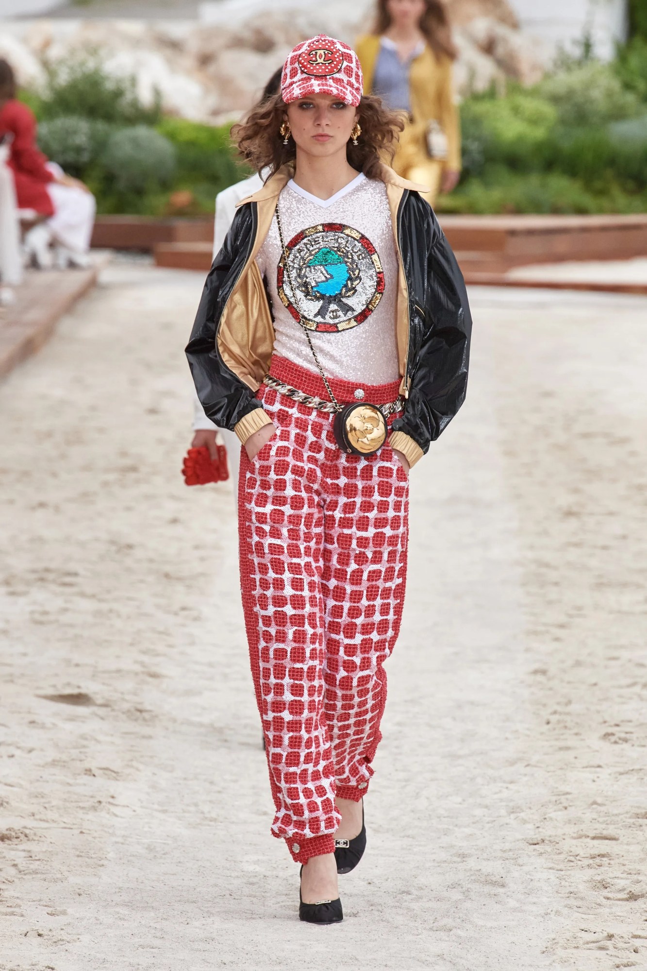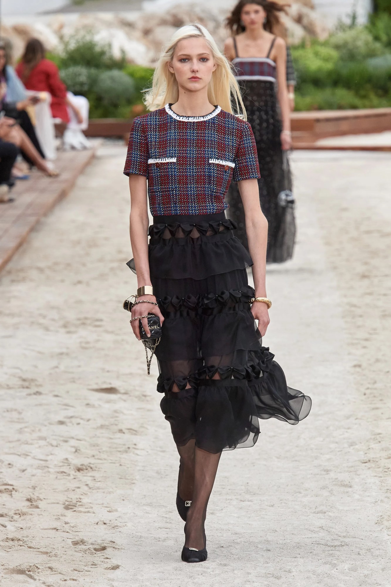 The show opened with Grand Prix racing flag checks on diaphanous chiffon dresses and bouclé mechanic overalls (not unlike RuPaul in the opening sequence to Drag Race, or that scene in Charlie’s Angels); as well as Senna-style baseball caps, Formula 1 superfan T-shirts and MOTOMAMI biker jackets. There were also a plethora of novelty accessories – from Casino slot machine purses and helmet handbags, to decks of cards, Lilliputian-sized bags dangling from chain necklaces and ropes of pearls. There was also gold, of course, in the form of leather trousers and lamé-lined tweed jackets (because everything comes gilded in Monaco) and sporty white tennis sets, worn with rackets and trainers and bandeaus under tweeds. Striped cotton shirting, the kind you might throw over a bikini as the evenings draw in on holiday, came with Lagerfeldian high white collars and bouquets of sequinned flower plastrons – the intricate handiwork of the Lesage ateliers.