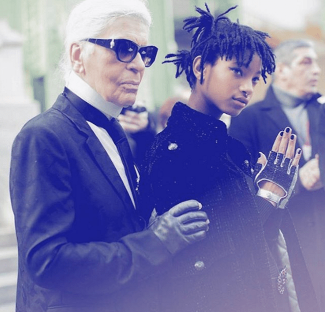 “Thank you Karl Lagerfeld and the entire team at Chanel for expanding the perceptions of ‘beauty’ by picking me to be the new Chanel ambassador. I am honored,” Willow posted on Instagram, accompanied by a photograph of herself and Lagerfeld taken after the brand’s fall/winter 16 show this afternoon in Paris. She also posted a BTS shot with longtime pal Kendall Jenner, who walked for the house. A first post, hashtagged “#frontrowonly” saw Willow sporting a pair of Chanel’s cap-toed boots and her own pair of fingerless gloves, already a serious match for Lagerfeld’s signature look.