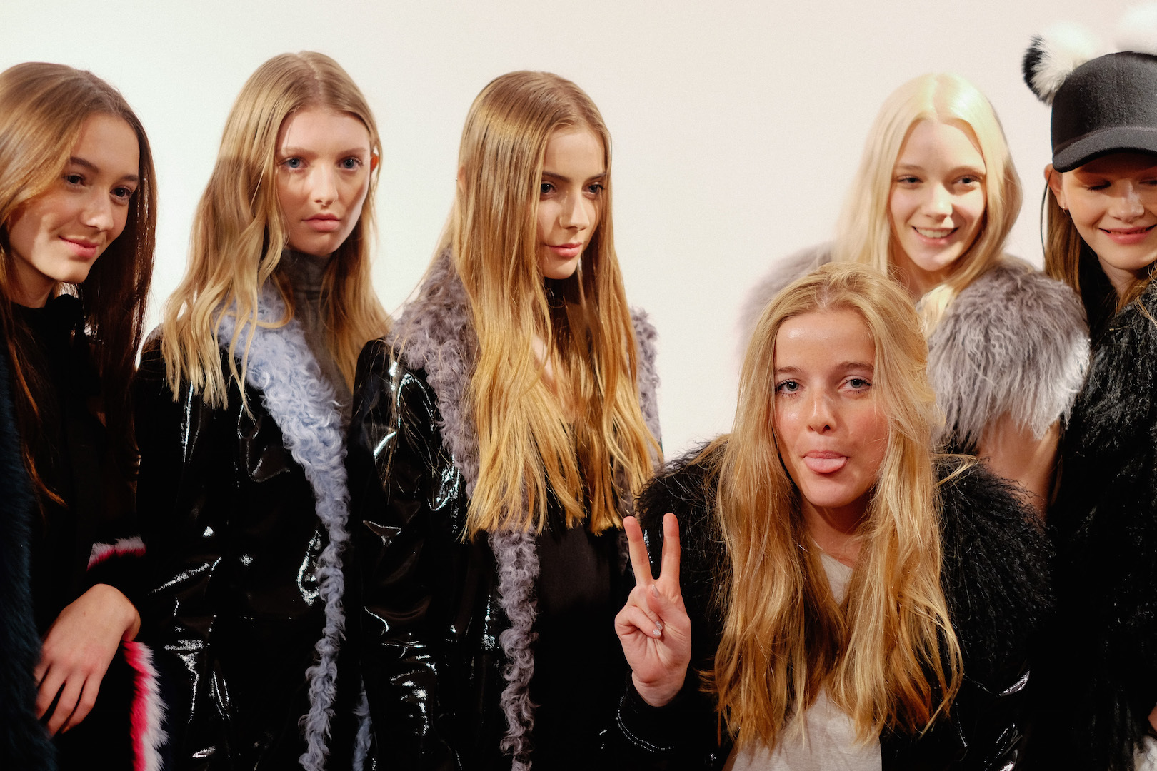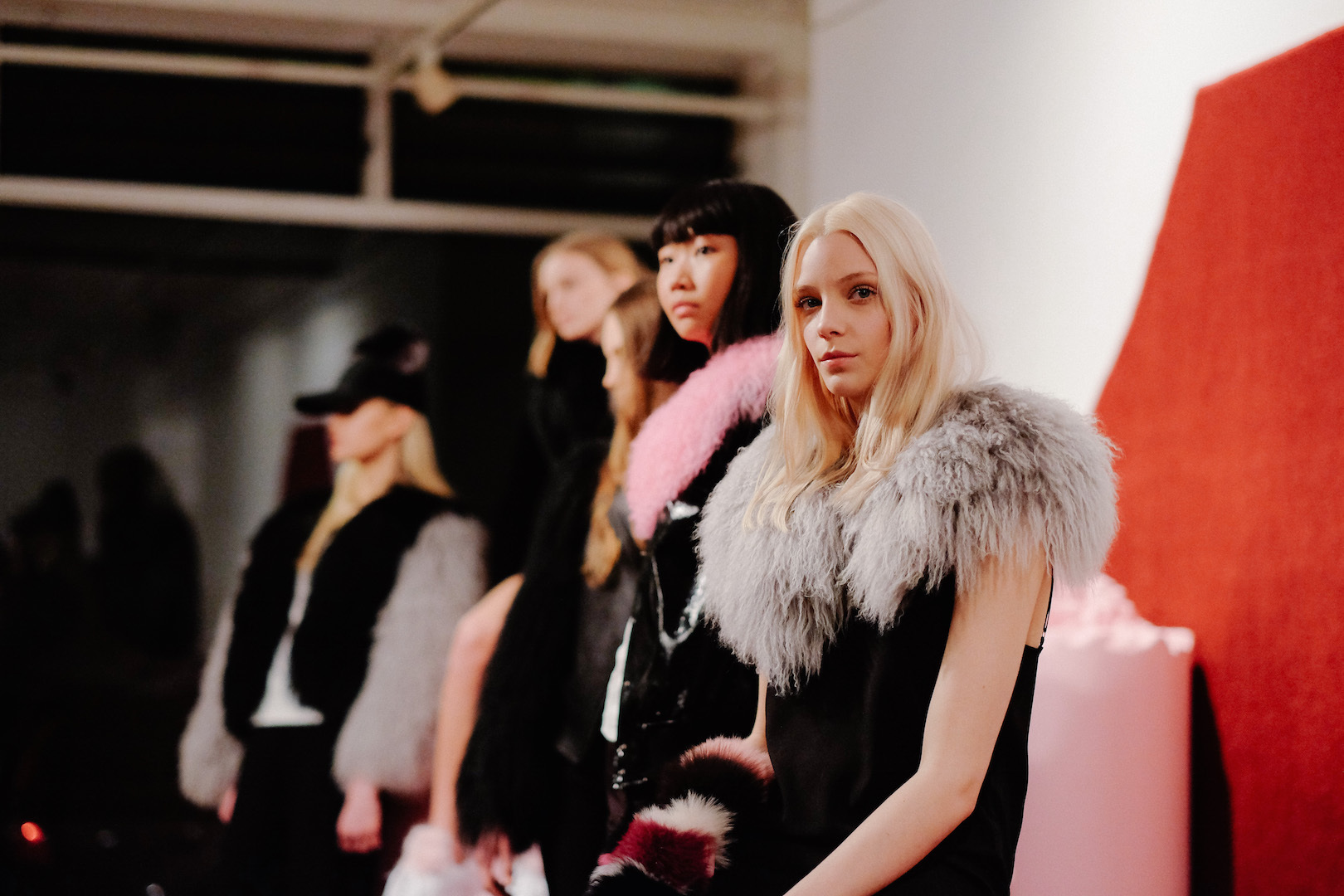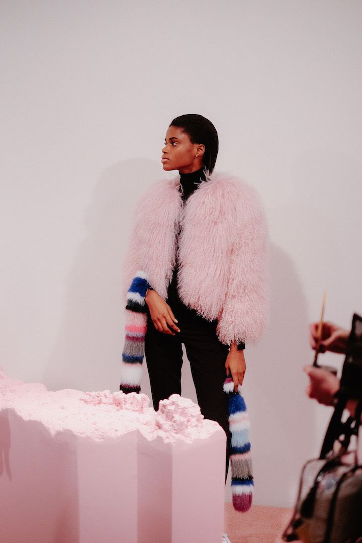 I wanted the set to be textural, with a roughness and a gloss… smooth carpets, fluffy scarves and rocky edges all for the eyes to enjoy. It was important for me that the girls look like a unified gang of cool London ladies and the set drew attention to all the textures of the new season, the sheen of the PVC and all things fluffy.