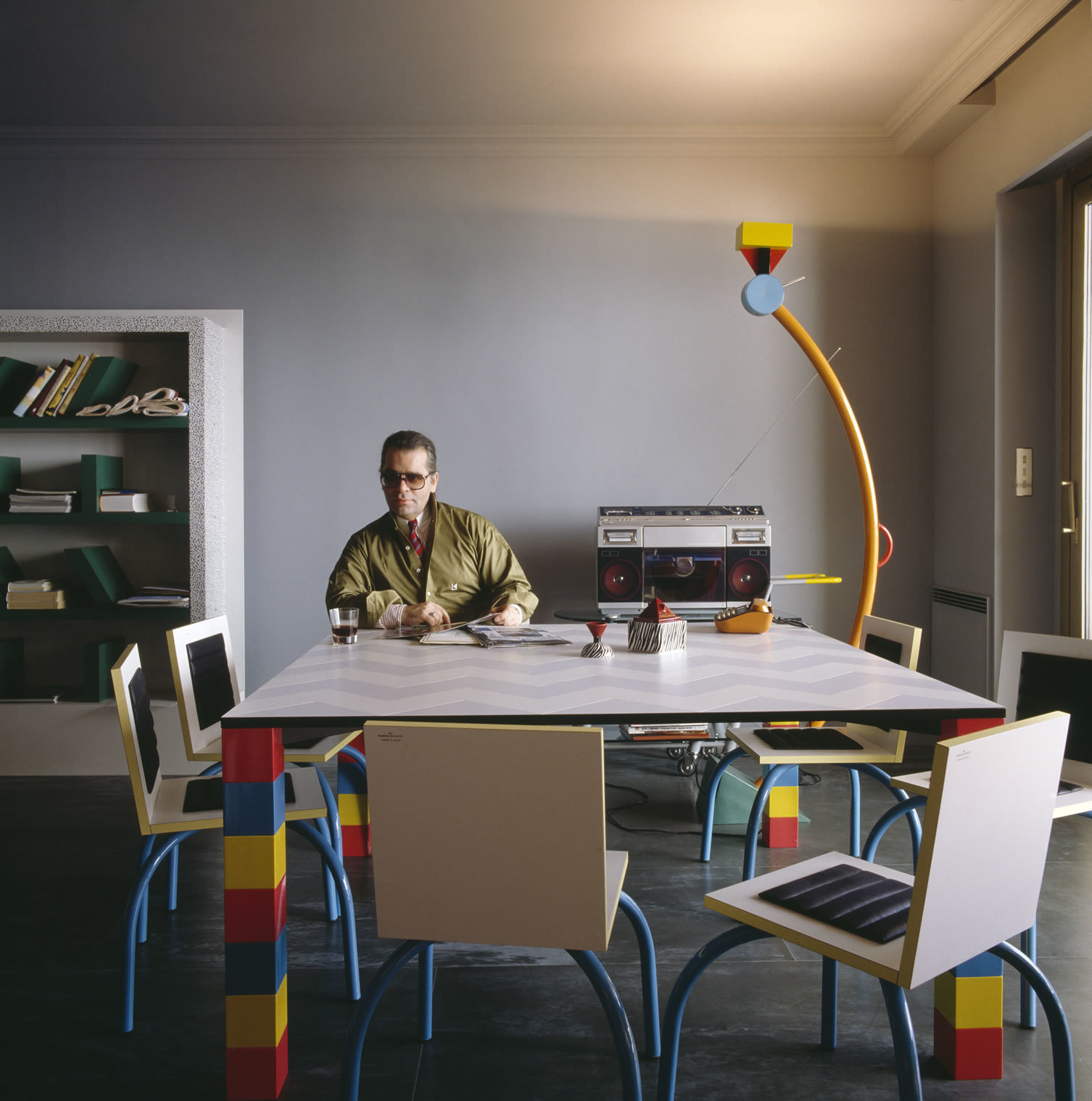 Though the collective disbanded in 1991 (Sottsass himself left the group in 1985), its unique approach to design has been influential across many creative fields. Fashion loves a Memphis moment: Dior’s fall/winter 2011 collection — designed by Bill Gaytten and Susanna Venegas in the interim between John Galliano and Raf Simons — played with the group’s penchant for slick textures and black-and-white graphic patterns. Fellow countryman Angela Missoni drew inspiration from the Milanese movement more recently, for fall/winter 15, when she presented a series of asymmetrical knits layered over printed leggings. But perhaps fashion’s biggest Memphis fan is (or, rather, was) none other than Karl Lagerfeld, who made a veritable shrine out of his Monaco apartment in the early 80s. Sotheby’s auctioned off the Kaiser’s vast collection back in 1991. But Memphis’s influence isn’t simply felt on the runway, or in the private palaces of fashion’s elite. Sottsass frequently collaborated with Esprit, the community-driven, colorful, and — thanks to a recent Opening Ceremony collaboration — certifiably cult brand. Most memorably, he masterminded its store design. More recently, American Apparel enlisted Julia Cumming and Michael Bailey Gates to model its collaboration with Memphis member Nathalie Du Pasquier.
