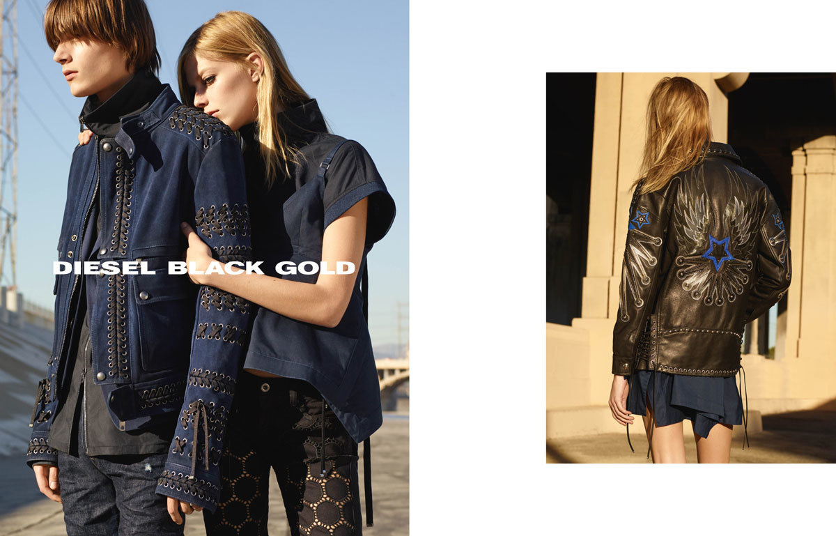 Recognise that big concrete backdrop? That’s probably because it’s appeared in every Los Angeles-based movie and music video you can think of (Grease, Drive, Pharrell’s Happy to name a few), and it’s where Diesel Black Gold’s Creative Director Andreas Melbostad decided to shoot his spring/summer 16 campaign. Starring Lexi Boling and Timur Muharemovic at the Sixth Street Viaduct, the sun-drenched images were shot by French photographer, Karim Sadli.
