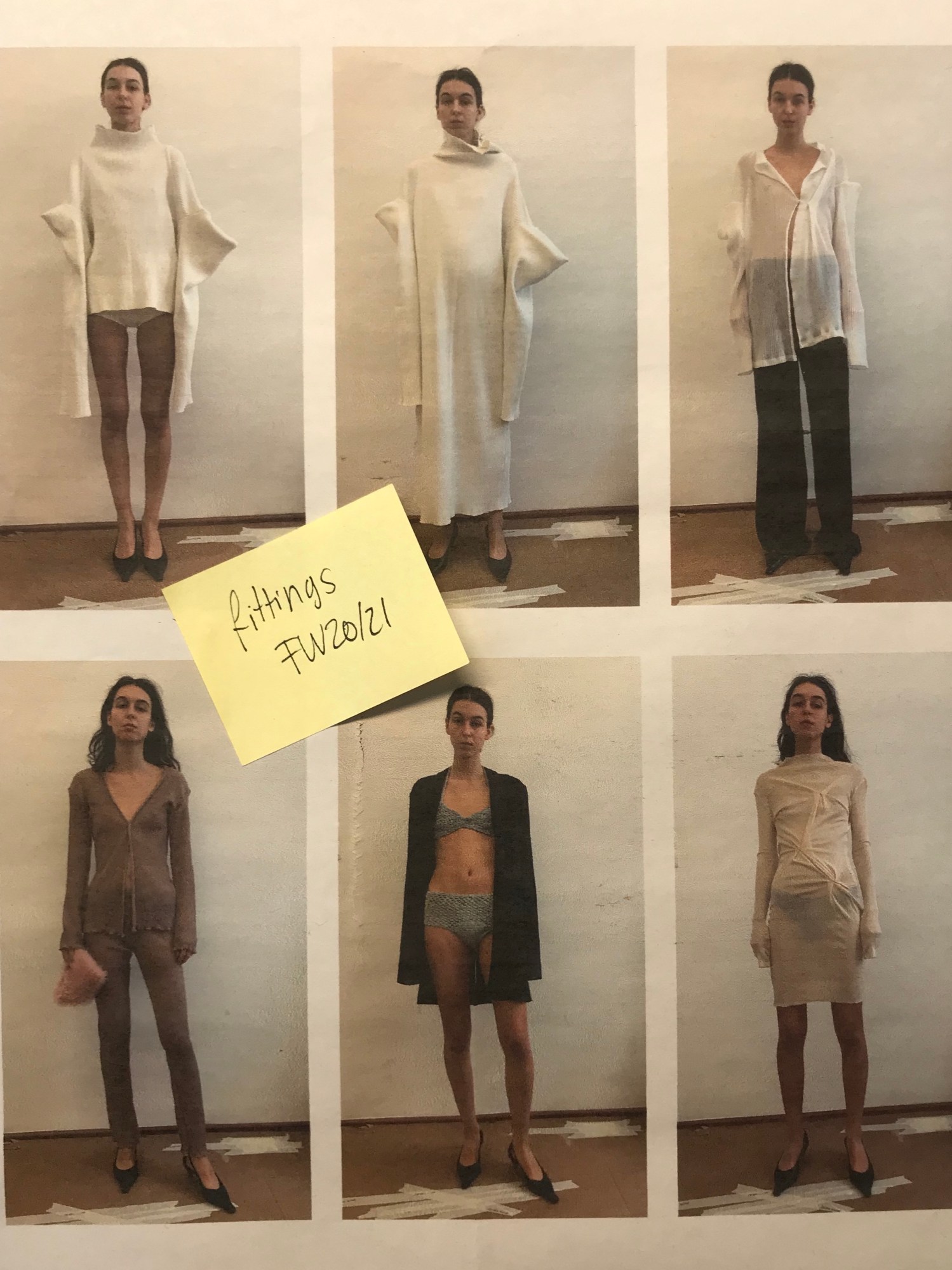 Once the visuals and the casting were finalized, WeTransfer links (for styling and make-up looks) and mailing packages (containing the physical garments and set pieces) were sent off to the models, who would be responsible for shooting their own portion of the video presentation. In order to show off the garments, Seewald and Bravo provided some filming direction. But the rest was up to the models, themselves. “It’s a new way of doing a runway and it left the girls with a bit more freedom. Since they were in their own spaces, each girl shot [their short film] a bit differently.” To create their own at-home sets, each model was provided with Seewald’s signature newsprint paper and tape, which was to be plastered onto their apartment walls as a backdrop. “It’s something very simple, but it’s individual to each girl,” Seewald explains.