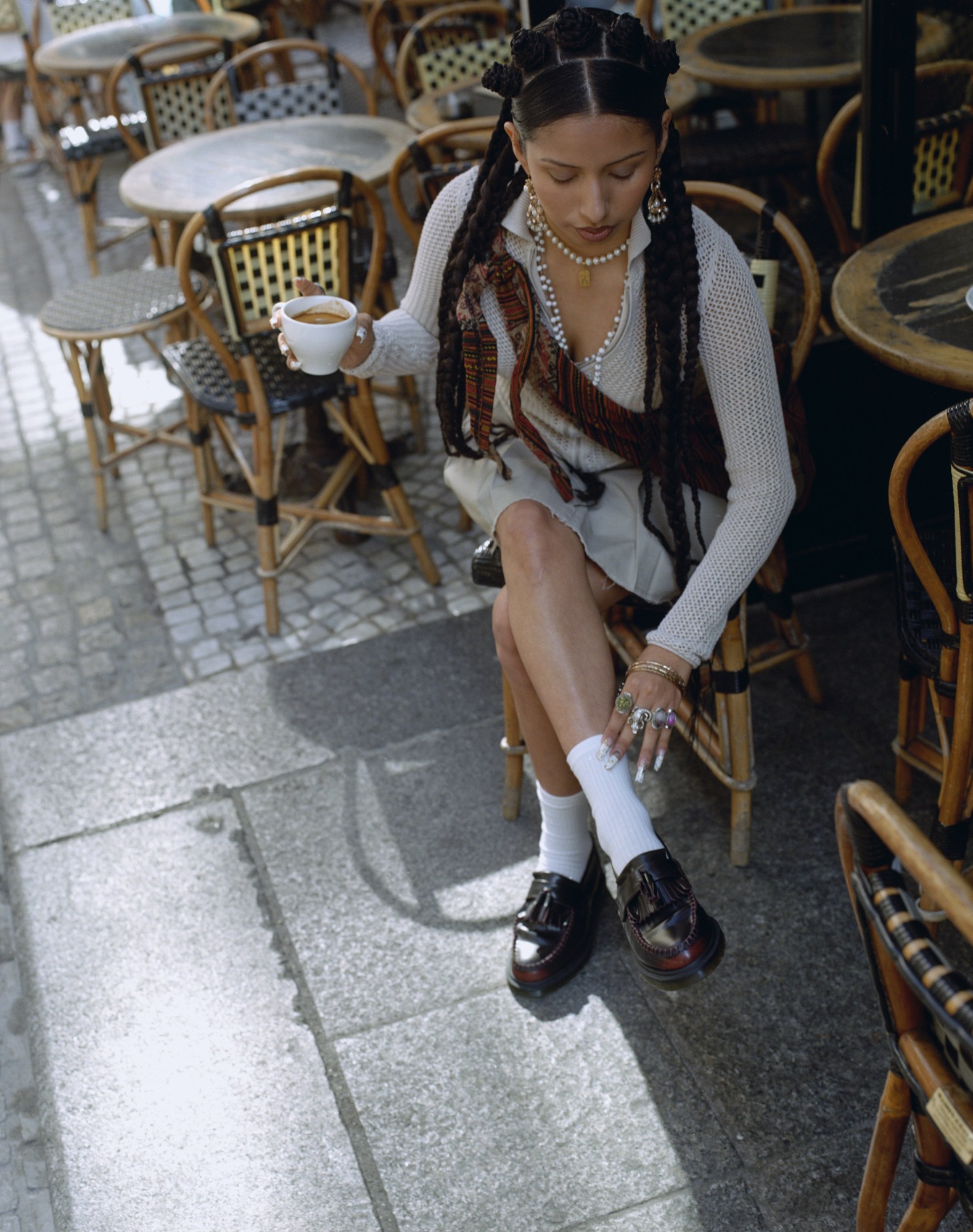 For the shoot, Claudia styled the original Doc’s Adrian Tassel Loafer in cherry red leather and the brand new Adrian Tassel Loafer in black and yellow. She paired with bold layers, rich fabrics, and details that nod to home: silhouettes inspired by folkloric music icons, textures that echo the skirts her grandmother wore, even the instinct to mix softness with structure. “I think I inherited that love for comfort-meets-drama,” she says. “My grandmother would wear joggers under her skirts to stay warm. High-level layering.”