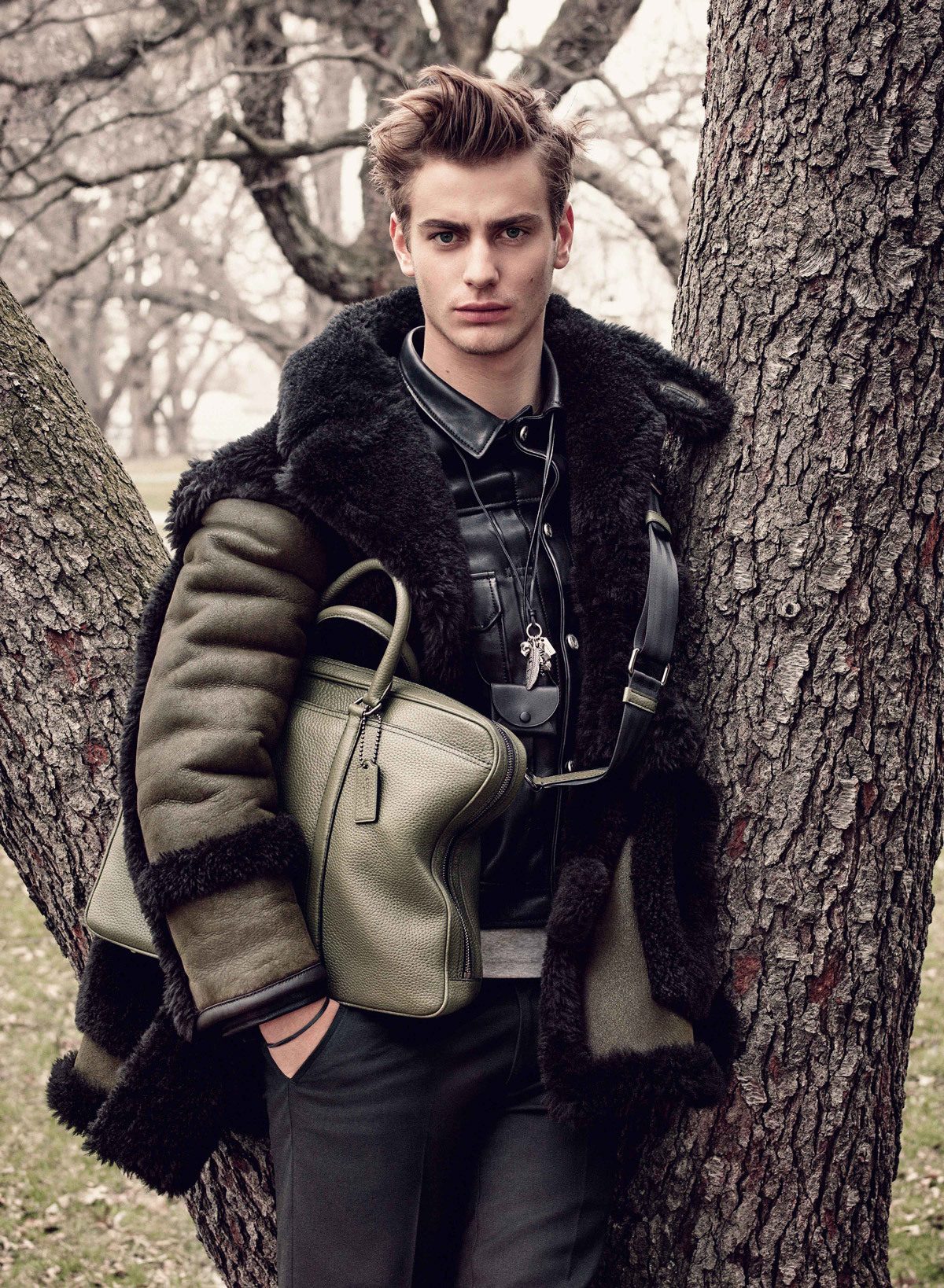 Shot by Steven Meisel, the campaign shows models Niels Trispel and Ben Allen outdoors, beside trees and grass that complement the collection’s natural palette of greens, browns and black in the borough of Staten Island, where Coach is based in New York.