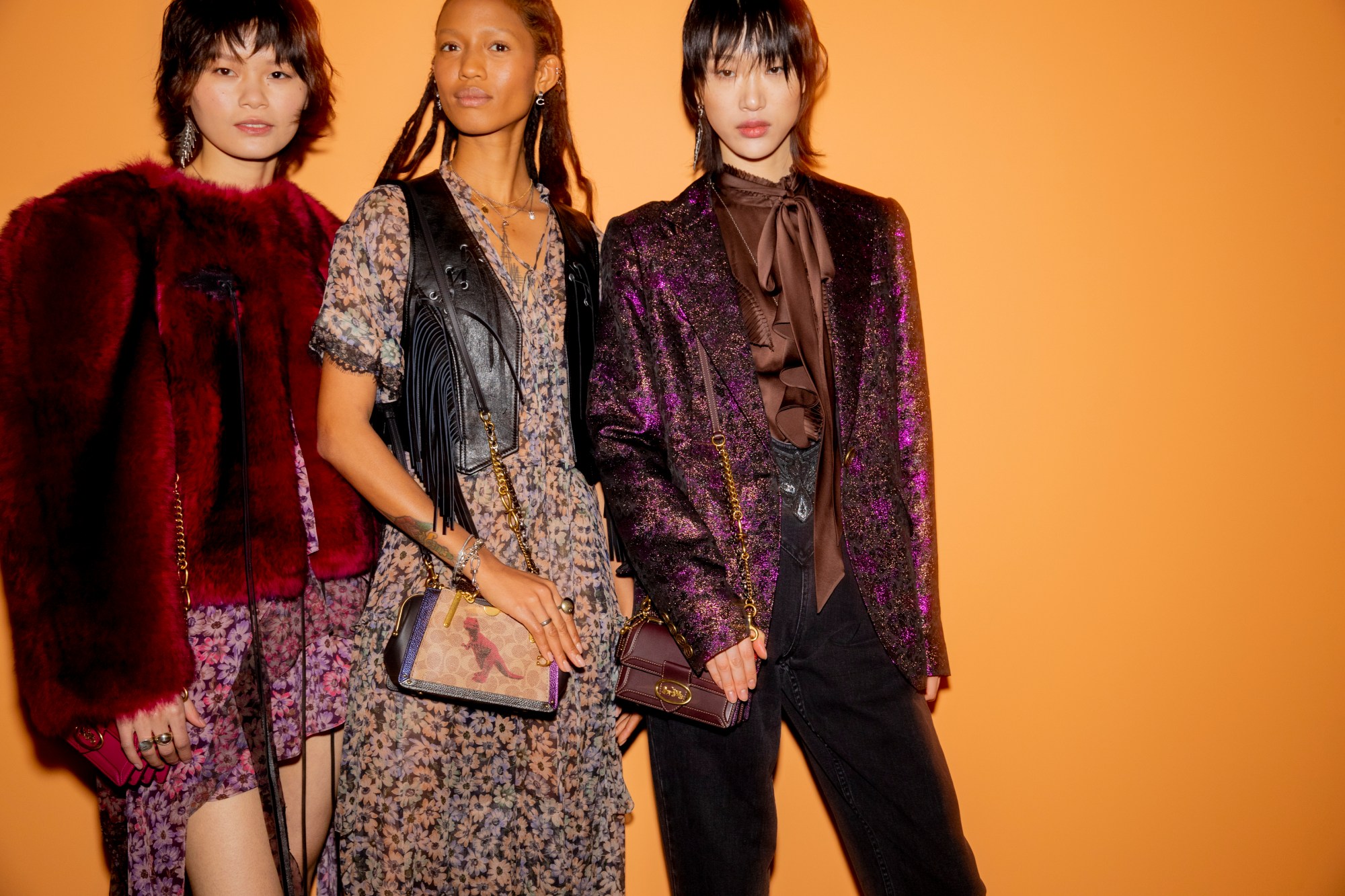 All this was transposed with dreamlike 70s inspired clothing, replete with handkerchief hems that looked like they’d stepped straight out of an Ossie Clark fever dream, lightly draped suede jackets, and worn looking mohair sweaters. Amidst a forest of neon signs and vintage cars, the diverse cast looked like they might be sneaking into a movie theater in peak-era Time Square (maybe we’ve just been watching too much of The Deuce), with a distinctly Chinese update. Bravo Coach for embracing what cross cultural conversation can really look like.