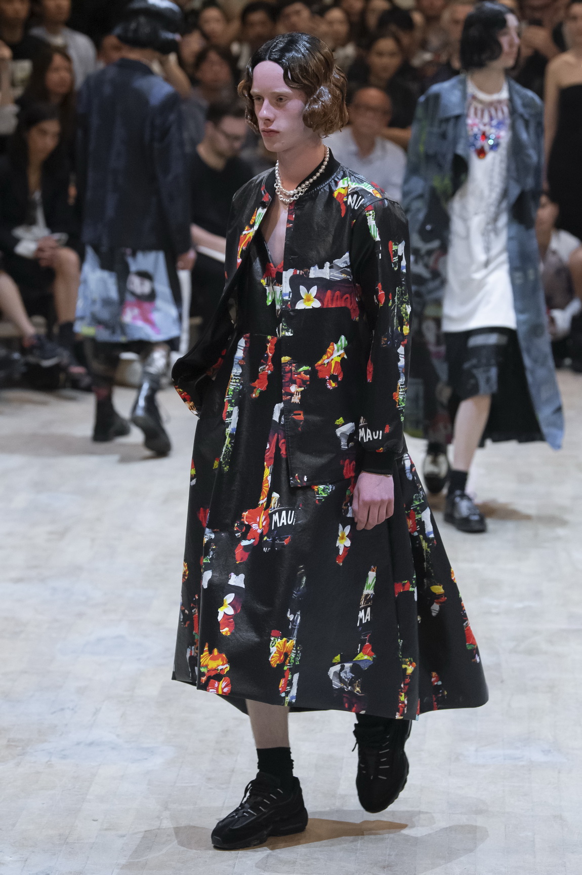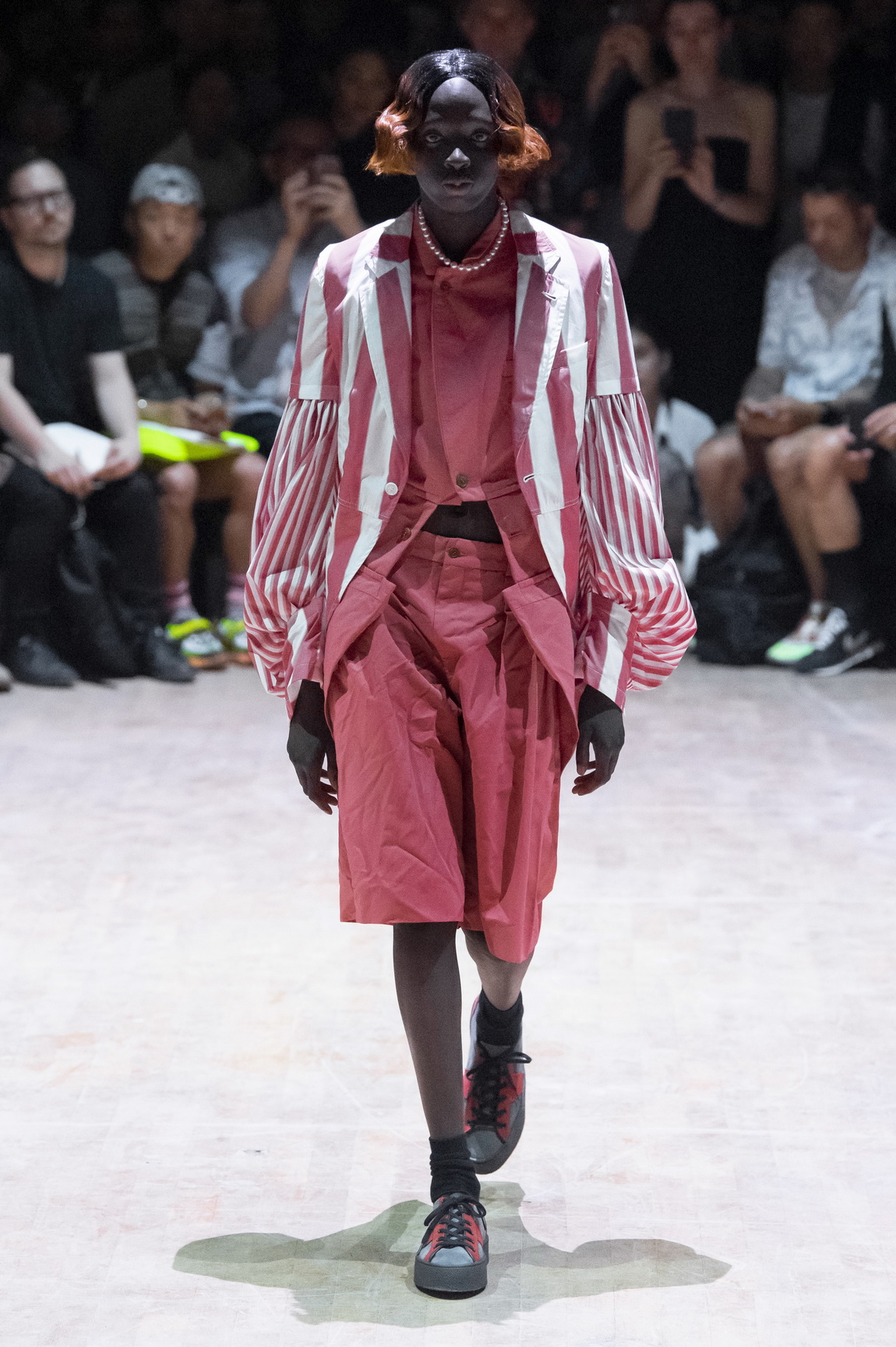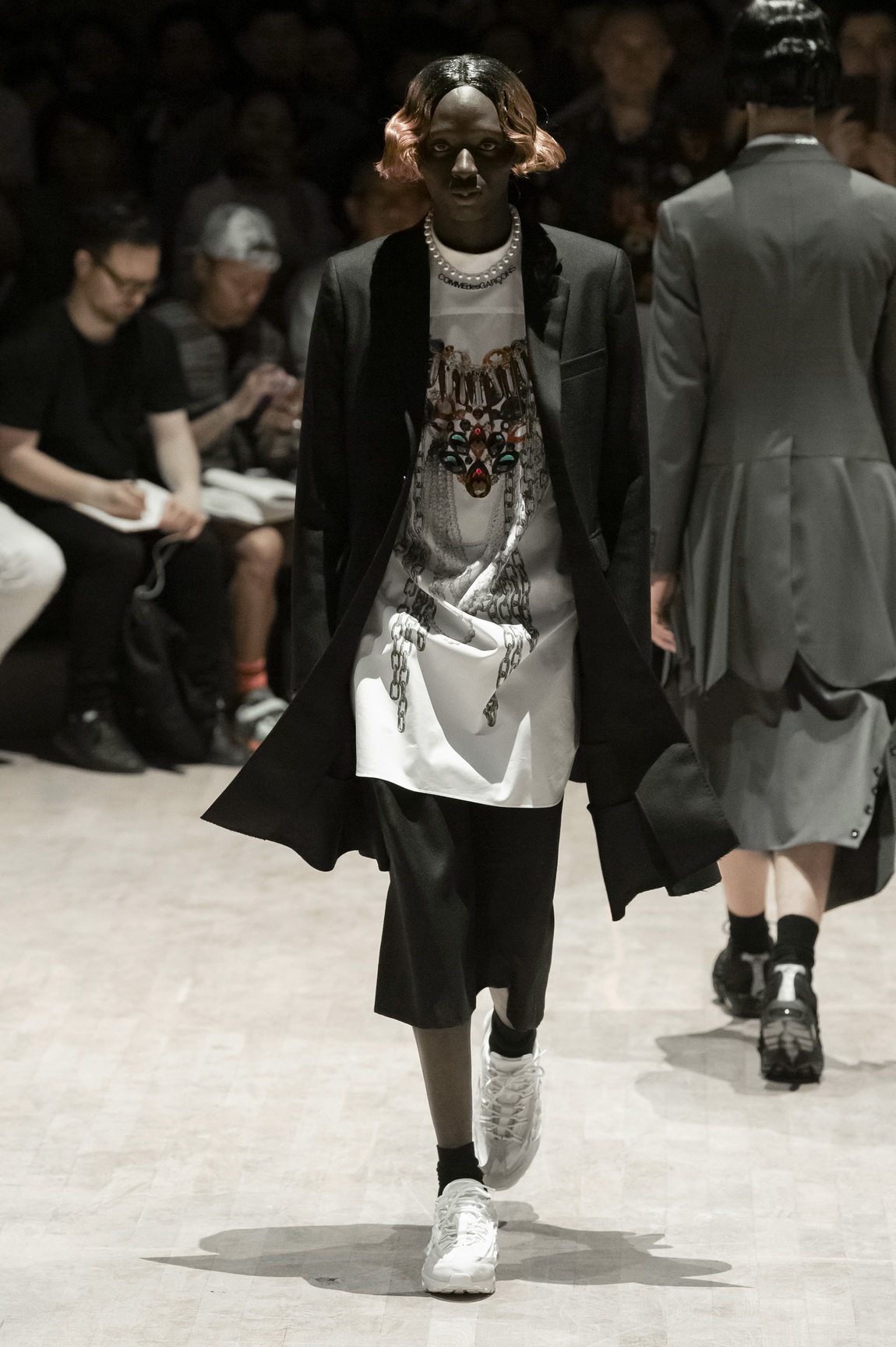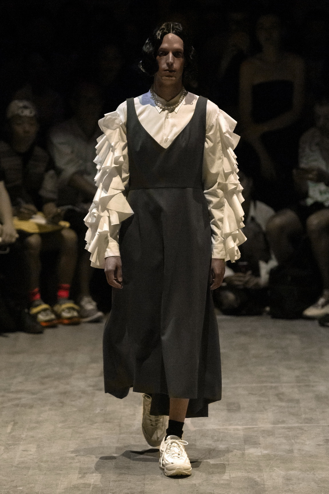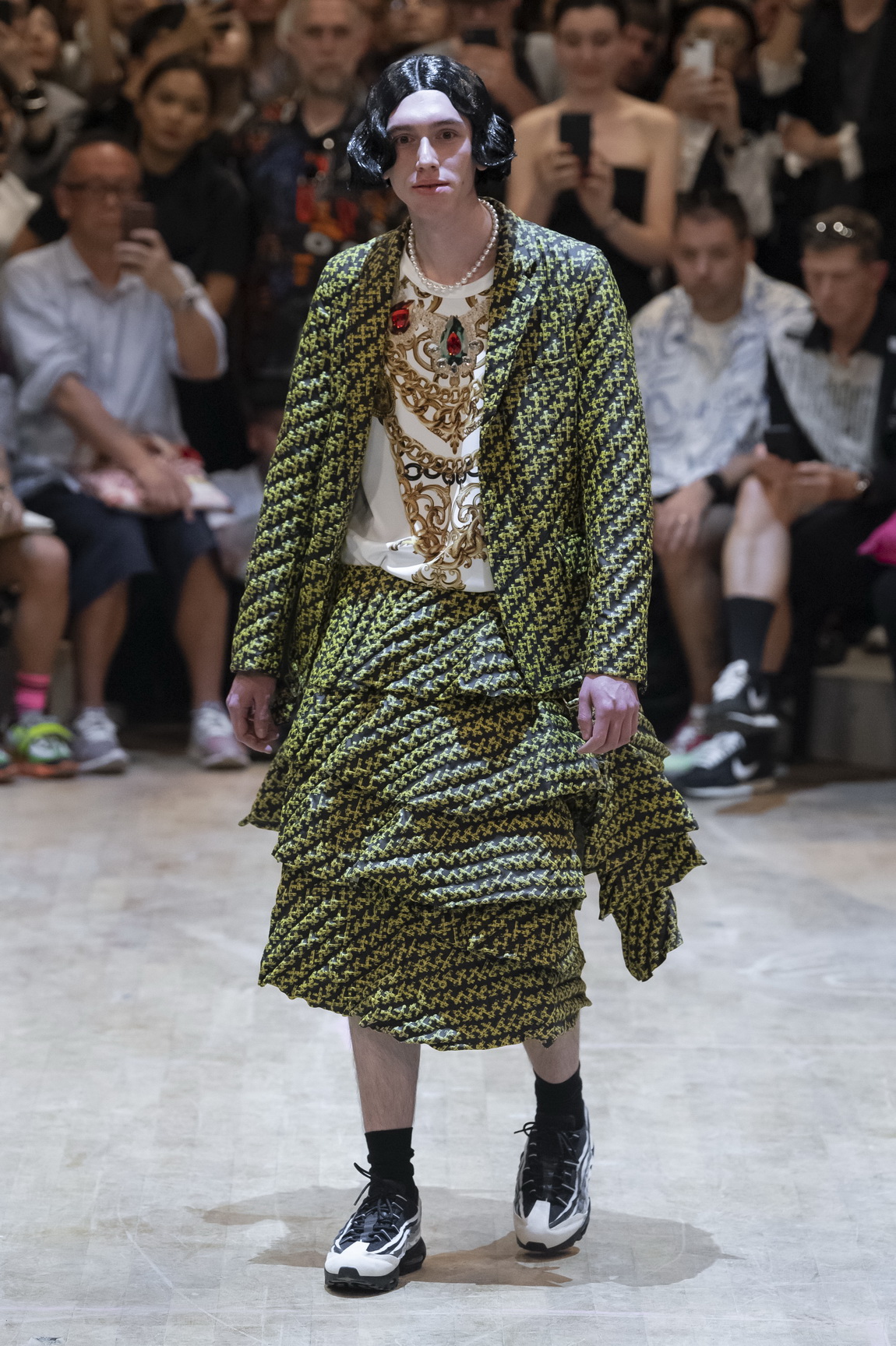 With her spring/summer 20 show, Kawakuko stitched her collection with Orlando‘s still-powerful narrative in mind. The result was a sensory shake-up of a collection that blurred binaries and distorted time. Through costume, Rei steered us through wildly different epochs, from Elizabethan dress to club dance floor wears. Frock coats were teamed with actual frocks and tweaked Nike Air Max 95s — the first time the sportswear behemoth has allowed a company to change its iconic silhouette — while Comme logos hung off of pearl necklaces and navels were revealed with opened curtain frills. This was recreated history, but it felt radically modern at the same time.