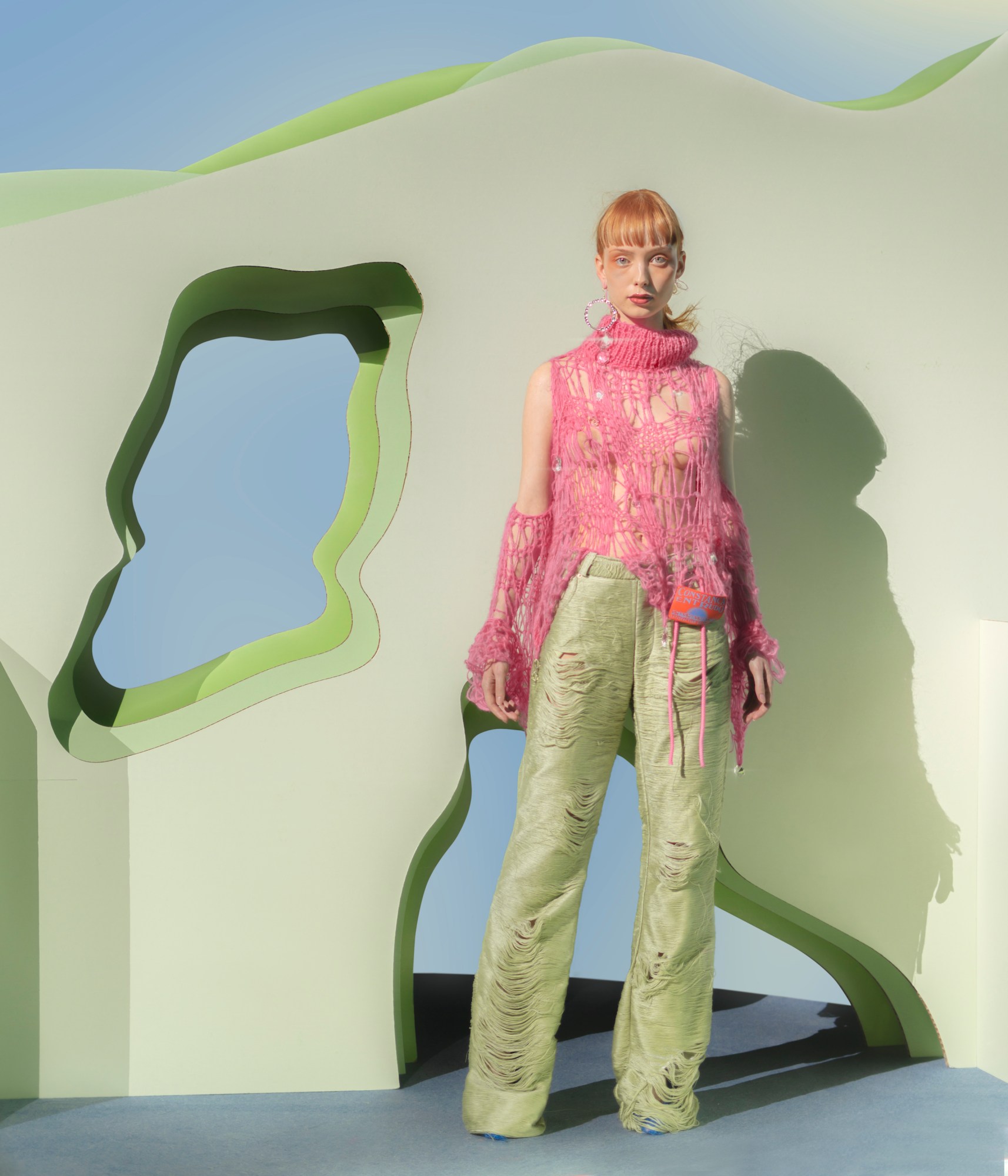 Born in the aforementioned Portuguese islands, Constança lived most of her life in Lisbon before moving to London at age 17 to pursue art. After a year there, she enrolled in Central Saint Martins’ Textile Design program, drawn to its fluid approach to both fashion and art. It was during the latter half of her studies, while specializing in print design, that Constança developed the unique textile-making approach that would come to define her practise. Focusing on creating prints — “surfaces” rather than fabrics, explains the designer — presented a much more free manner of making materials, not bound by the machines of knitting or weaving. For her graduate collection, Constança created a fabric made of bonded threads, unrestrained by the standard warp and weft of woven fabrics. “It started from the material and it grew into this larger concept of being a brand that resists any kind of restricted framework,” she explains.