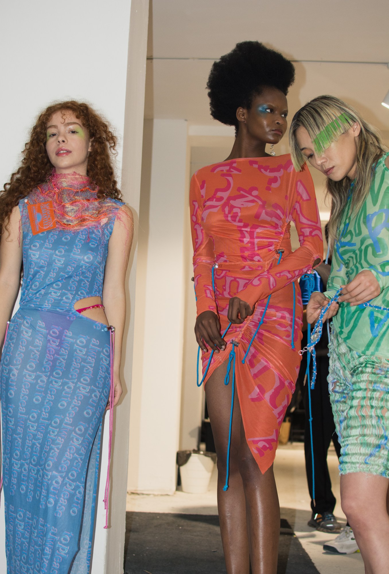 For SS22, Constança was inspired by the concrete poetry of the 60s and 70s. Artist-poets like Ilse Garnier and Cecil Touchon who explored typography as art form. To realize the collection, Constança tapped multi-disciplinary artist Isa Toledo to create a series of abstract poems which were then transformed into colourful prints. Across the offering, strings of words spill from the collar to the hem of a jersey gown; phrases turn and twist themselves around the body of a dress until they’re illegible; unwoven fabric trousers whisper to the written word, the page of a book fed through a shredder. On the jacron label of a skirt: a poem, written in curly aquamarine. “It’s funny because all my references this season were in black and white,” she says, referring to the textual works of Garnier and Touchon. “But in the end, the collection was really colourful.”
