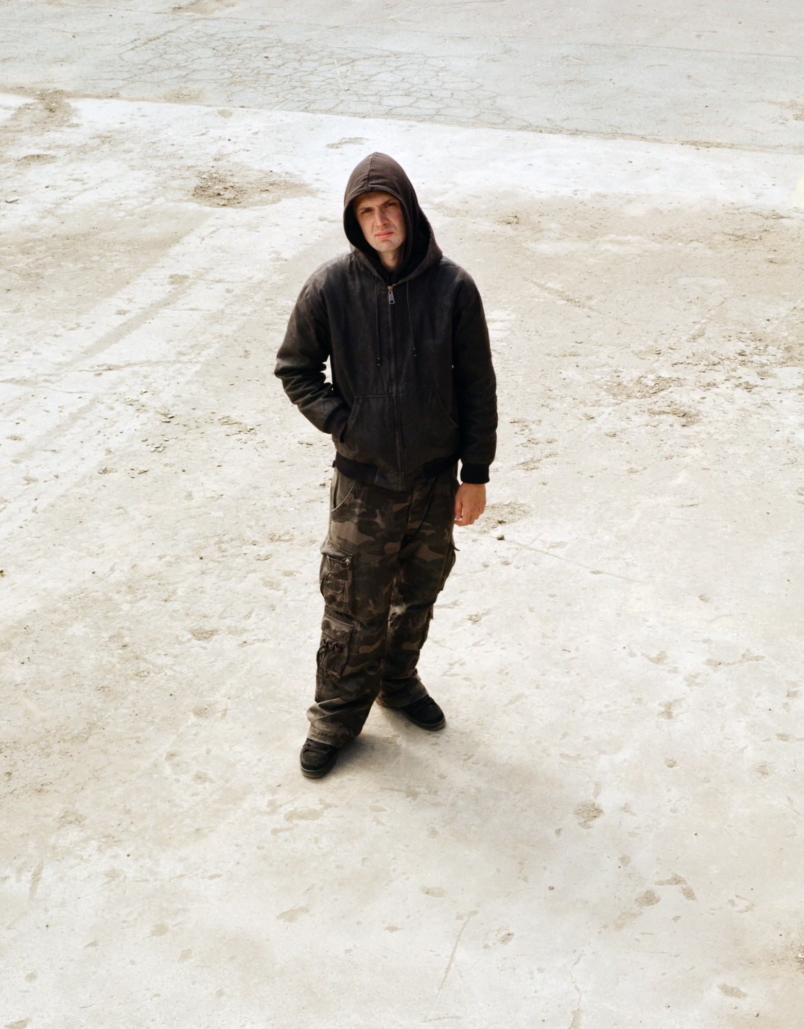 Peter Lundvald Nielsen looking up at the camera in a hoodie and camo pants