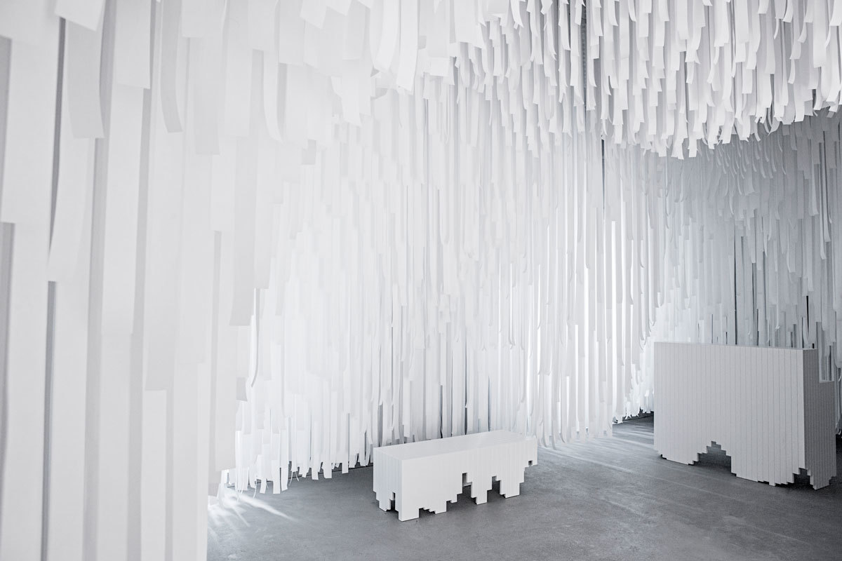 i-D went along to see the space created for COS by New York designers Snarkitecture (they’ve also worked with Calvin KleinPublic School and Kith). It’s a modern maze and cave carved out of hanging white ribbons (about 100,000 metres of industrial fabric – the kind that covers your airplane pillows – was hung from the ceiling, then cut to create passageways).