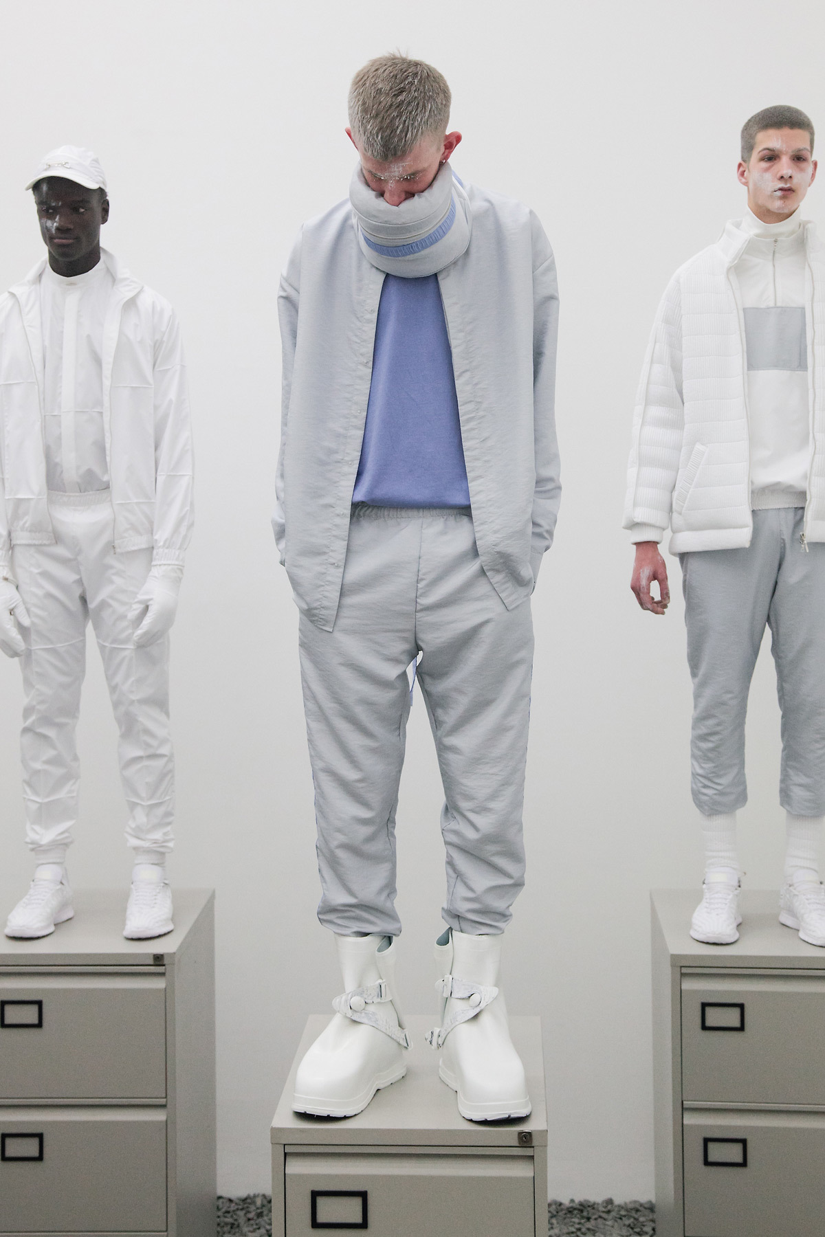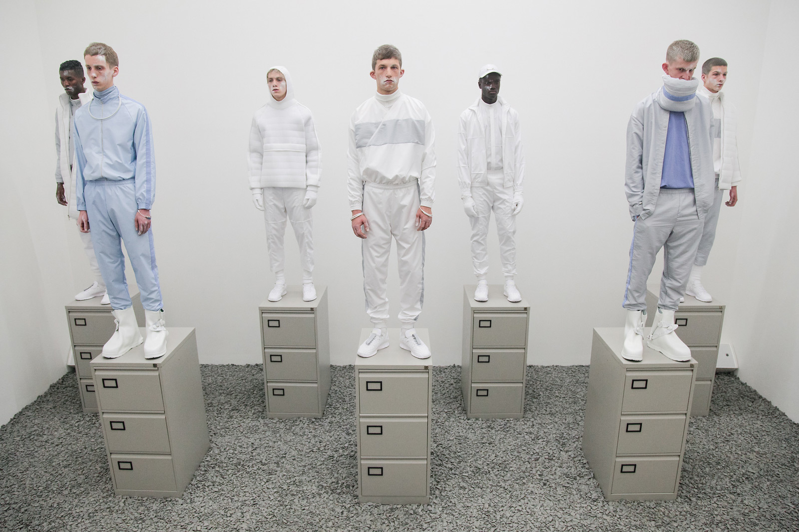 These contradictory aesthetics continued in the way they presented their models. In one room they were raised up on filing cabinets sitting on pieces of slate, in the other they were floor level, in pitch dark, illuminated only by a moving strip of white light. The collection continued to push Cottweiler’s singular world, a desaturated palette of white, grey, light blue, and black, and a cut that mixes the familiar and futuristic, with fabrics that sit between the natural (mohair, cotton) and man made (teflon, nylon). We speak to the brand about sitting out the spotlight, technical fabrics and reinventing household objects.