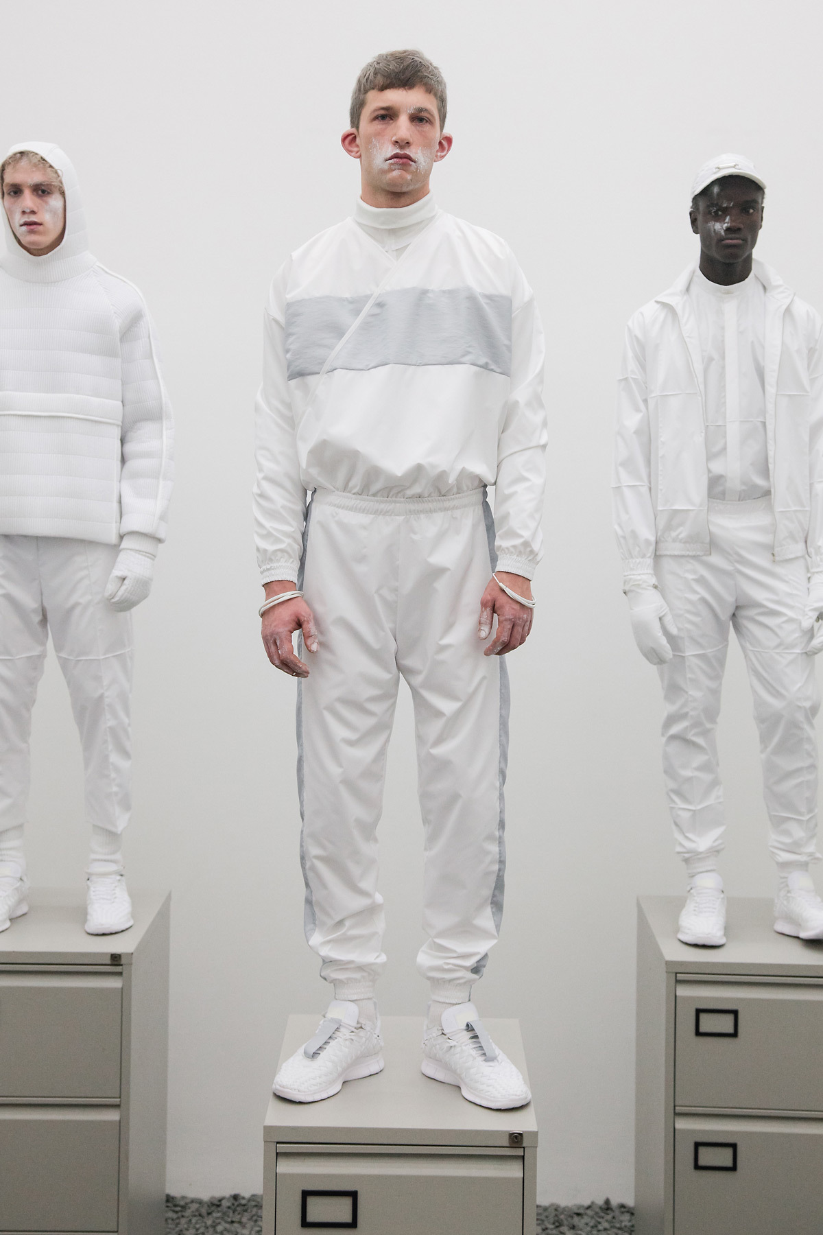 We were getting tired of looking at technical fabrics and trims and we started to become interested in combining a more organic aesthetic with functional fabrication. We wanted to challenge the obvious images that are conjured up when describing a technical fabric. For example, this season we have used teflon coated nylon that has the appearance of crisp white cotton. The use of water has been mostly instinctive and even sometimes accidental, but you could say that water is a perfect example of something that represents both nature and technology.