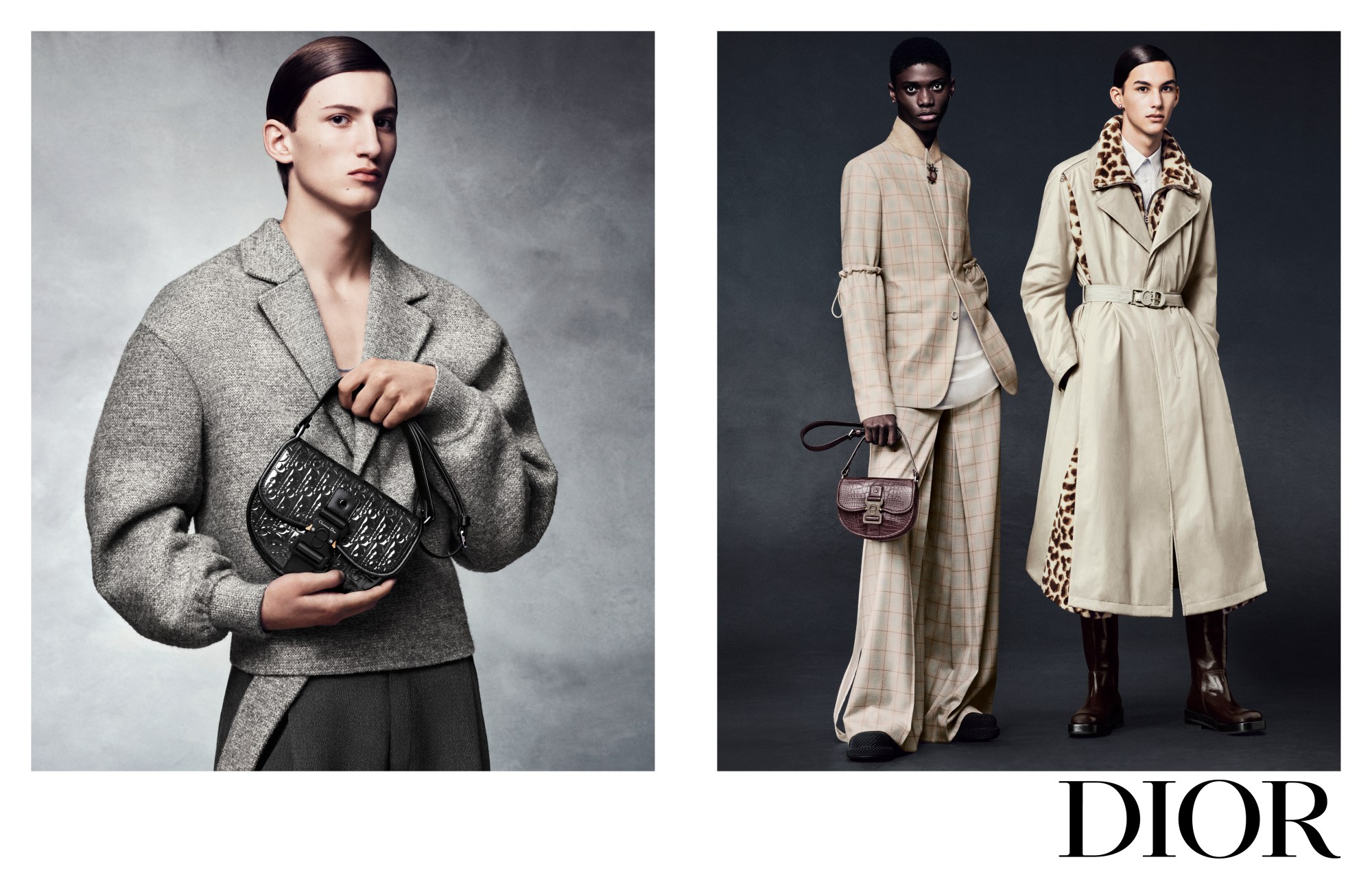 Reflecting the inevitable brooding, greyscale weather of a Parisian or Londonian fall (or, unfortunately, our current summer), Rafael Pavarotti lenses models for Dior Mens AW23 campaign in muted-tone fits against a dark and cloudy backdrop like they’ve come straight out of a Twilight movie. Boys look pensive in waterproof bucket hats and ruff-necked jackets, trench coats with peaks of animal print below, and beautifully simple tweed tailoring whilst holding Dior Oblique motif saddle bags, buckle-strap gallop bags and reptilian leather style saddle messengers. Rainy day wardrobes have never looked more chic! TG
