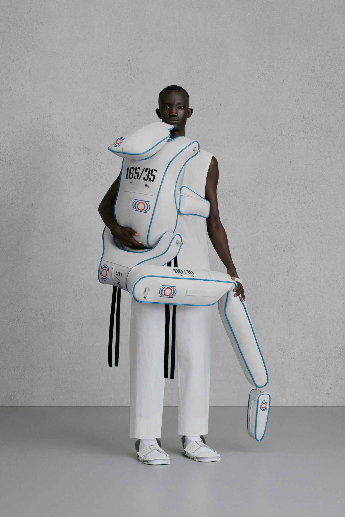 Intimacy plays a large role in Craig Green’s joint AW23 and SS24 offering of menswear, with each chapter of the collection seemingly exploring the revealing of self and how close we allow others with a series of mirrored groupings. To start, models in minimal, monochromatic utility wear had padded, pillowy and faceless dummies made for wrestling practice clinging desperately to their bodies or propped up on their shoulders, like an injured friend being carried to safety. Pairs wearing rain macs, trousers and bucket hats made from laced patches — strings hanging from their edges, creating the illusion of dripping water droplets — were followed by pairs in trippy, contrasting-colour, knits that resembled wintery sleepwear with their nighttime cap style hoods and blanket-esque sleeves. Following this were pairs in padded, floral-regalia-embroidered, armour-esque two-pieces with matching gloves, slippers and masks, sometimes off-centre to reveal the eyes of the hidden bodies beneath. Finally, the collection ends with a series of ballooning tops, jumpers and jackets — featuring stripes in warming colours and soft, waved and delicate hems — that enveloped the wearer, sometimes two at the same time, in a protective cocoon. TG