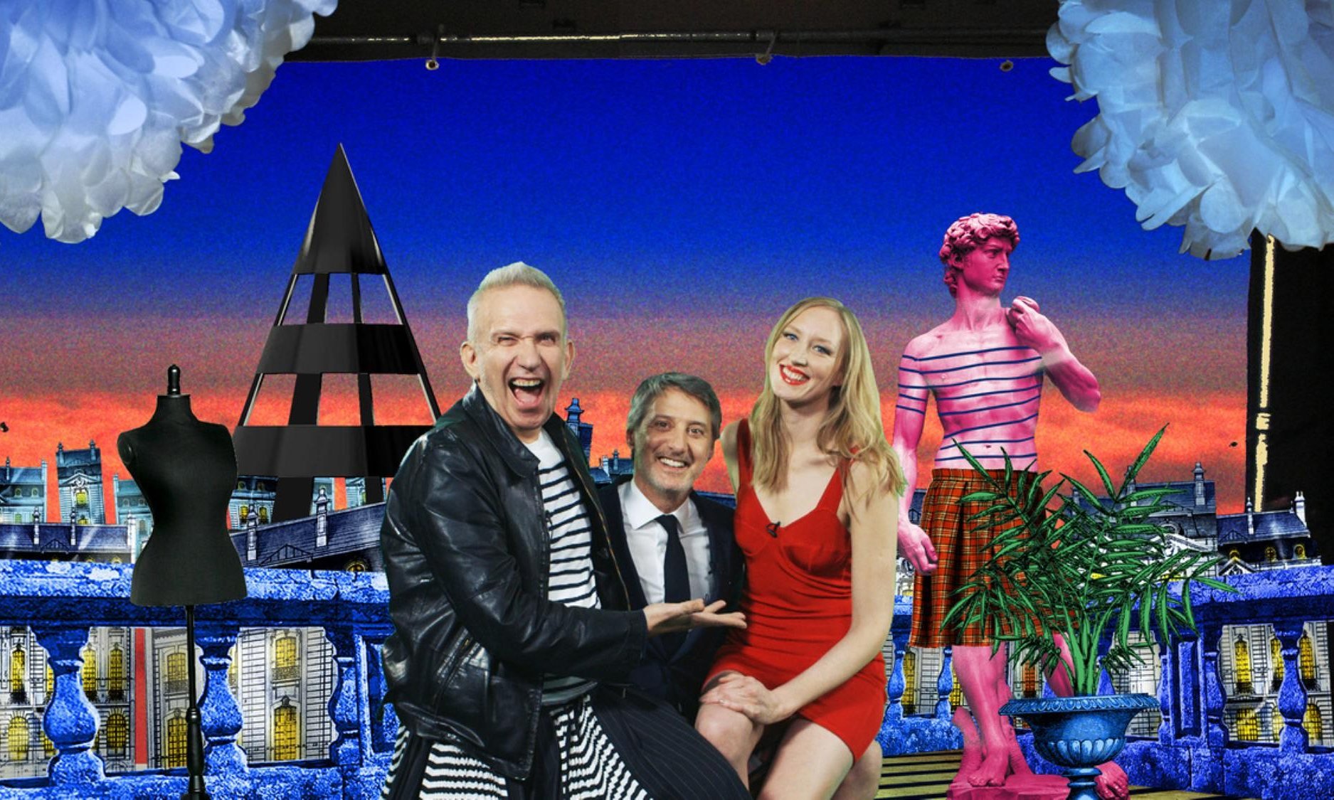 It’s not the first time Antoine and Jean Paul have reunited since the show stopped in 2007. In fact, i-D got the Eurotrash team together in 2014 to celebrate the opening of Gaultier’s Barbican exhibition with a kilt-wearing dance-off judged by Jade Parfitt, and to reminisce about the time they taught Carla Bruni, future first lady of France, to say “Please put a finger in my ass” in many different languages.