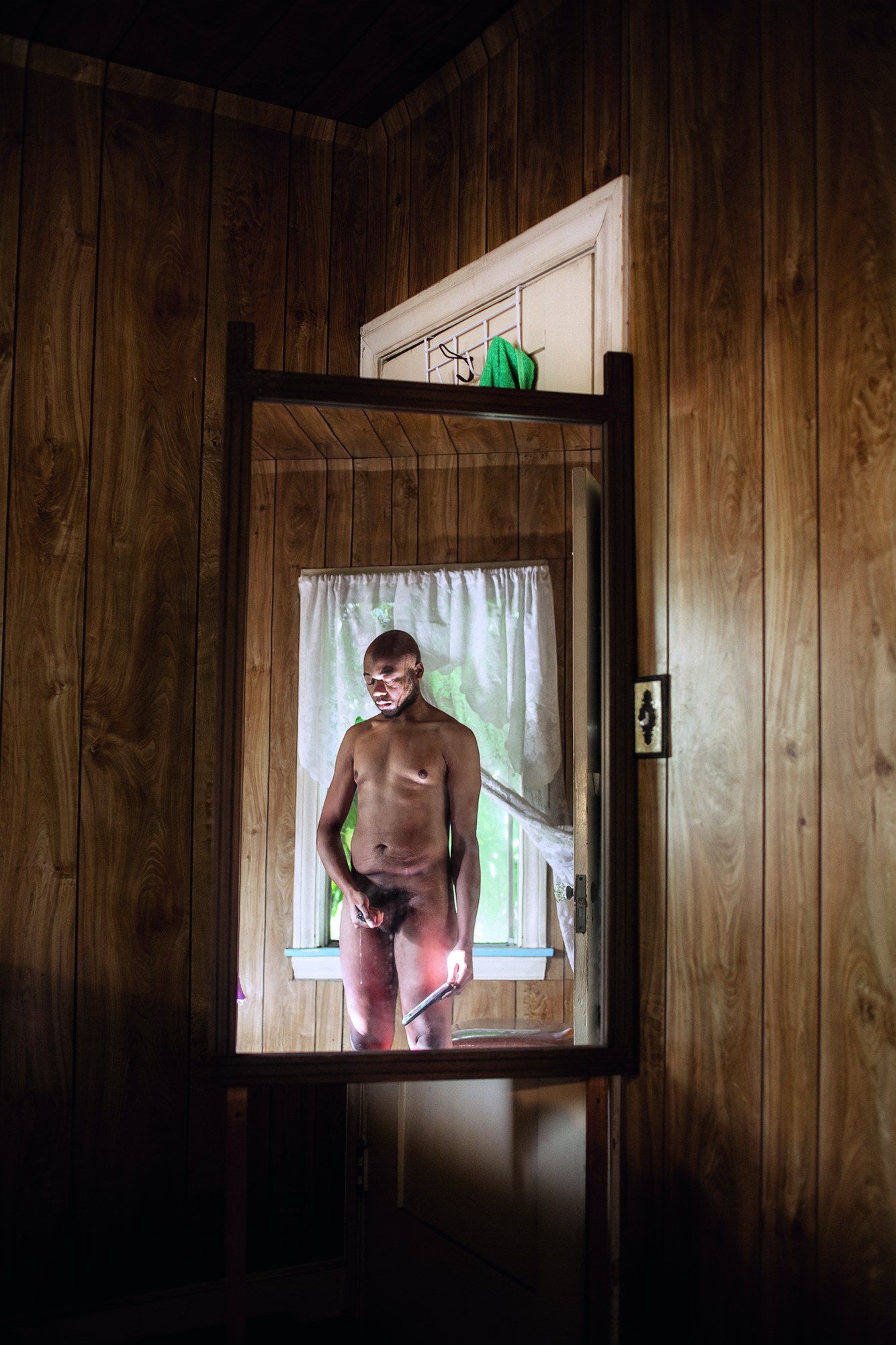 D’Angelo Lovell Williams appears in the majority of the photographs in Contact High, but the book isn’t a story of their life, the Mississippi-born artist assures me. Instead of a visual autobiography, Contact High can be imagined as a collection of snapshots from an actor’s career: different roles across multiple projects, perhaps united in theme, with a rotating cast of supporting characters. And despite the various guises, a few distinct features stand out: the variety of full-body poses, the connection to the land and vegetation, the air of self-destruction. D’Angelo’s unbroken stare into the camera becomes this set’s defining quality.