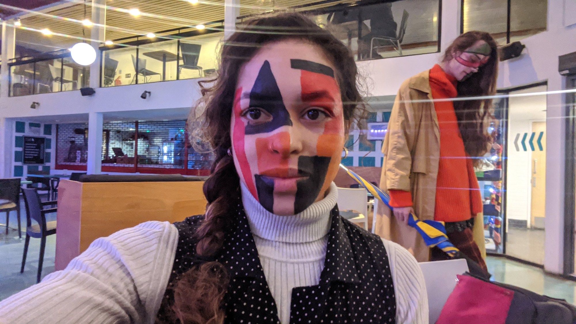 The most effective way to do this is via strong lines across the face, mouth and nose that divide up facial symmetry, preventing the facial recognition software from fitting the puzzle pieces of your face together into a coherent picture. Dazzling isn’t foolproof – when we do a quick pre-walk test, my brand new phone has no problem applying a ‘BABES’ Insta filter to my face – but the Dazzle Club’s main purpose isn’t to cheat surveillance tech. Their project is about using art to question normalisation of the surveillance that’s happening in the first place, and our changing understanding of what it means to exist and move in public spaces in the 21st century, especially while under the increasingly watchful eyes of both private companies and the state.