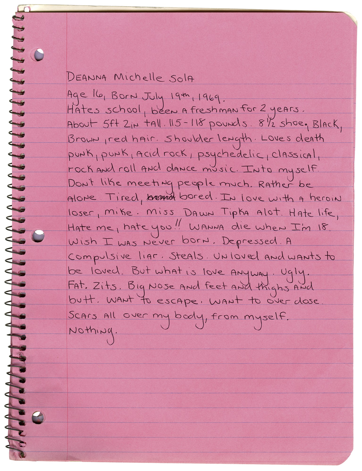 “These young women that I photographed had a lot in common,” she says. On the surface, the girls share a punk aesthetic, sure — many wear T-shirts of bands, have tattoos, etc. But it was self-loathing that emerged as the common thread. One girl Deanna photographed in 2006 had the word UGLY scrawled on her torso. “I think she might have said ‘I hate myself’ or something. I think that one had the most impact on me because I felt like what was written on her stomach was written on the pages in my journals.”