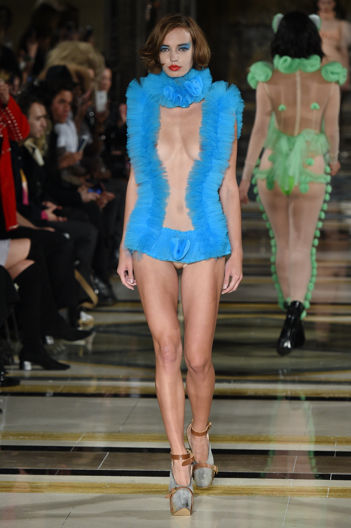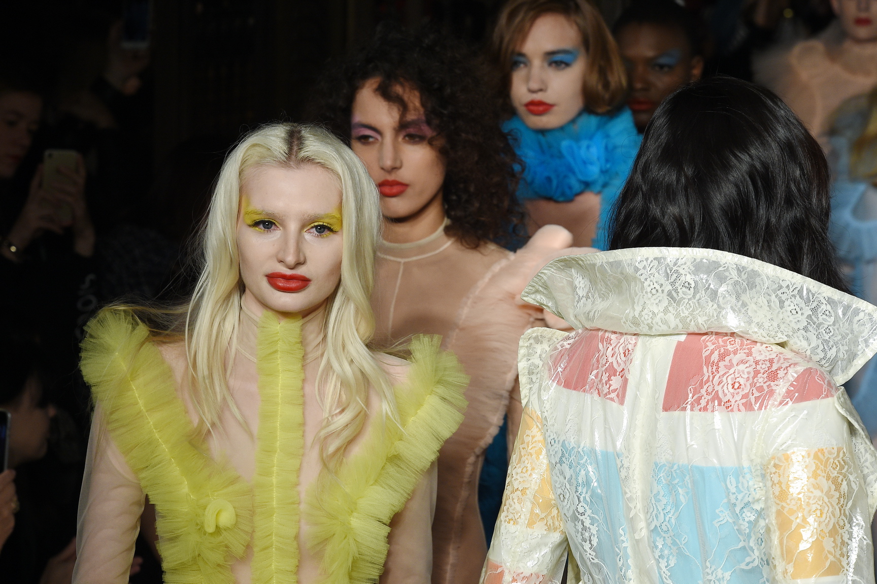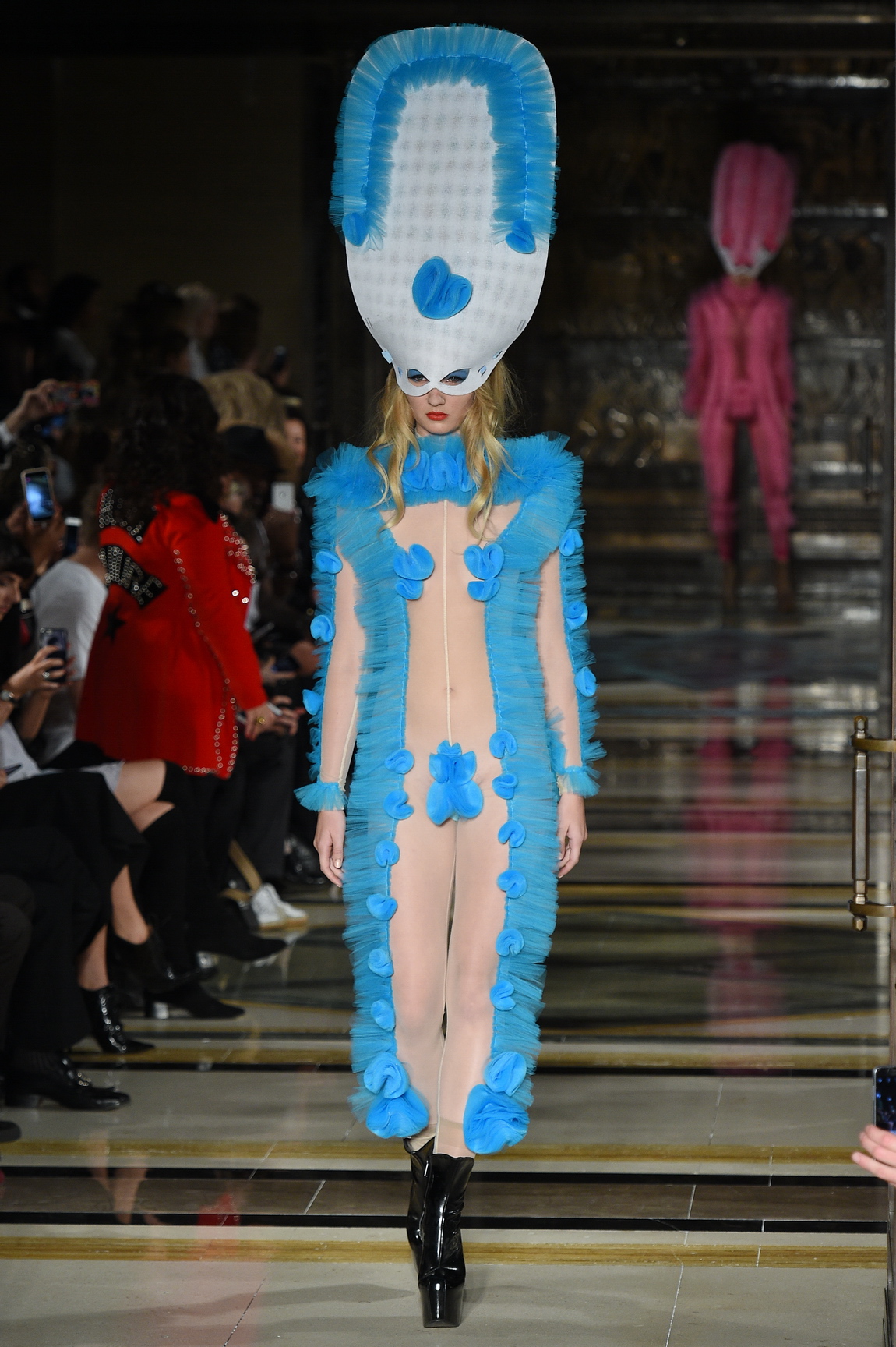 The final two looks were the weird cherry on top of the sexy cake. The tulle reappeared on sheer bodysuits, this time crowned with giant, elaborate head piece masks. They came down in baby boy blue and pretty girl pink, blobs of tulle affixed to protect some modesty, and crowning a show that feasted on OTT glamour.