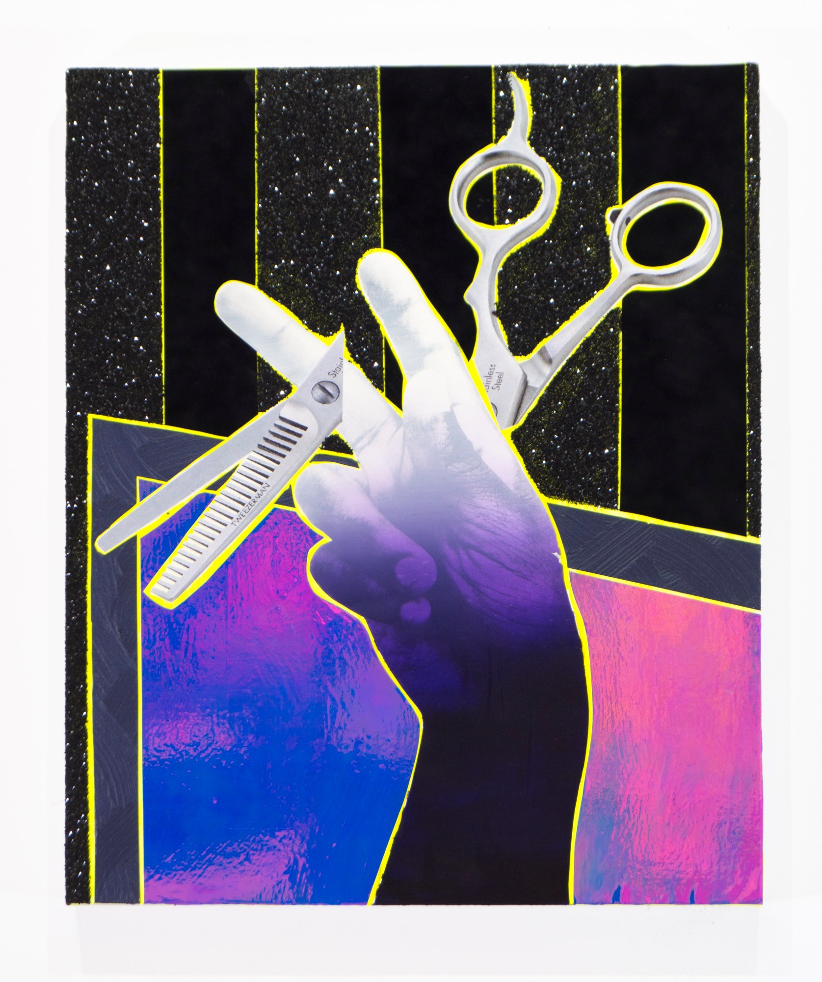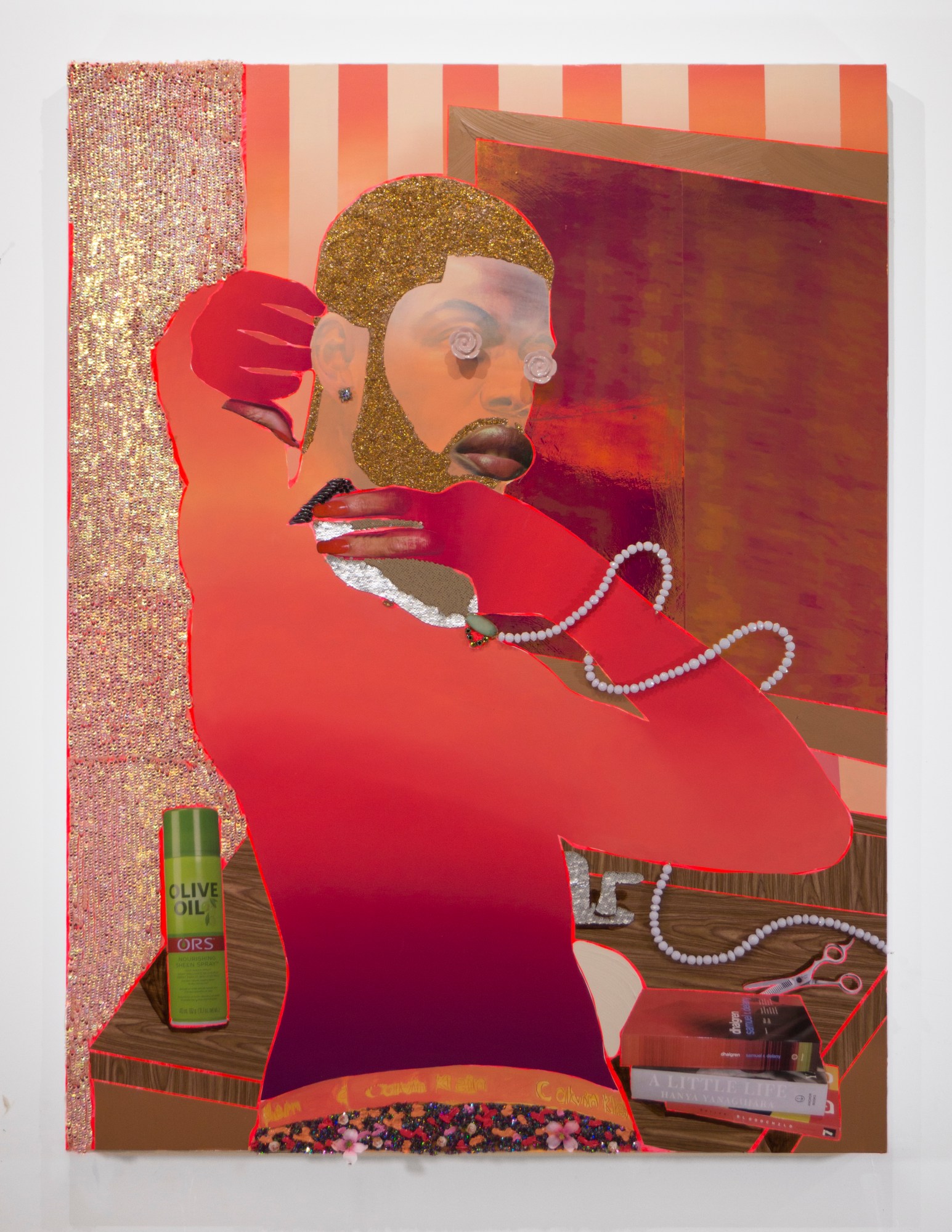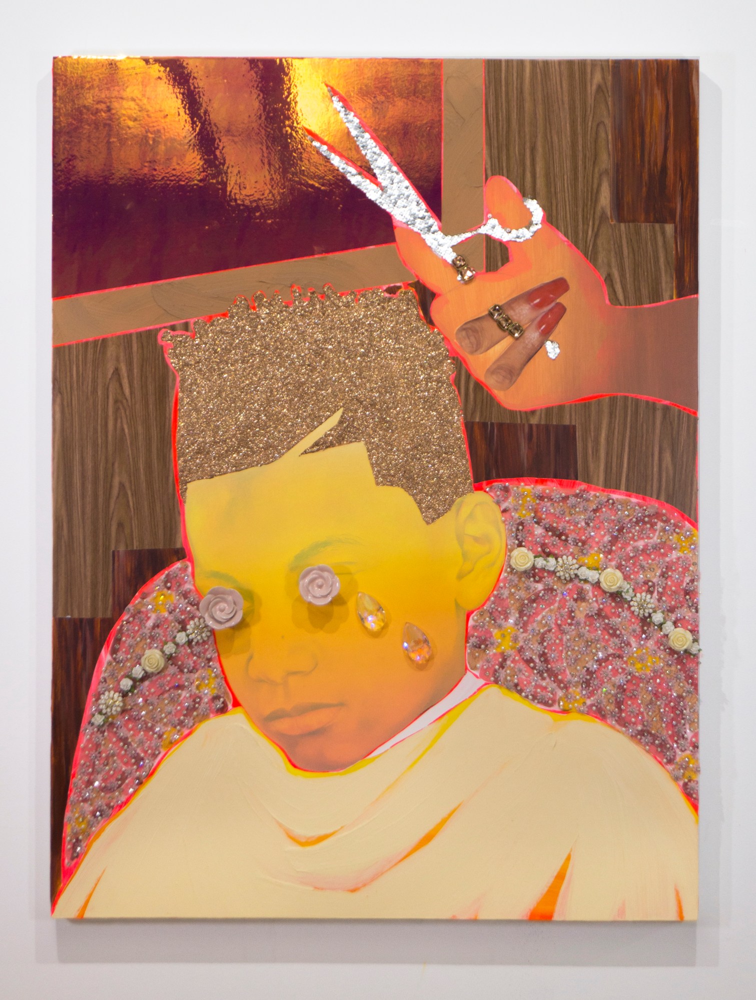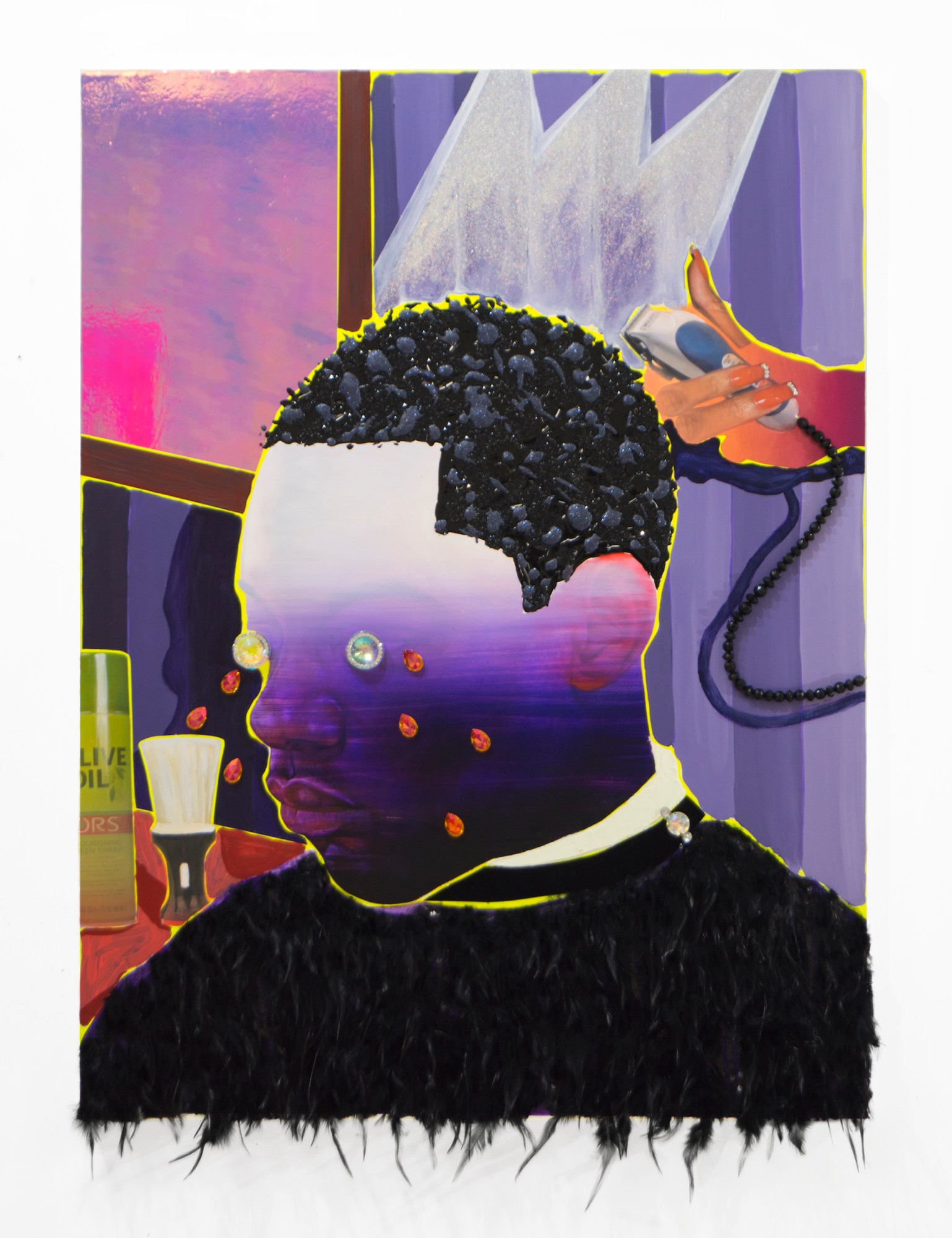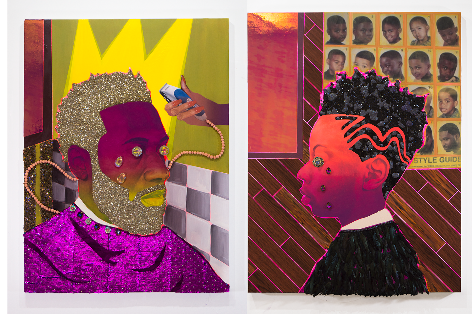The portraits are all done in color pencil. Then I usually glaze over them with oil paint for that gradient effect. I’m a huge collector of materials. Sometimes I visit craft stores and fabric stores in New York City whenever I’m there. I spent a month in LA for a residency and I would go to estate sales and collect stuff. I think of the paintings as a collage almost. I always start with the portrait and then construct the space around them. I try to use glitter or really thick glossy paint to sort of mimic the texture of black hair. When I sweep up the floor after a painting, it feels like I’m sweeping up the debris from getting your hair cut.