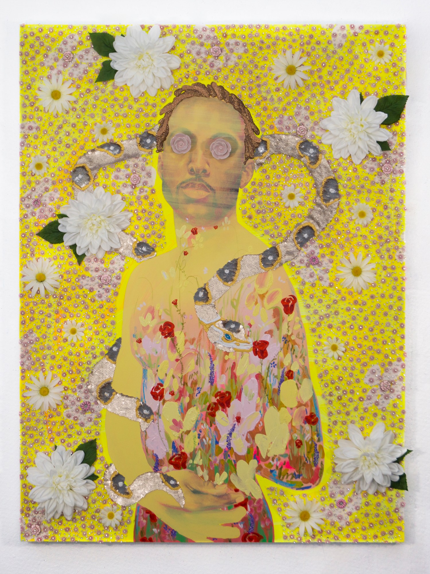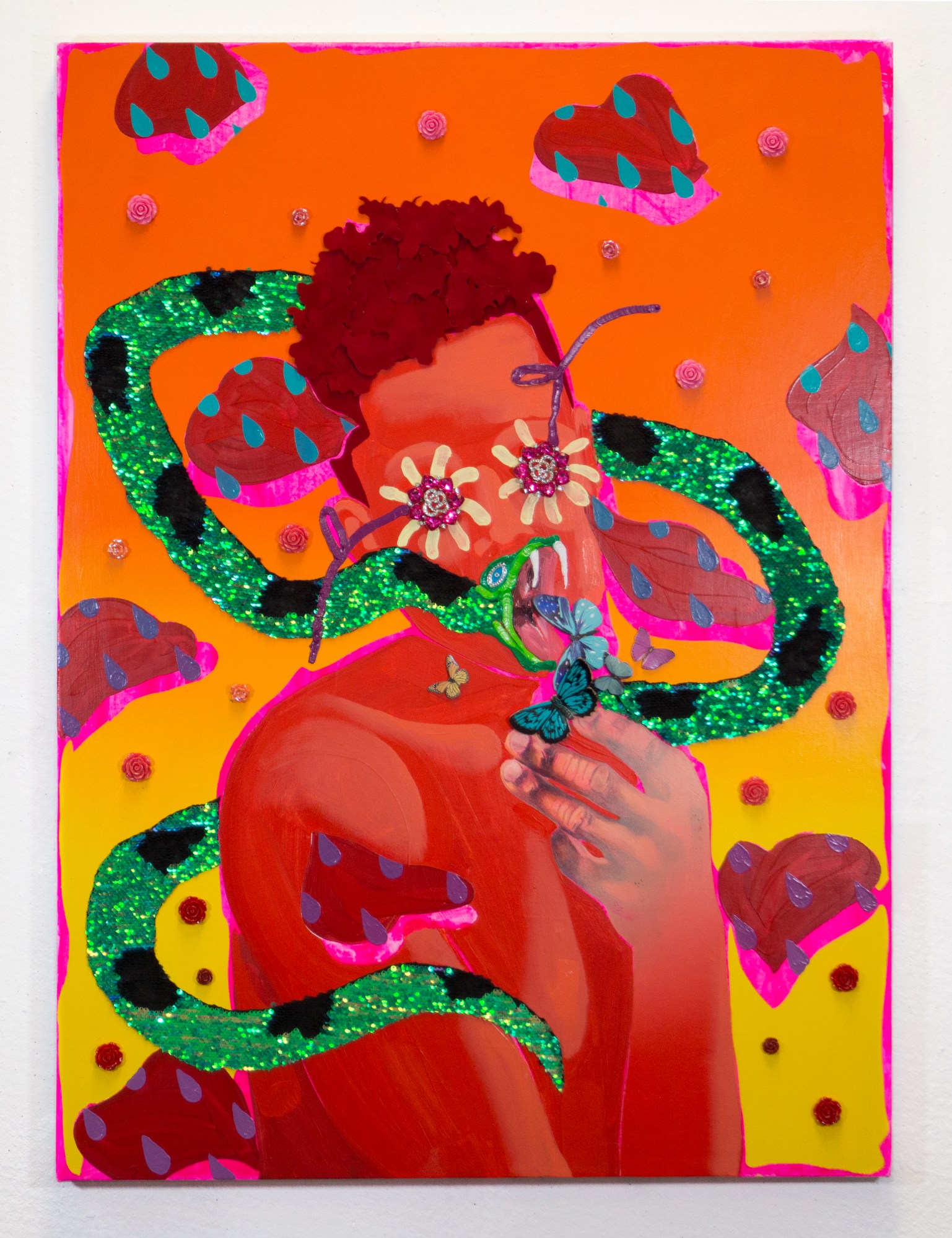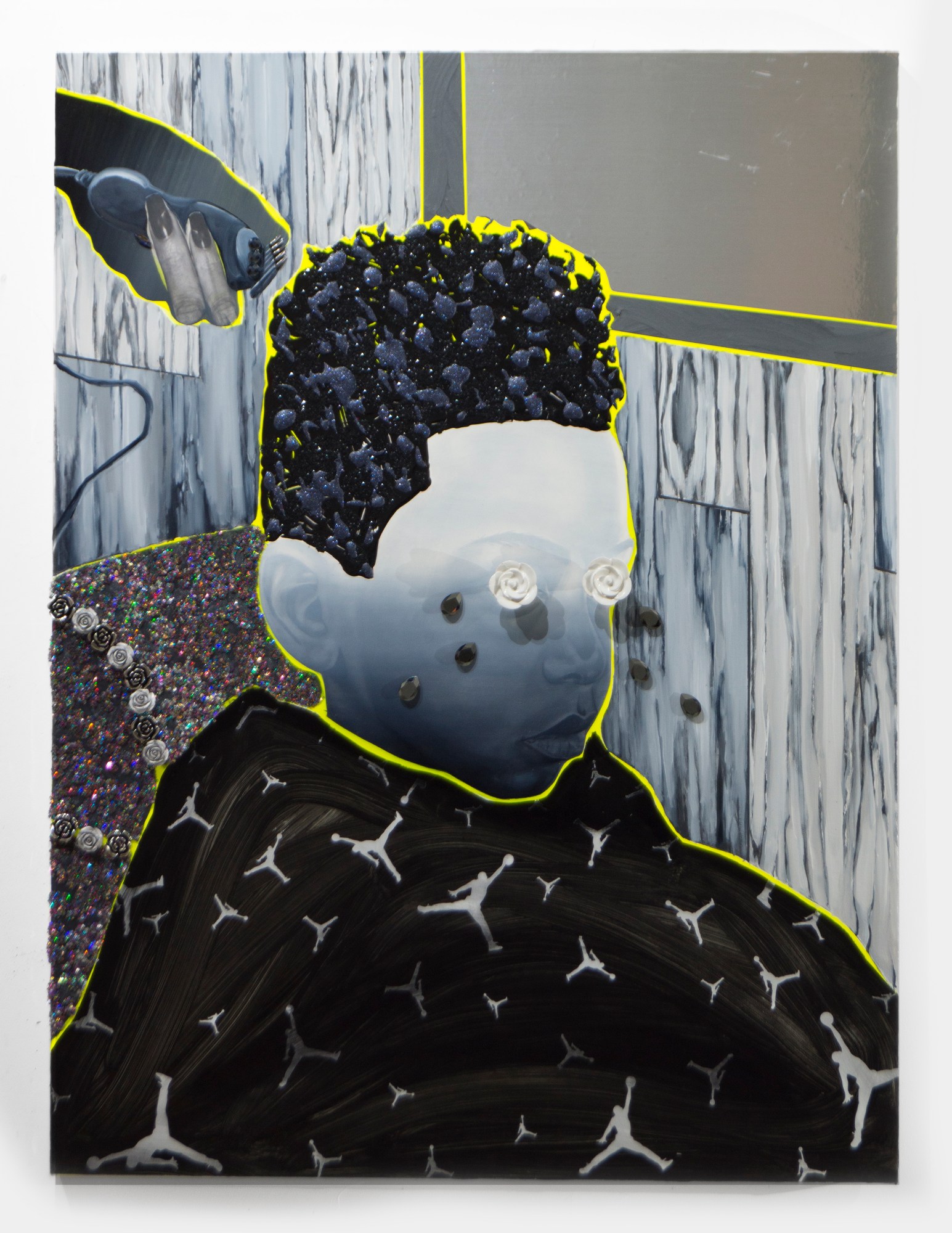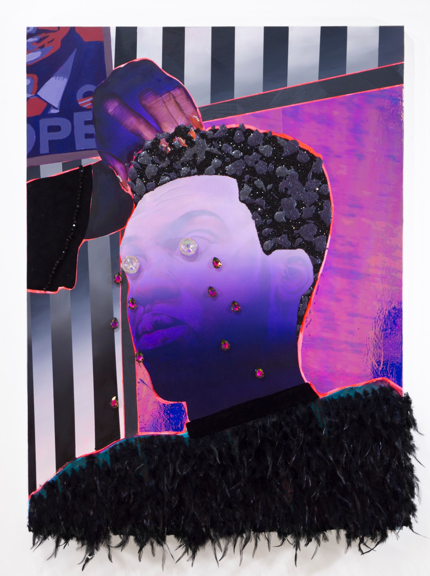 The paintings incorporate a lot of 3D materials, like jewels and glitter. What is the technical process of putting the works together?