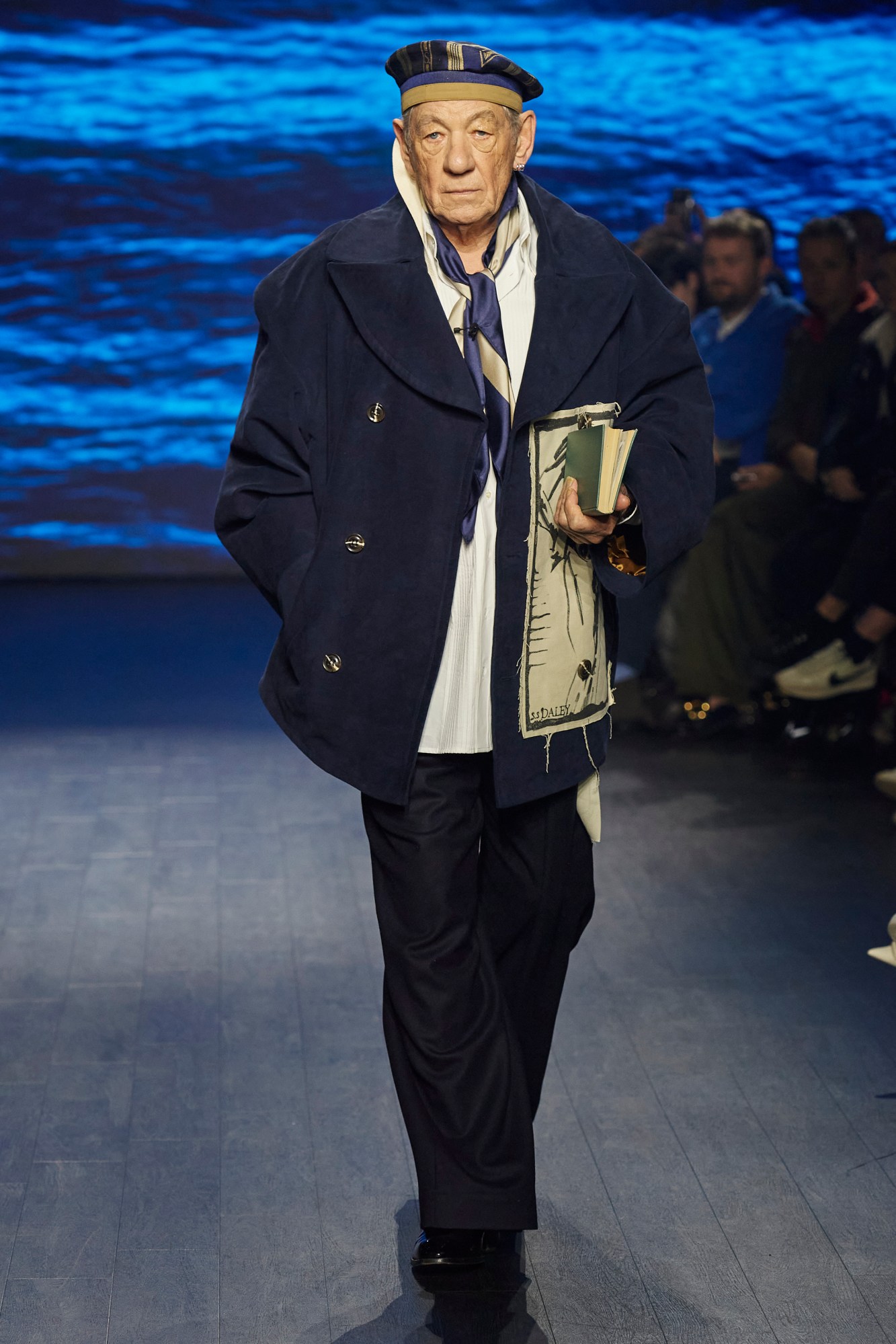 Steven Stokey Daley’s nautical AW23 collection had shimmering navy silk tees, gowns and neckties with prints of muscular male nudes, like a gender swapped version of the 50s leggy pin-up girls. Additionally, the outline of a naked man was attached to the front of a peacoat worn by Sir Ian McKellen as he opened the show, conjuring a queer version of the lost-at-sea sailor motif – the picture of his nude lover he’d been holding close during a shipwreck plastering itself inseparably to his wet clothes.