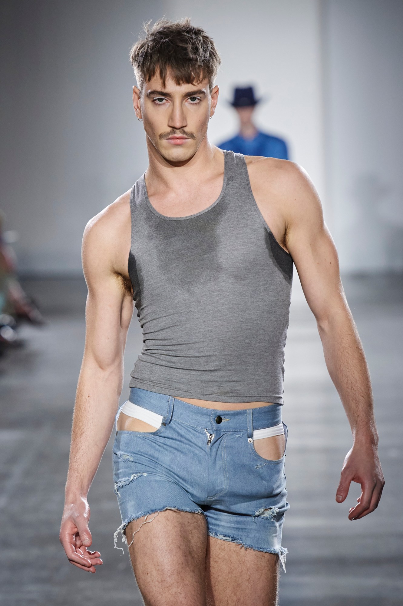 Models walking for London College of Fashion MA student Zhongzhi Ding’s collection had the overt outline of a prosthetic boner pressed against their leg. Reminiscent of Lady Gaga stuffing a dildo down her pants on the cover of Q Magazine in response to rumours she was a hermaphrodite, the enlarged, circumcised, silicone dick sat under office suits, sweat-soaked sportswear, leather moto-jackets and other garments often fetishised by queer men. Here, desirability and objectification became an empowered choice that can be put on by all cis and transgender bodies.