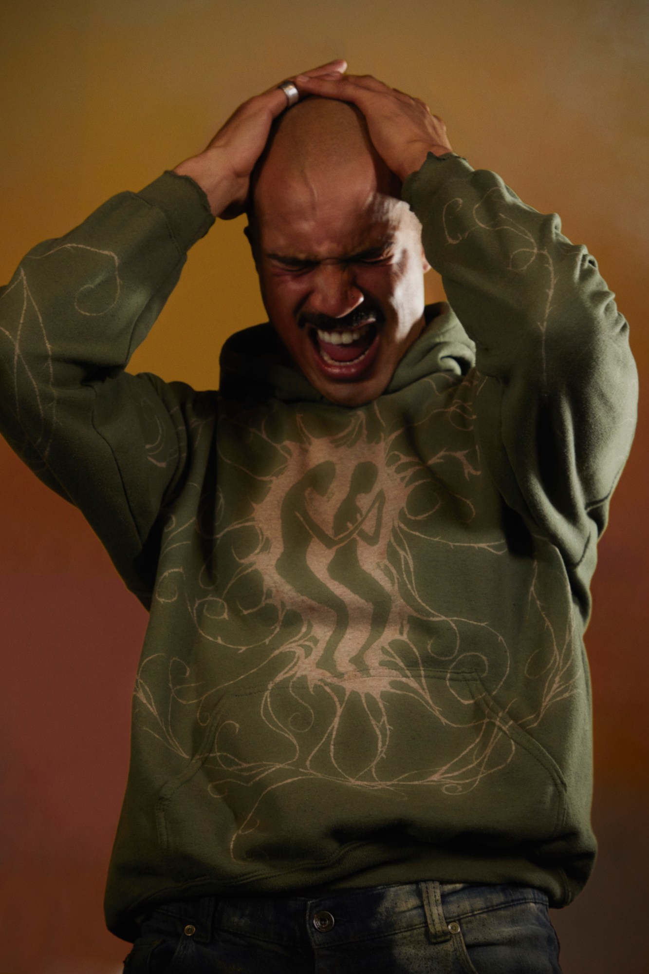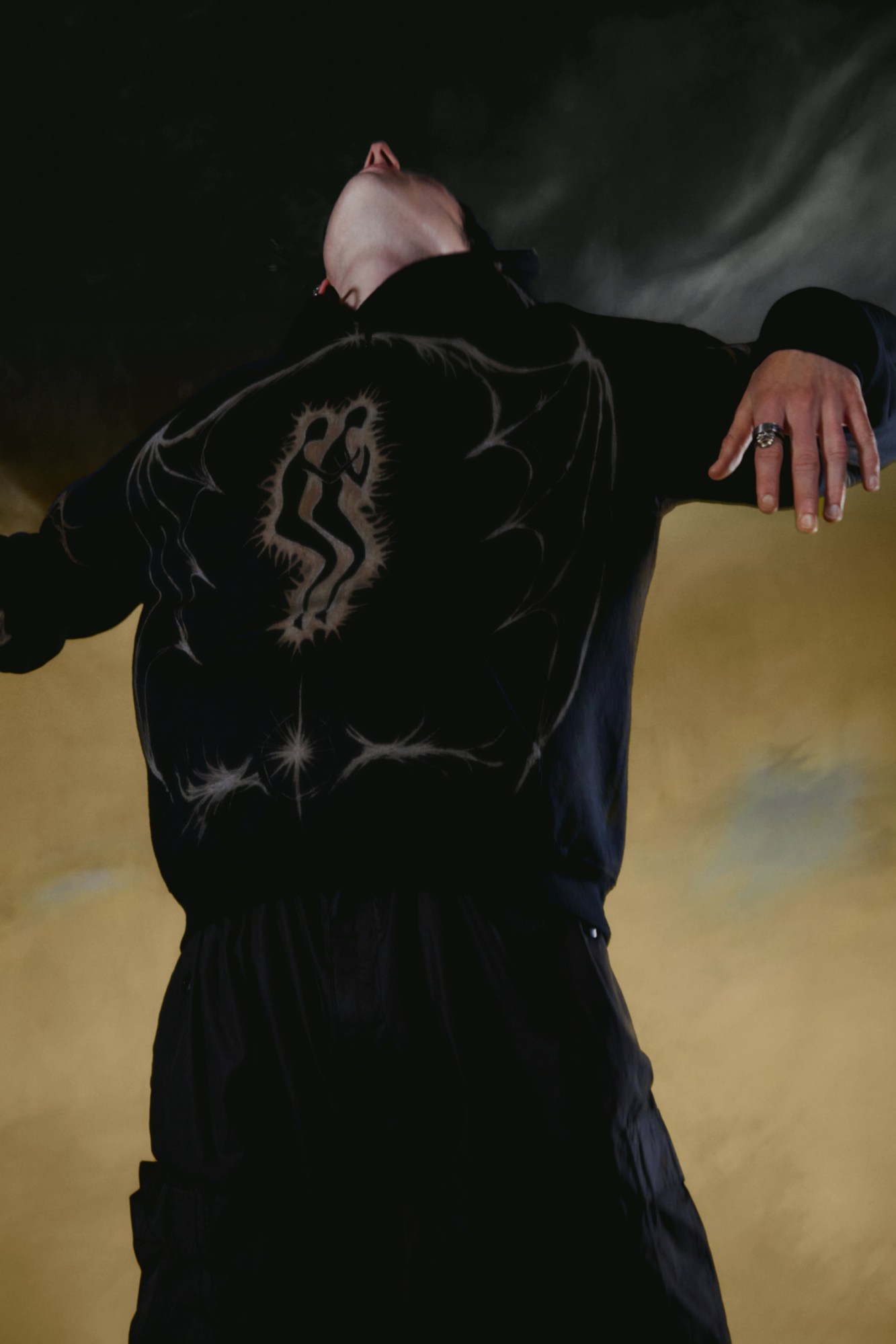 The Ritual hoodies carry a powerful message of love and empathy. Behind the illustrative beauty of the hand painted motifs, there is a potential to access a dreamscape. They are like metaphysical cocoons the wearer can find comfort in.