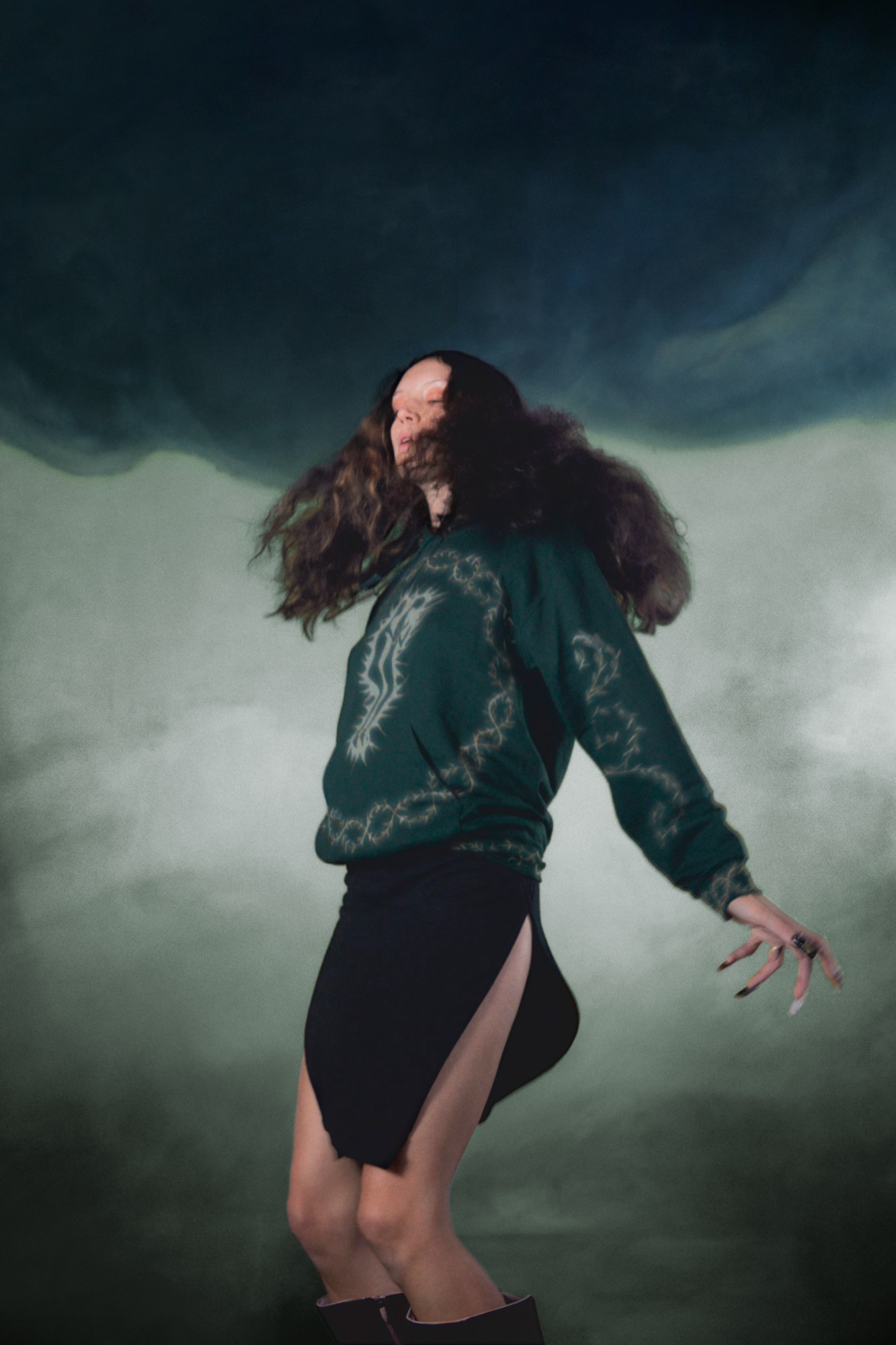 Might sound specific but how cool would it be to have David Attenborough wear my hoodie while talking about a paradise bird in the rainforest? My ultimate icon would be Björk wearing one of my nature inspired dresses. I would also love to see Caroline Polacheck and FKA twigs wear my work. My silicone plant dresses or the reflective couture dress from my last collection, they would look stunning in them.