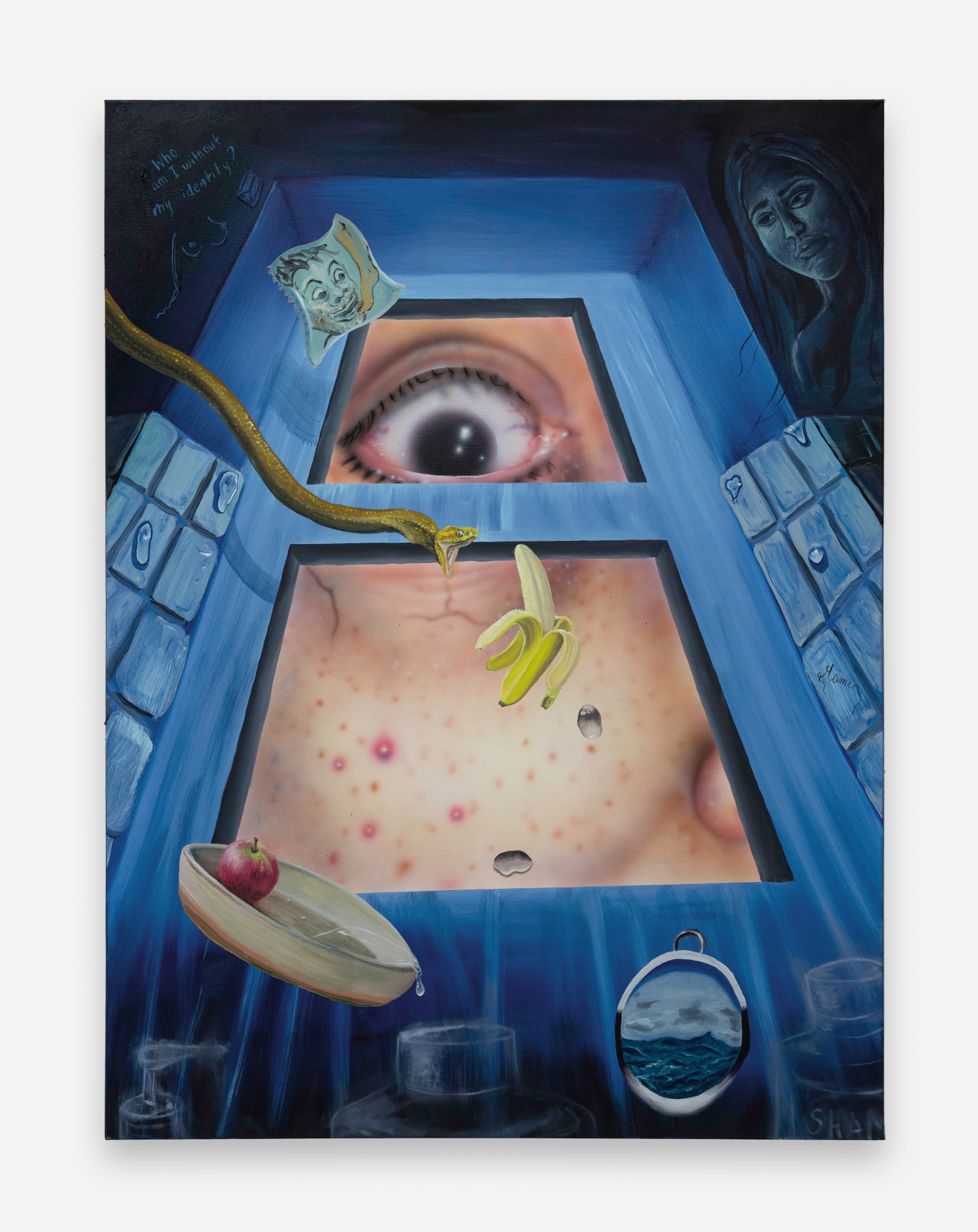 “My work takes a lot from surrealism, aesthetically, but I don’t follow the same laws of chance,” she continues. “The things that I talk about in my work are trauma, womanhood, gender roles – I’m a young artist, a woman of colour working today – so I take from my own experience.” Employing different materials and techniques including pastels, paints and airbrush, Larissa’s work draws on the shared worries of her peers and echoes a common condition of dissatisfaction. In the artwork “Distracted”, she uses a fly, frustratingly perched on a woman’s face, to represent the wider interruptions to her world, while in “Obsessed with everything” we see a woman’s mascaraed eye and stressed out skin looking in through a window onto various anxiety-inducing images; the phrase ‘who am I without my identity?’ hovers over the scene in the right hand corner.
