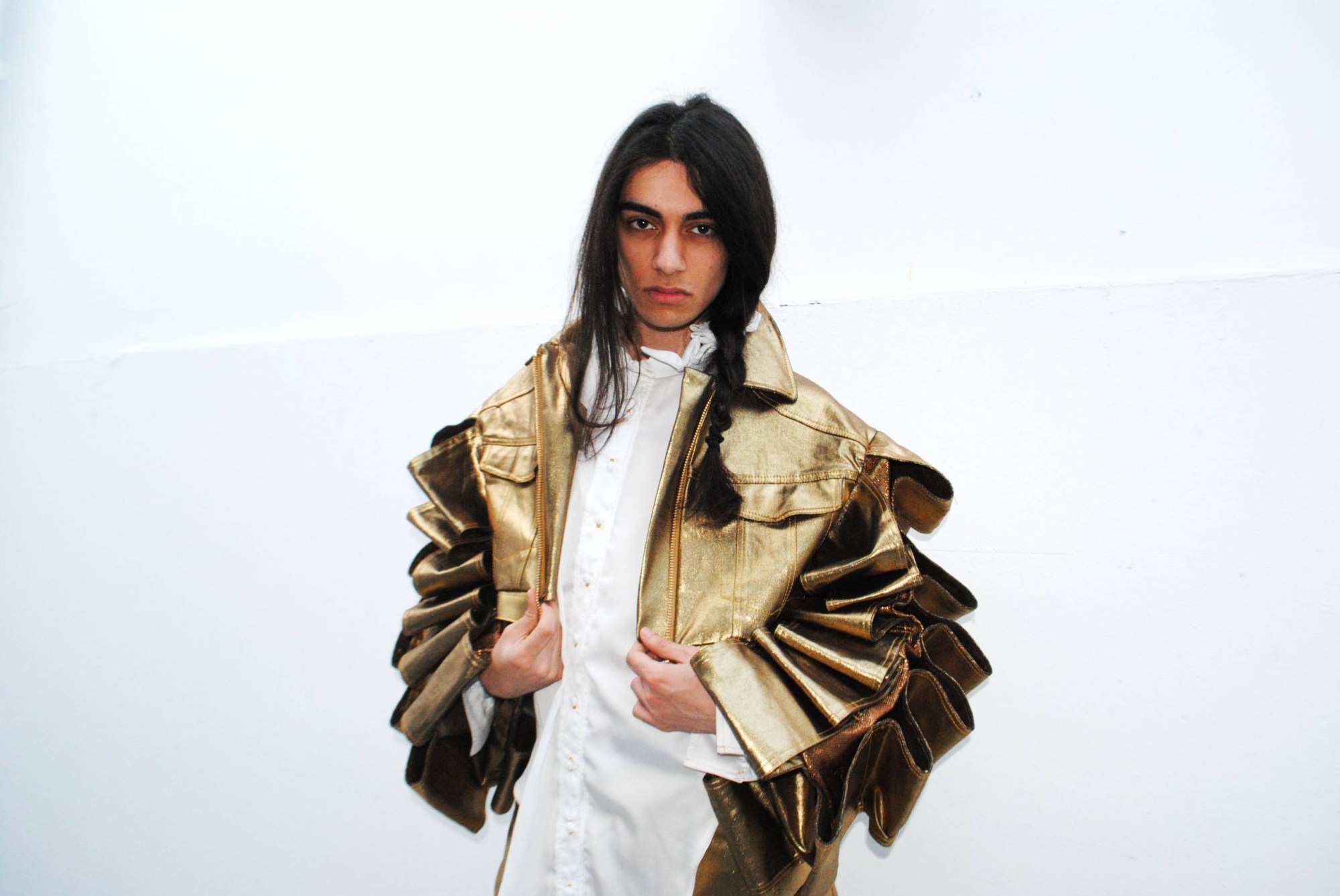 All Walks’ Debra Bourne says, “We loved Nina’s ideology and approach. Taking references from Pre-Raphaelite depictions of femininity and juxtaposing them with influences from 90s male, hip hop fashion, her gender-conscious garments are beautifully crafted, resplendent in gold leather and full of sassy swagger.”