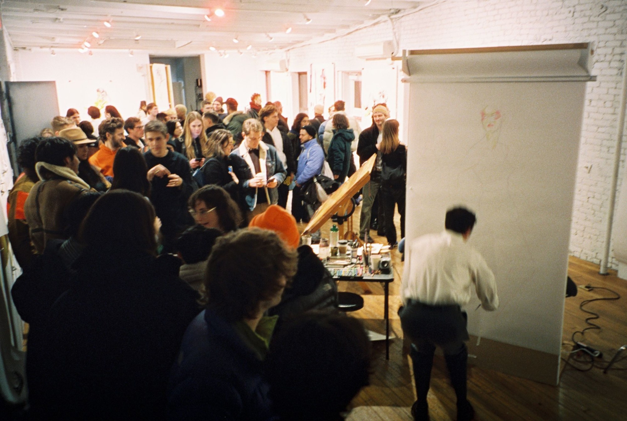 Drake Carr is taking a well-earned breather. For the past two weeks, the New York-based artist has been hosting live portrait sessions as part of his residency at New York Life Gallery. The Chinatown space, opened by photographer Ethan James Green last year, has served as both a studio for Drake’s sessions and a venue for the resulting exhibition, Walk-ins. Despite conceiving the idea for the show together with Ethan, Drake never intended to test his endurance levels so thoroughly, often completing between four or five portraits a day and sometimes with as little as 20 minutes break in between.