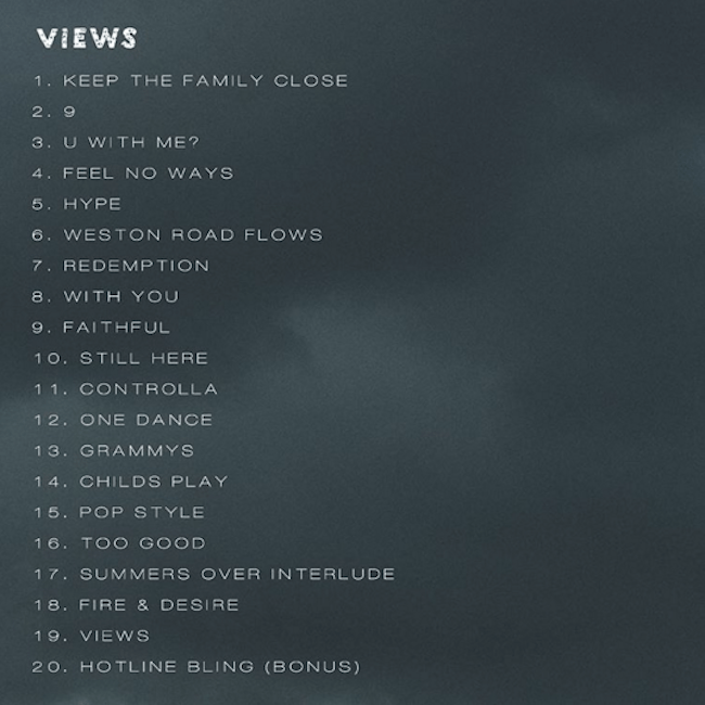 The most memed album of 2016 — or at least of this week — finally has an official tracklist. Two days after revealing the official artwork for his highly anticipated new release, depicting a tiny Drake looking out from Toronto’s iconic CN Tower, the rapper has Instagrammed a list of all 20(!) tracks featured on the project. Drake also seems to have had a change of mind about the album’s title, which is no longer Views From the 6. A Universal representative confirmed the title is now simply VIEWS.