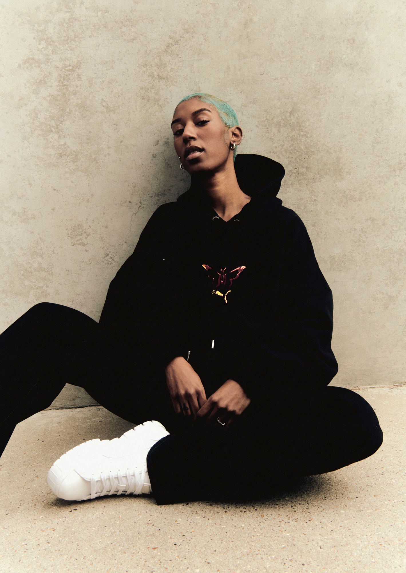 The limited edition capsule features the butterfly as its central theme, appearing as an iridescent, Y2K inspired motif on baby tees and hoodies in simple black and white, allowing it to really pop. For the sneakerheads, launching today there’s also the new Puma Mayze, an all-blacked leather edition of the iconic sportswear brand’s classic platform trainer. The line is a melting pot of influences; a little bit goth, a little bit clubwear, a dash of the 90s, and a pinch of the poppy purply neon iridescence that Dua is so associated with. And this is just the beginning — after the release of the capsule collection today, a larger Flutur collection will drop in the first trimester of 2022.