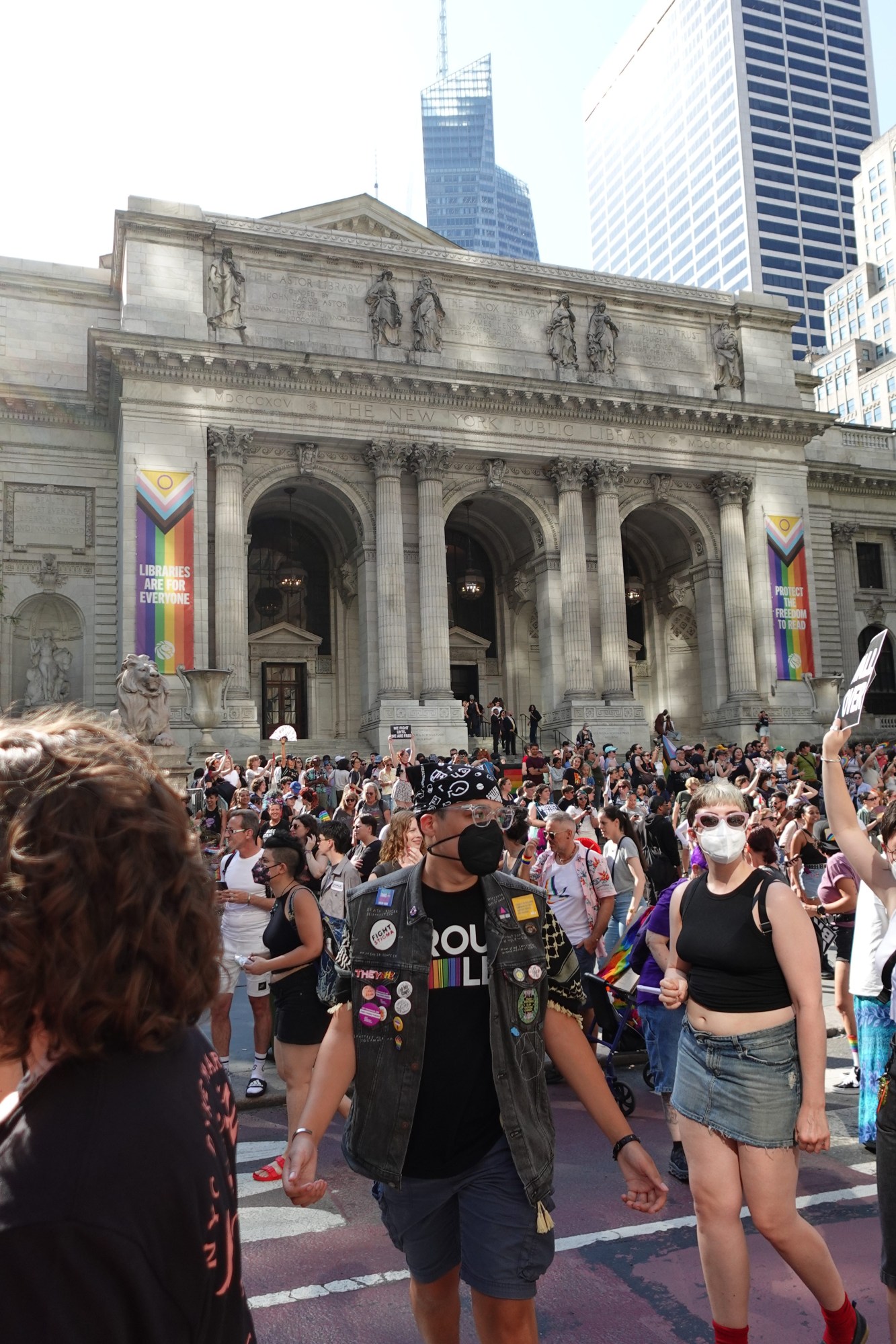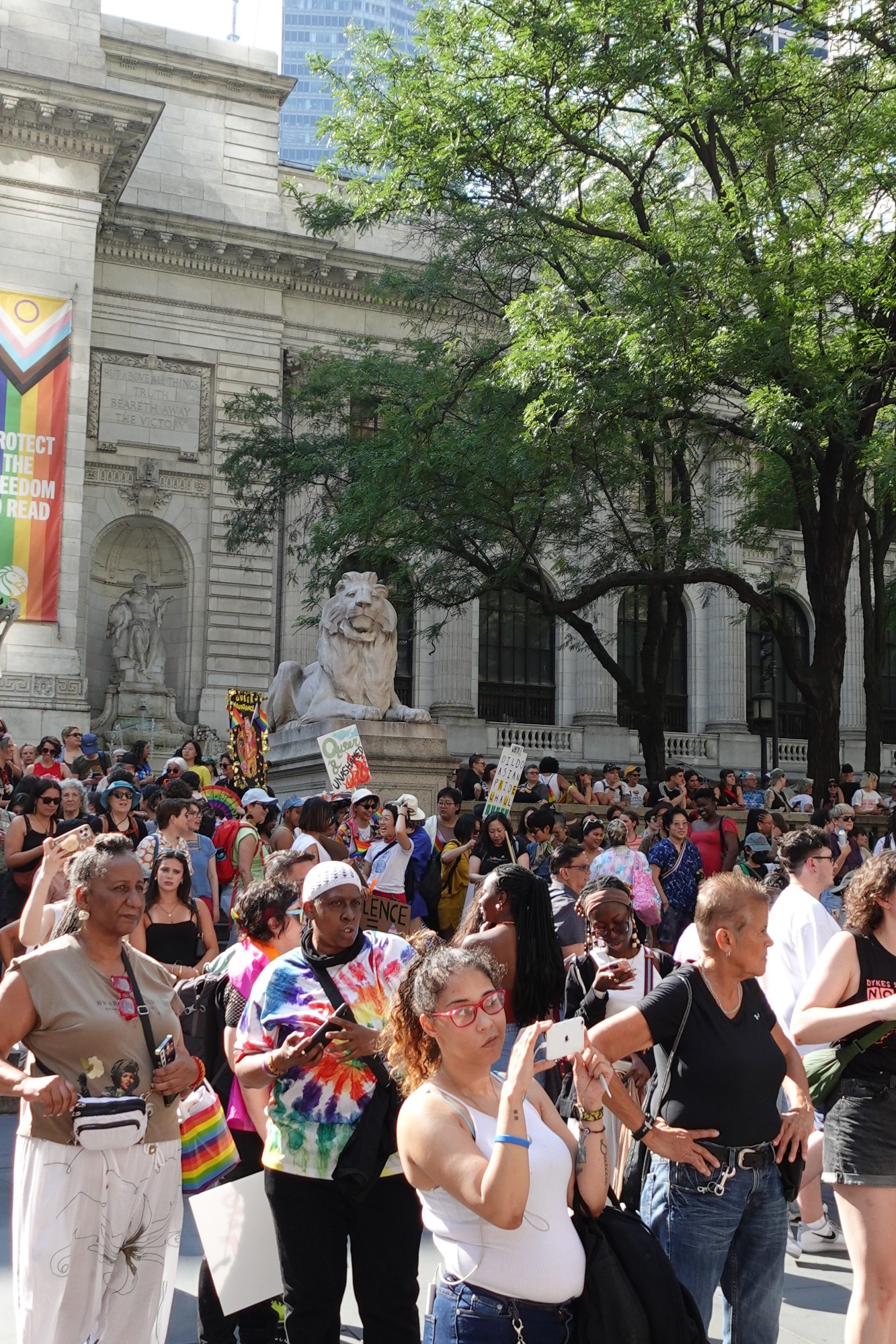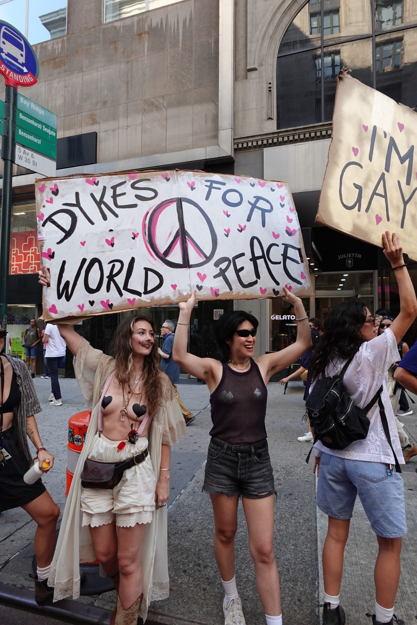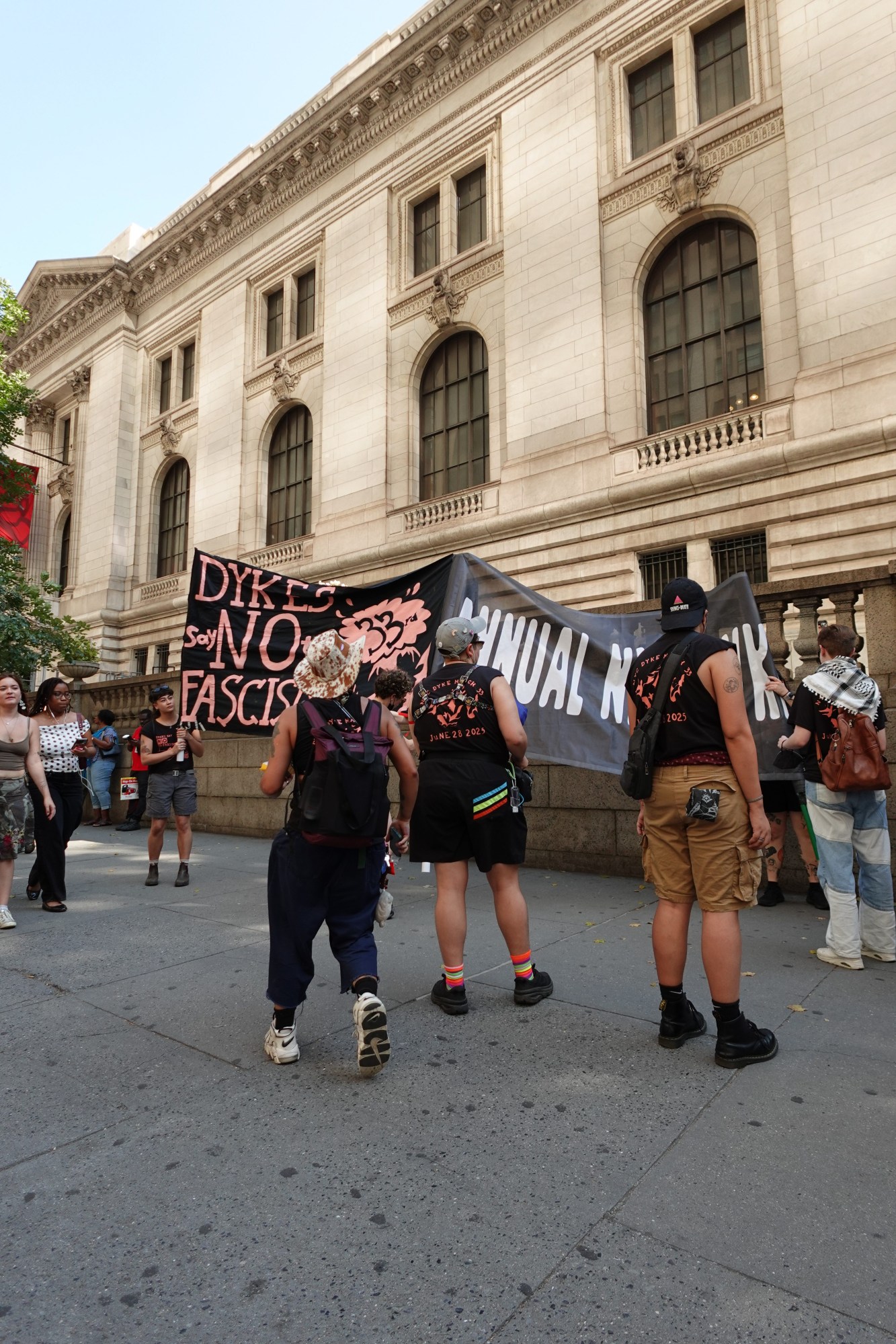 As I make my way to Bryant Park, I pass gaggles of dykes seemingly ready to take over the uptown F train. I get compliments on my “DYKES 4 IMMIGRANT RIGHTS” shirt, and my friend lets me know she’s on her way with a text that plainly reads, “train FULL of dykes.” I’m buzzing, with Bikini Kill blaring in my ears.
