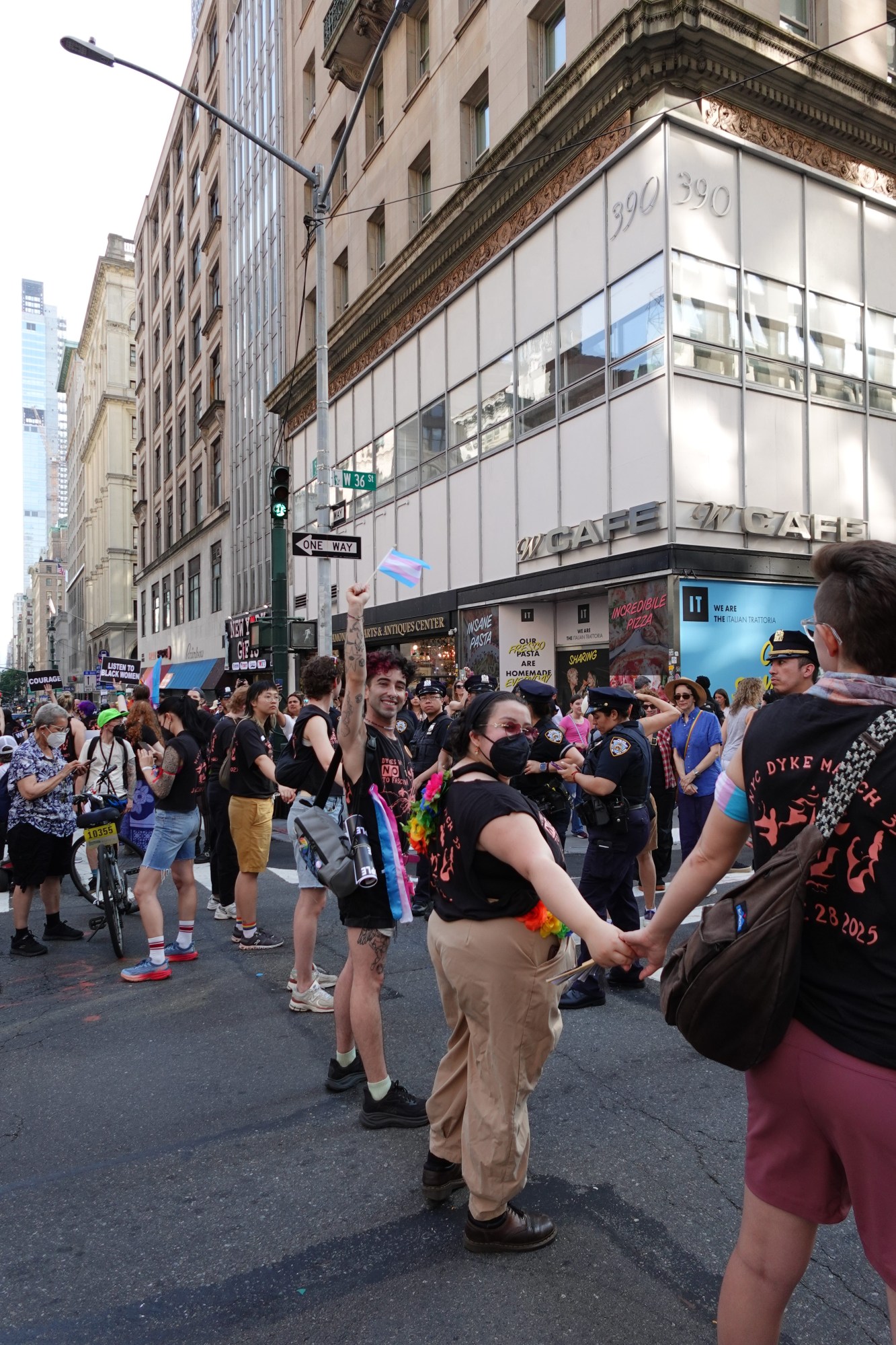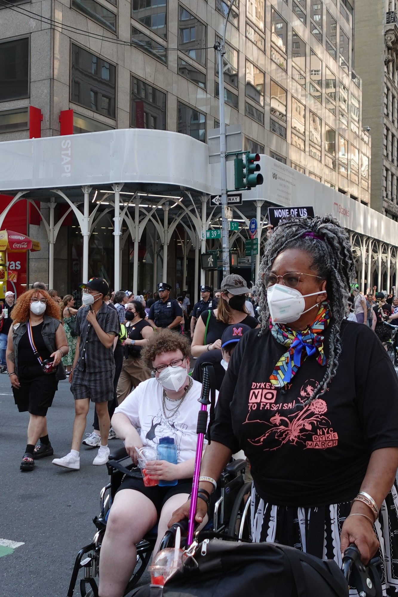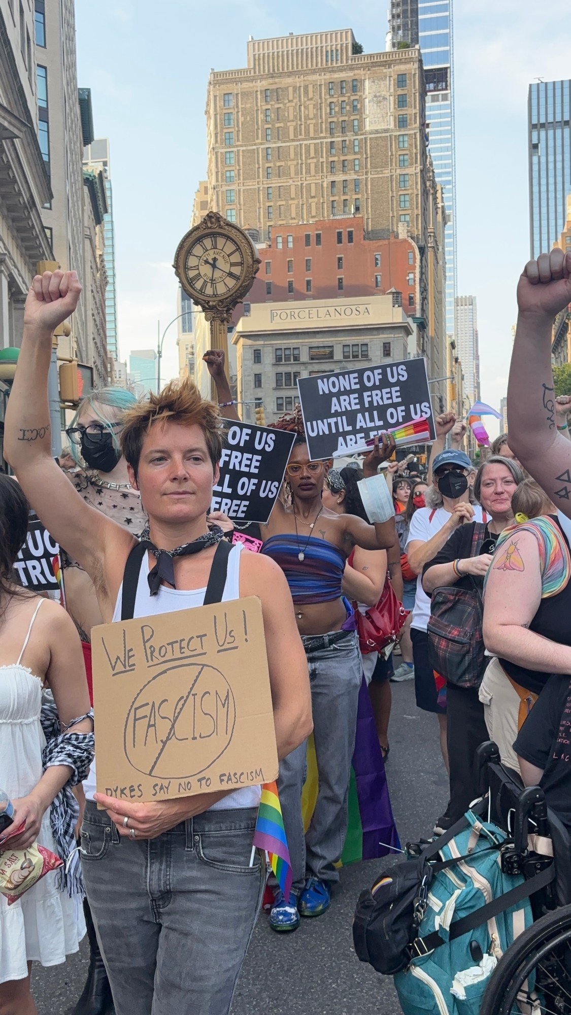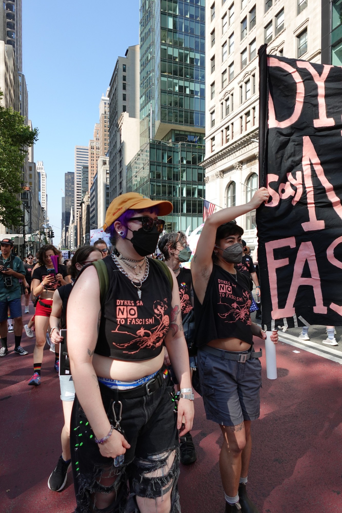 When I find my friend, she’s proudly wearing her “Revolution” button-down from Tobin Heath and Christen Press’ re-inc., which she has dubbed her “soccer lesbian shirt” (she’s the soccer gay to my basketball). We start to conspire about where to go as we get ready to march and ultimately follow a group of marshals to the mask-only (alternatively known as mask-for-mask) section at the front of the pack. We begin our two-mile procession from Bryant Park to Washington Square Park just behind the banner, which is emblazoned with this year’s art and theme: “Dykes Say No to Fascism.”