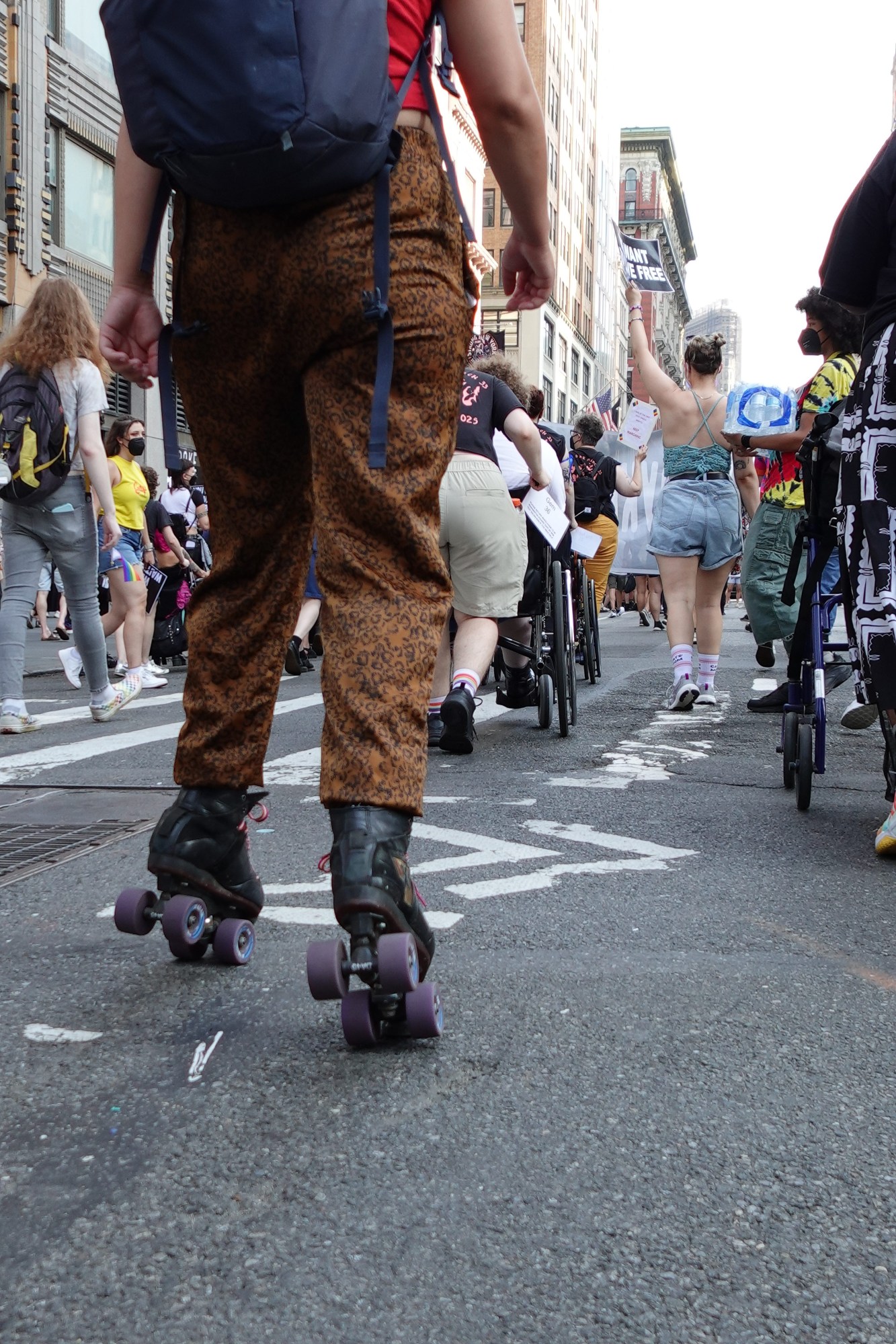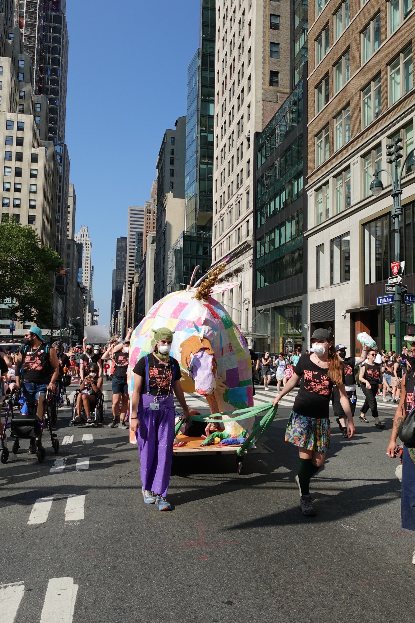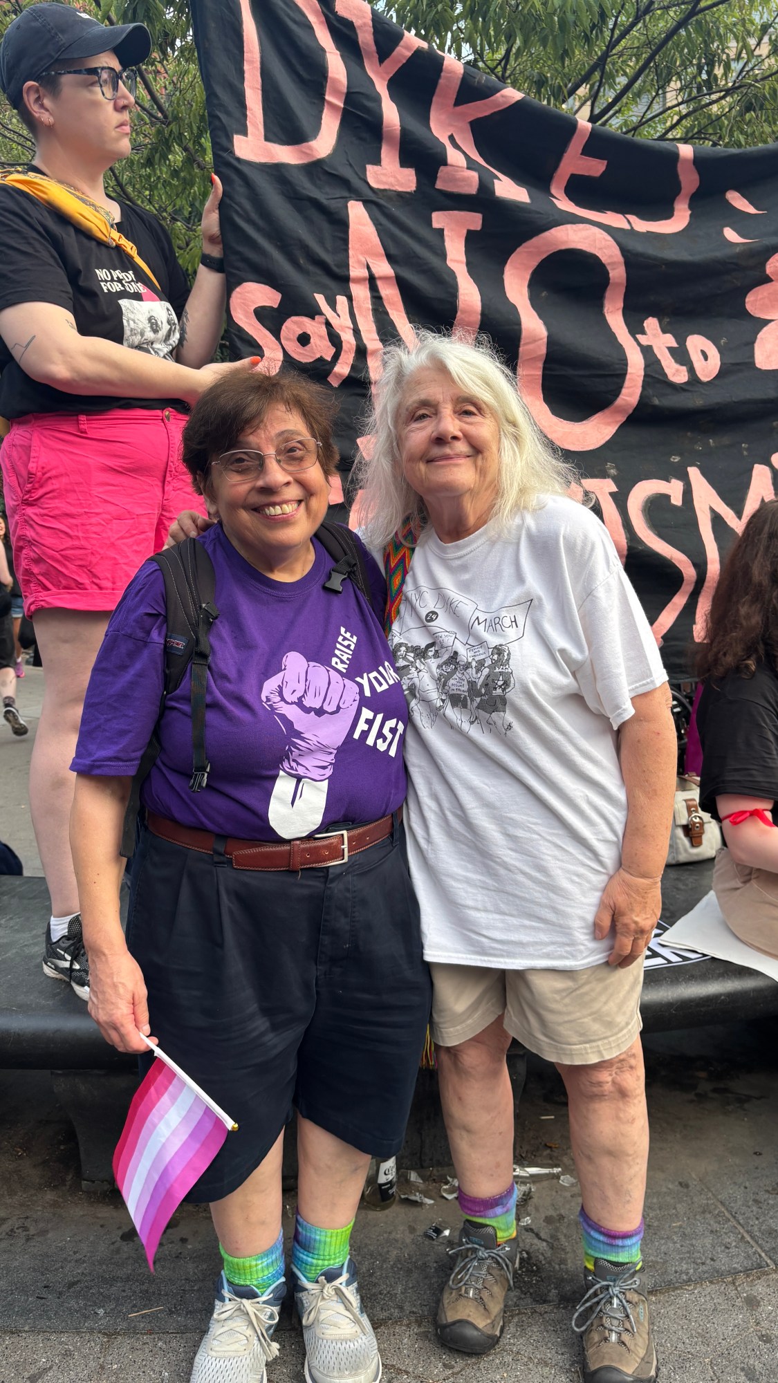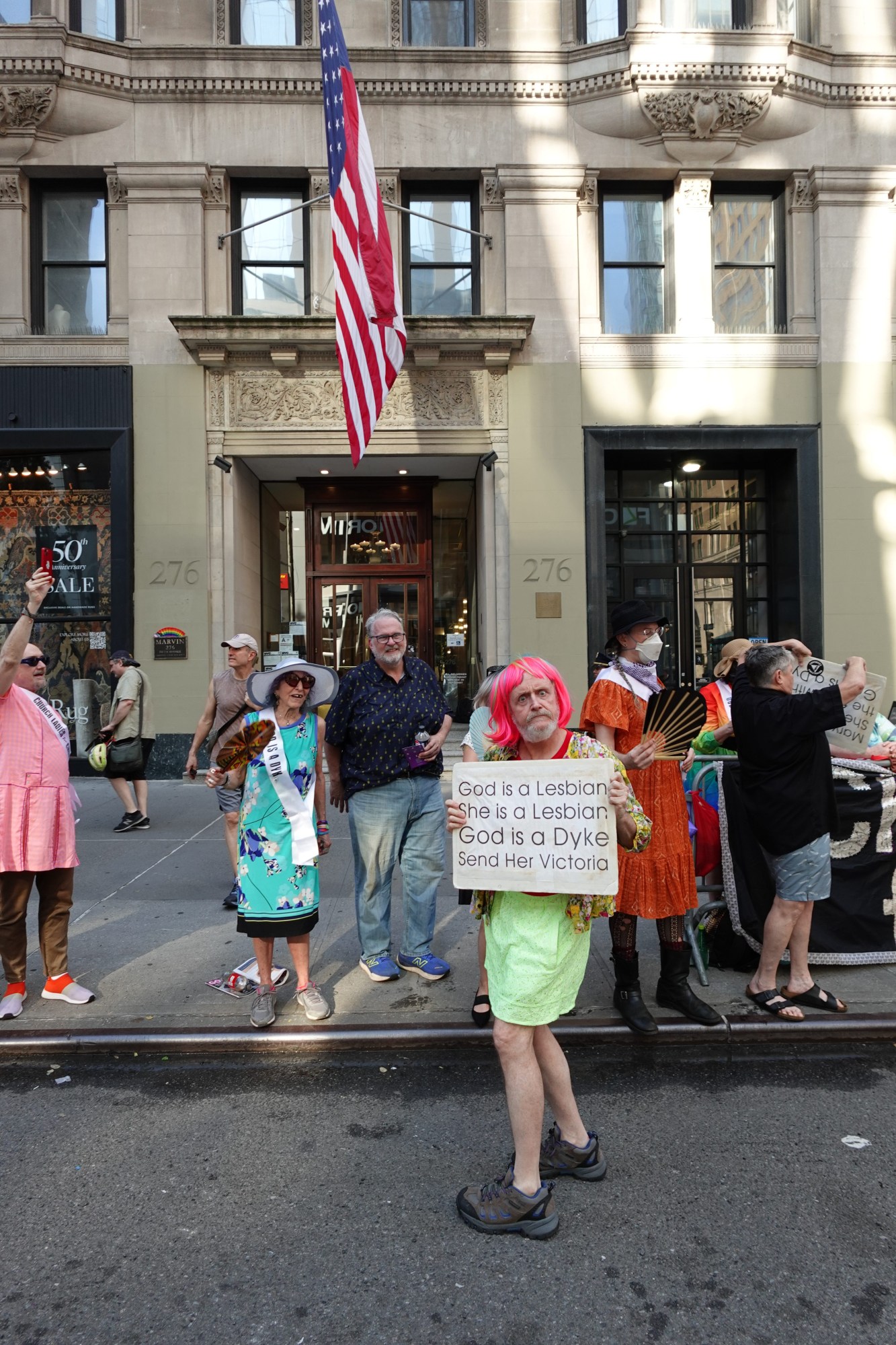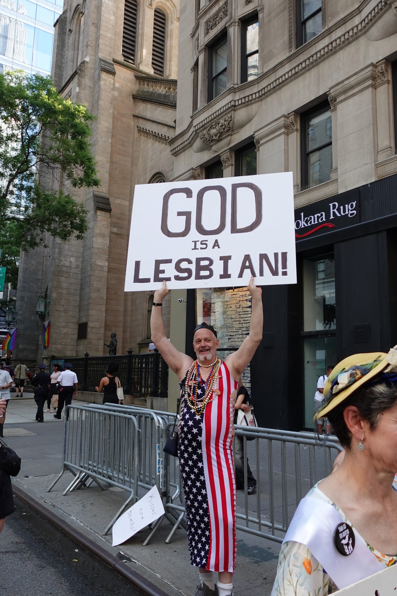 At every corner, we are cheered on by masses of people watching and supporting the March from the sidewalk. We stop at a “water 4 dykes” sign and eagerly accept the free water that’s offered to us as we continue walking (and sweating) in the heat. We encounter the Church Ladies for Choice, who proudly sing their “her, not hymn,” “God is a Lesbian,” as we pass (my personal favorite lyrics from their righteous tune are: “She’ll lick clit on / the floor with ya / God is a Dyke”). After two minutes of silence and stillness when we reach 24th Street, our energy is reinvigorated by the Queer Big Apple Corps marching band, who play from the sidewalk as we go by a few blocks later.