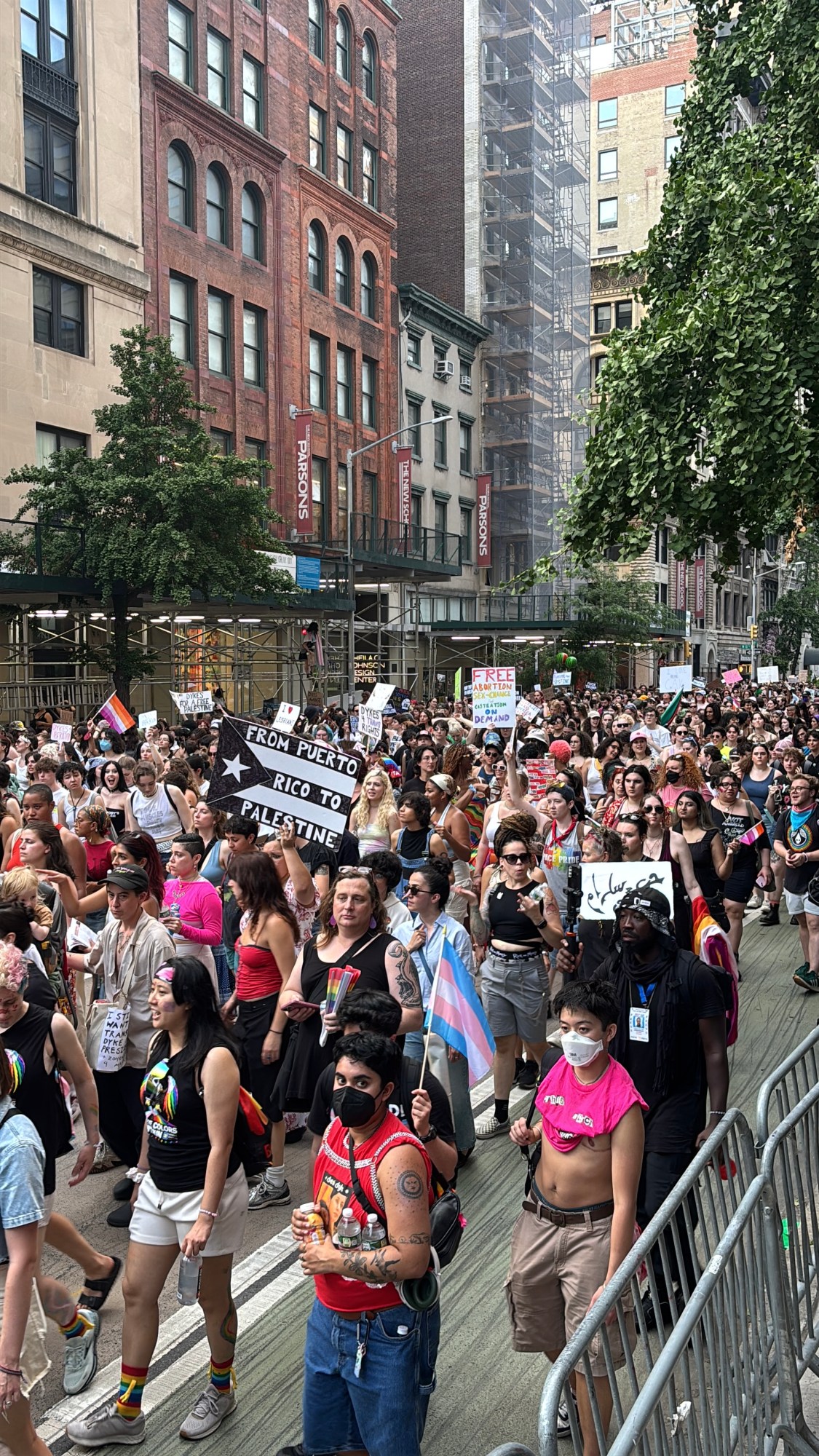 Almost as soon as we take off, the collective chants are underway. They range from a special rendition of “When the Saints Go Marching In,” sung as if we are one very large, gay choir, to calls for a free Palestine, an end to ICE deportations, and the defense of trans rights. There’s no doubt that all 30,000+ of us have varying political opinions, but we are united not just by identity, but by a shared belief in empathy, intersectionality, and the power of giving a shit.